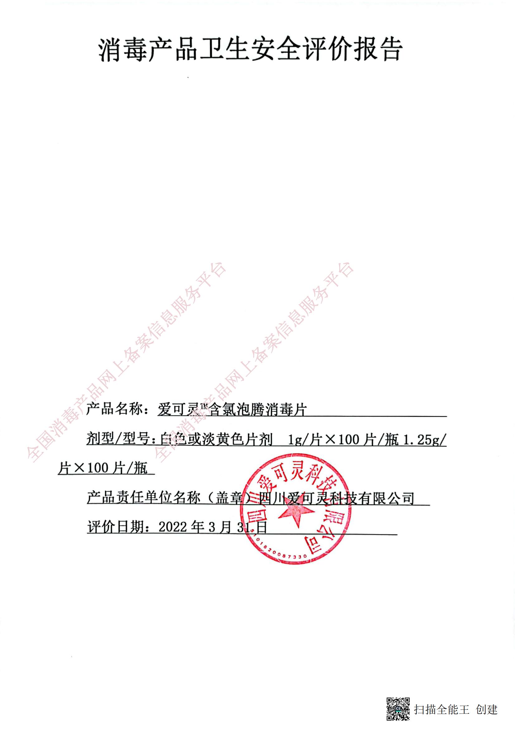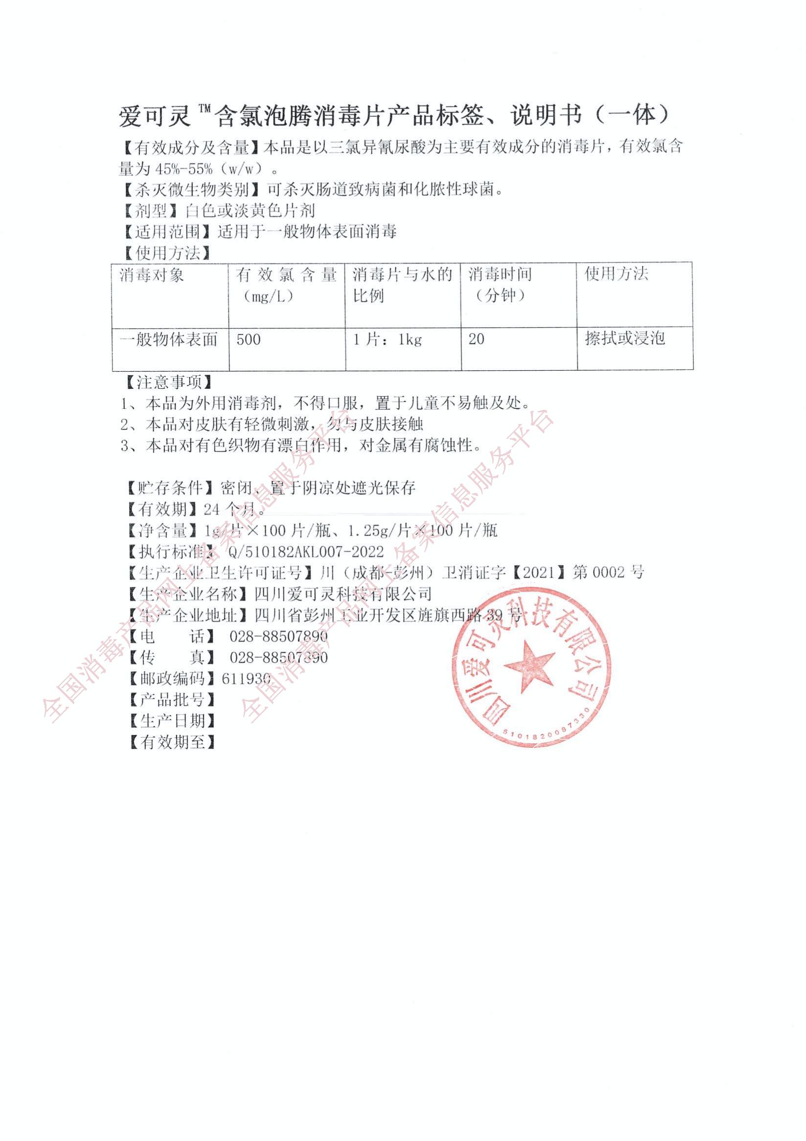 爱可灵 含氯泡腾消毒片 1g*100片/瓶(泡腾片)