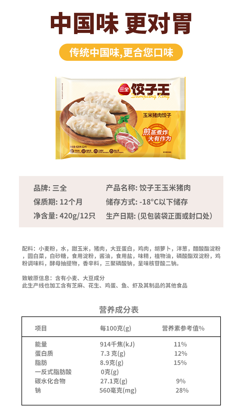 第二包半价三全饺子王玉米猪肉水饺(420g/包 12个)生产日期: 1月