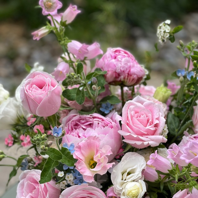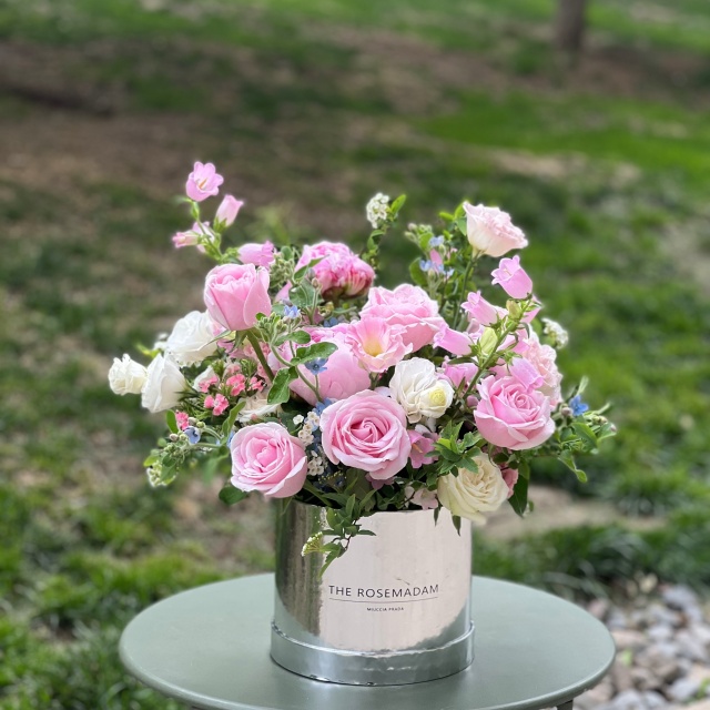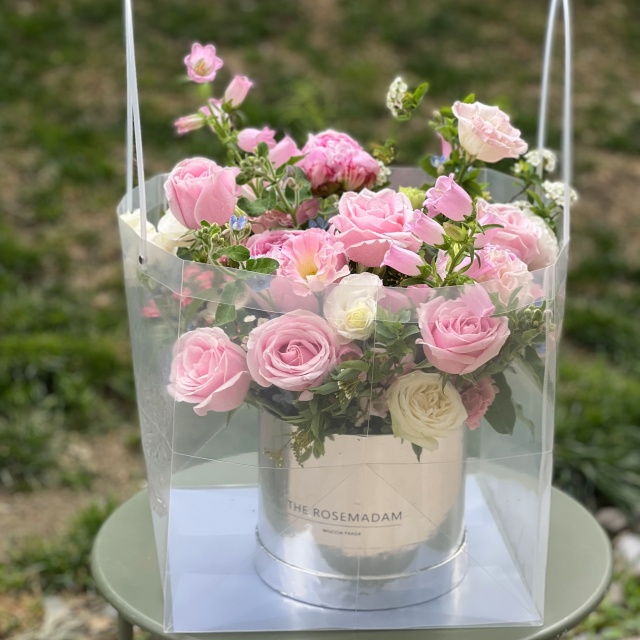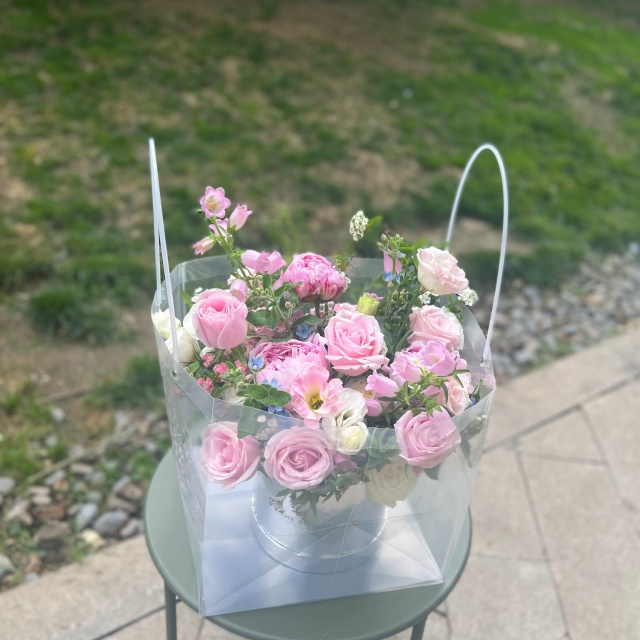 精选花材:粉色芍药3支,粉玫瑰12支,蓝星花,风铃草,洋桔梗等花材混搭,银色抱抱桶