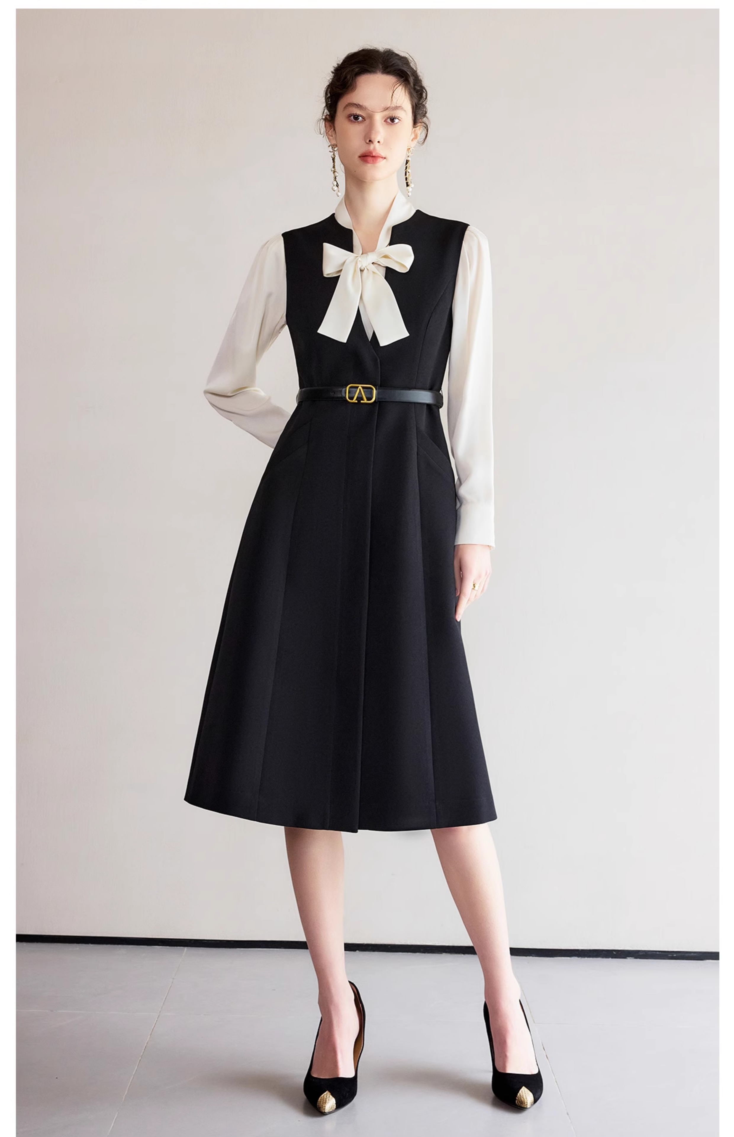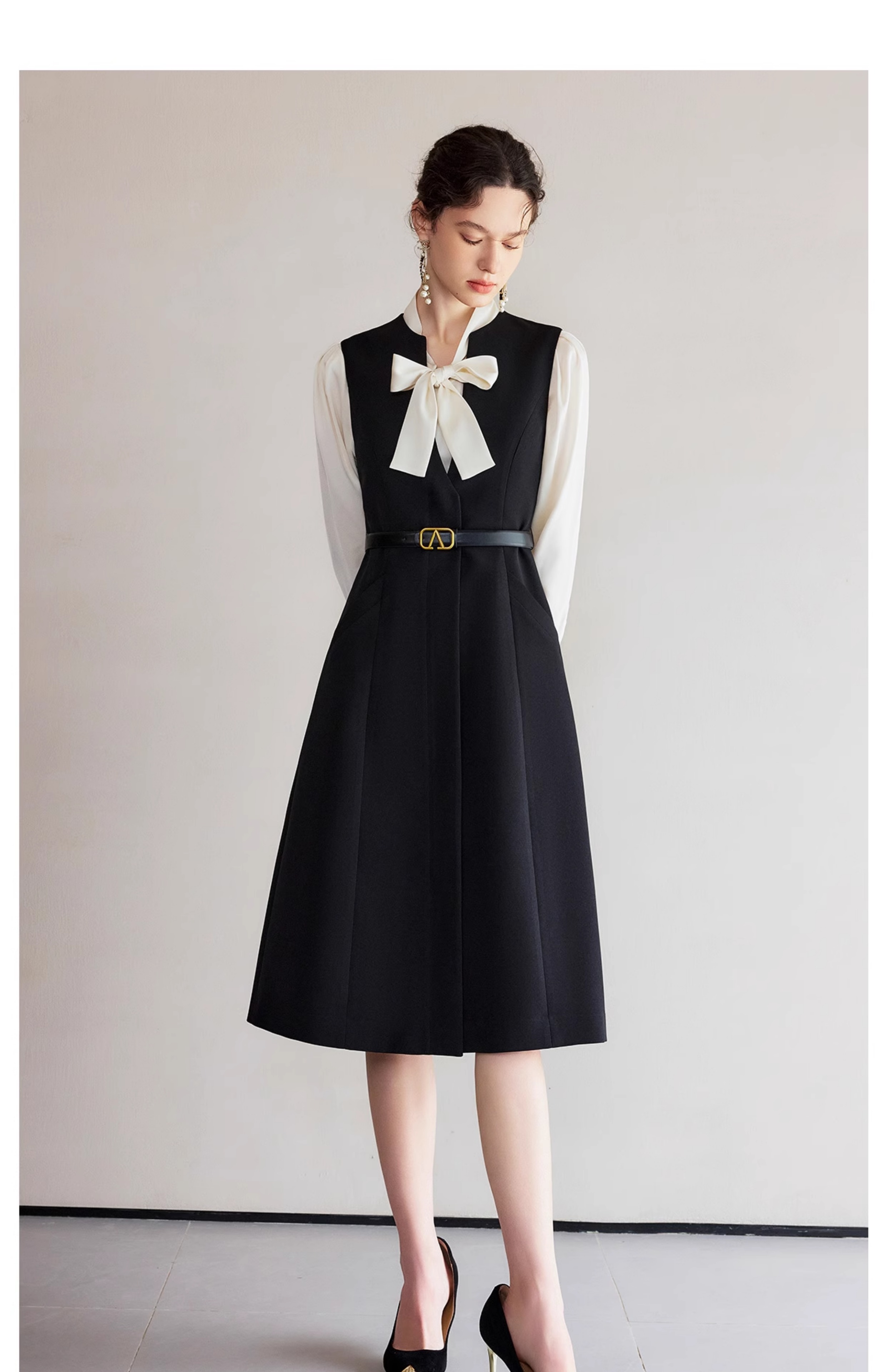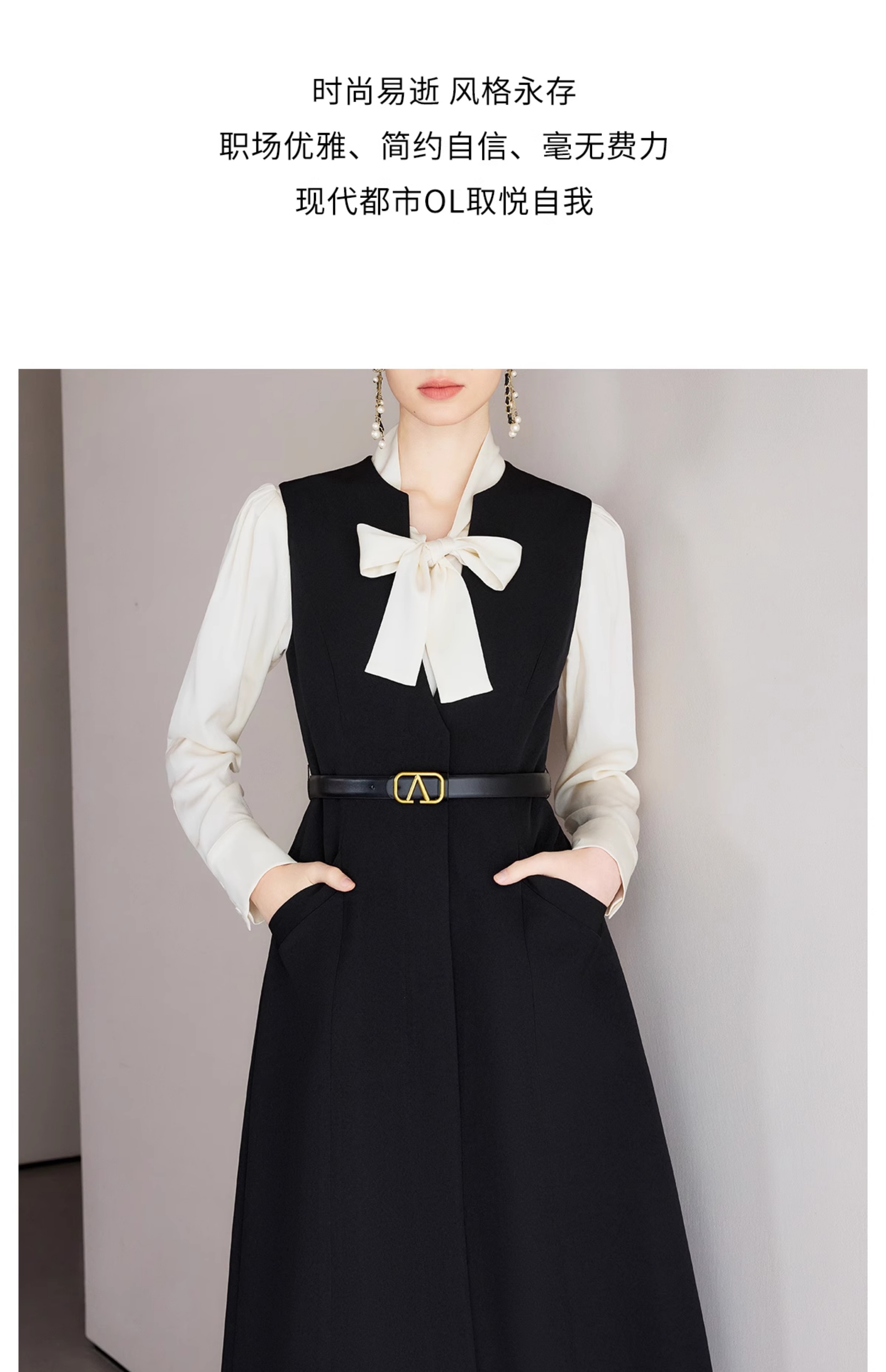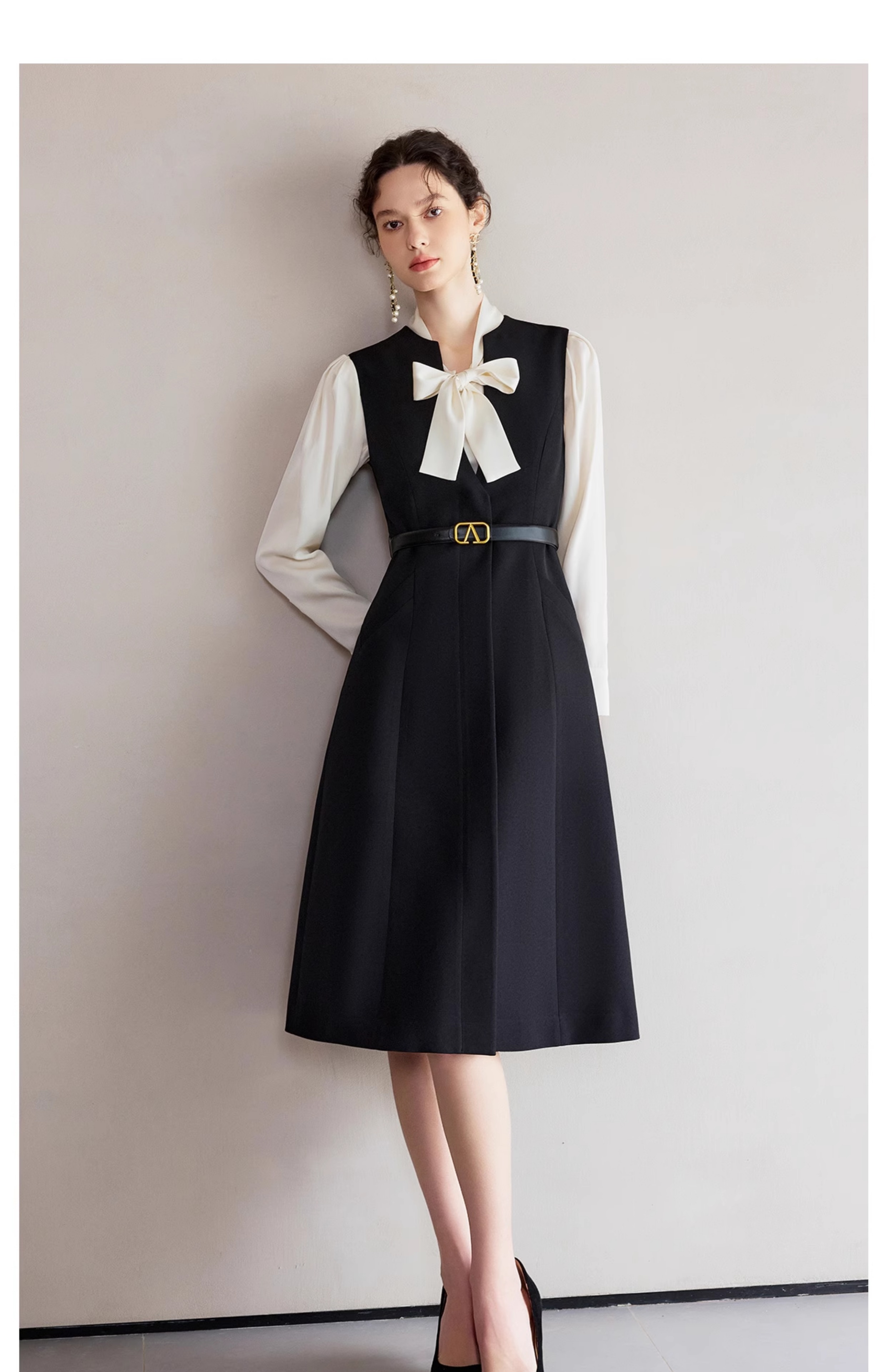 IWY/春季穿搭一整套新款香槟色蝴蝶结长袖衬衫法式黑色连衣裙B522+Q1261