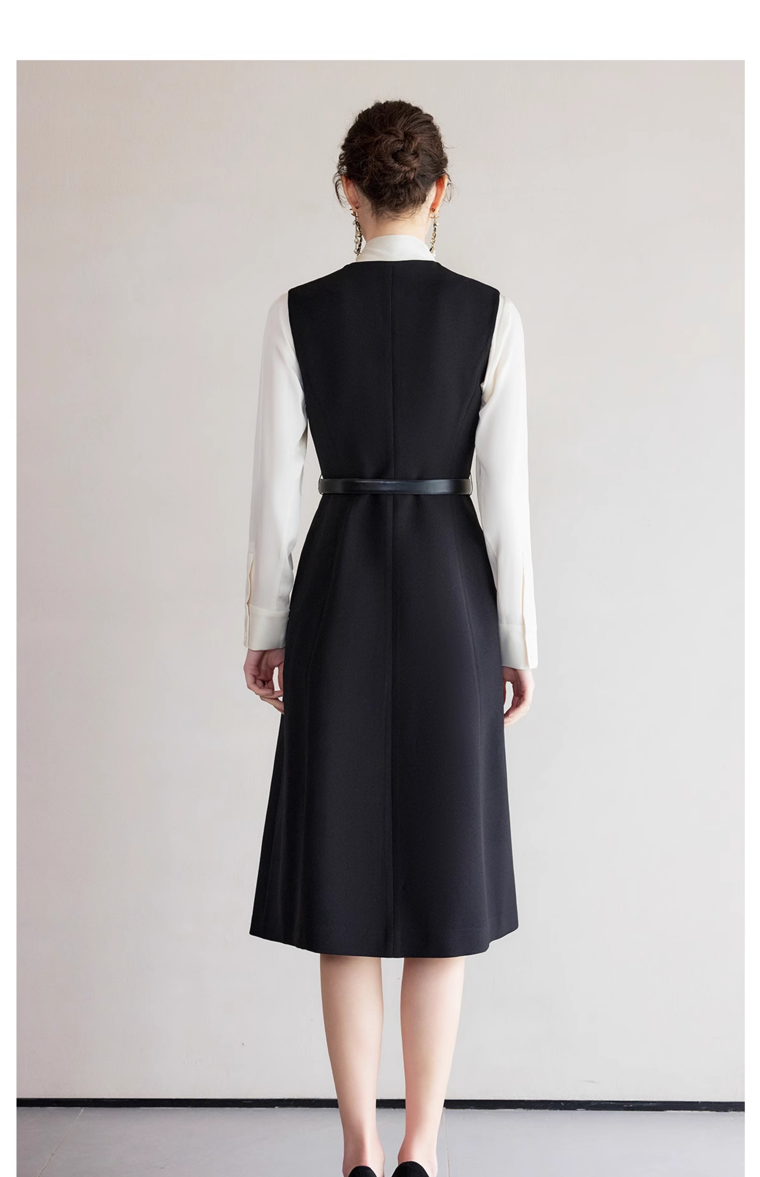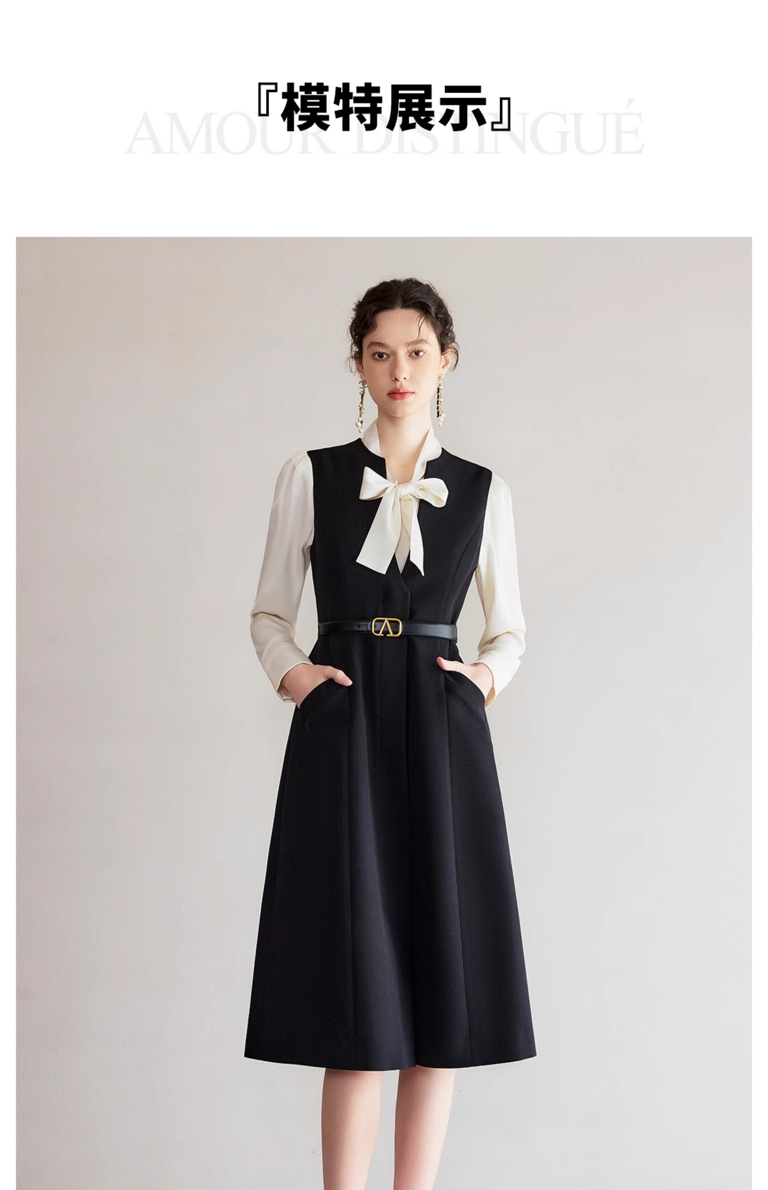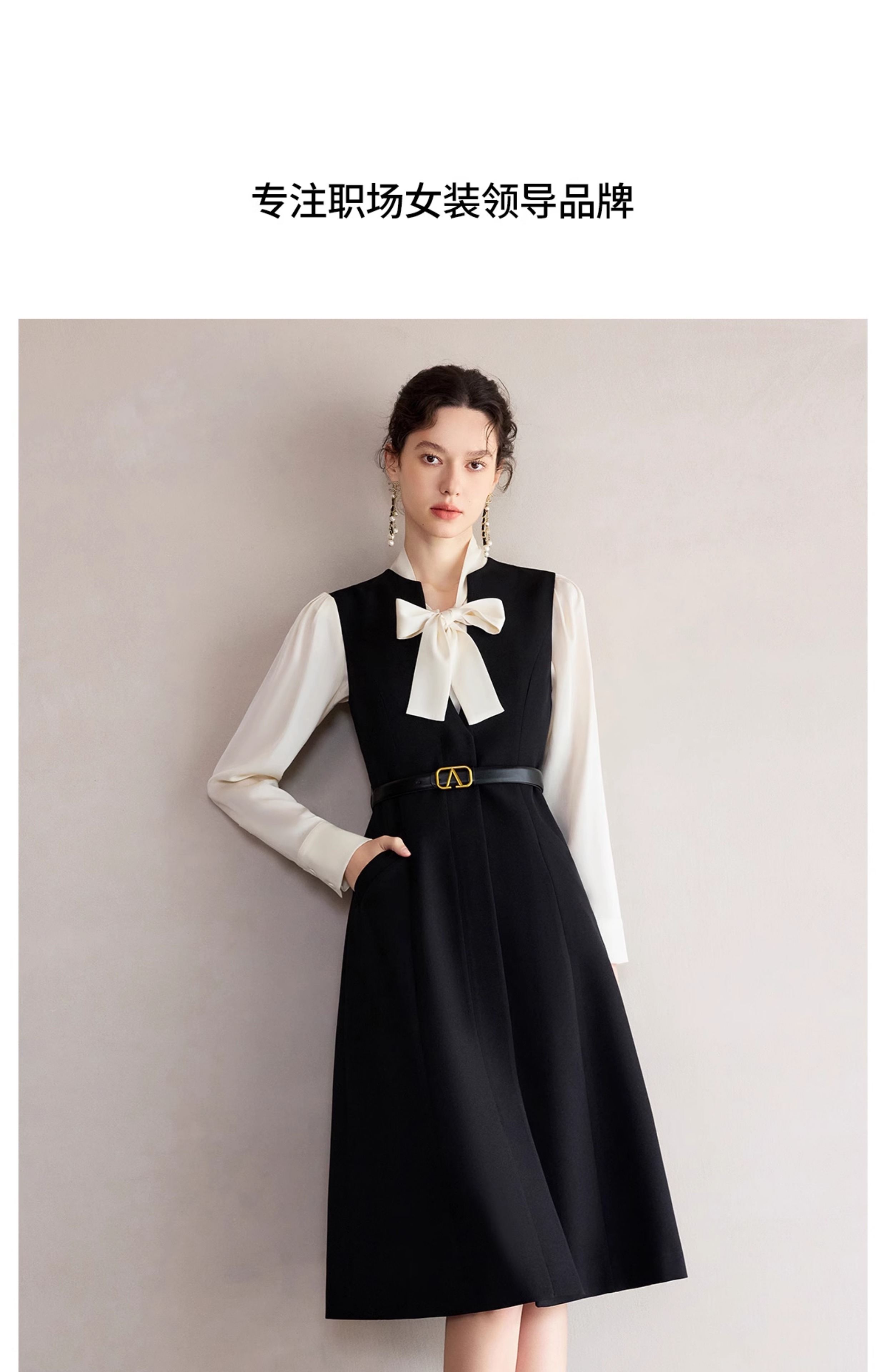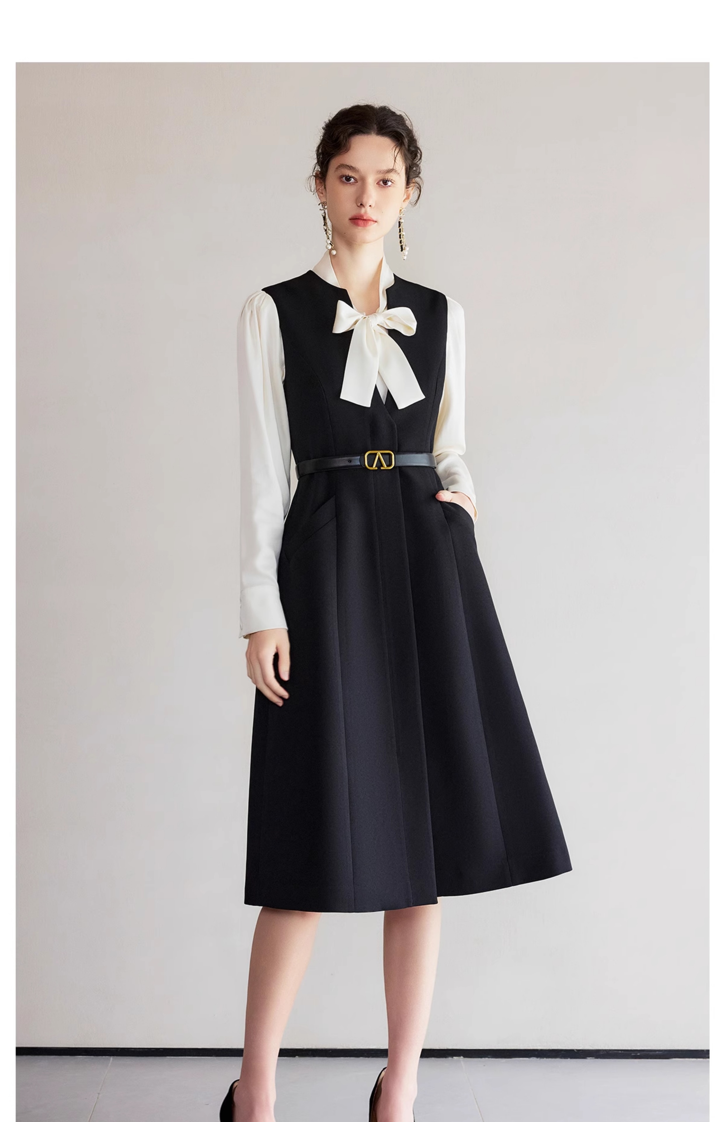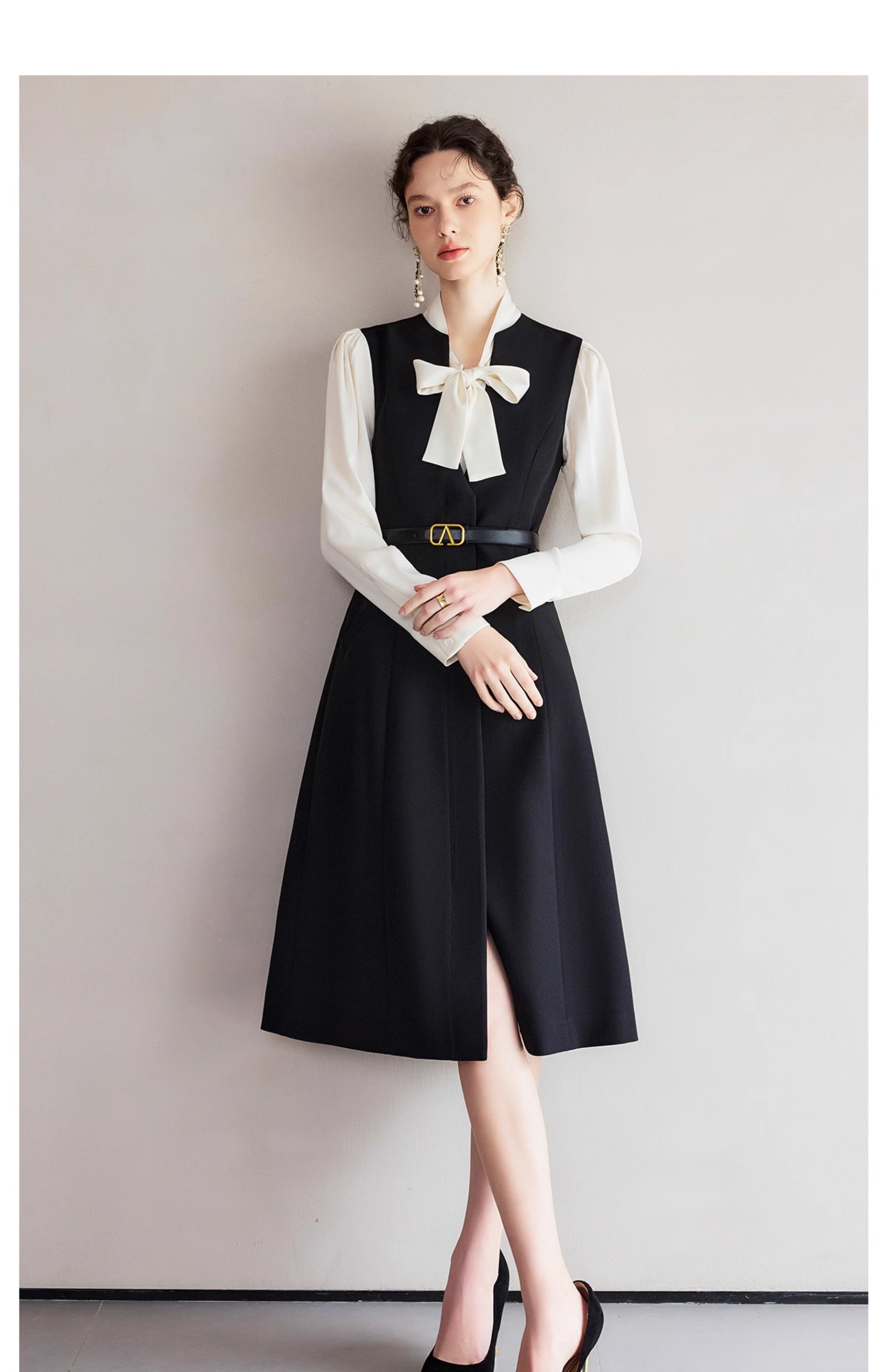 IWY/春季穿搭一整套新款香槟色蝴蝶结长袖衬衫法式黑色连衣裙B522+Q1261