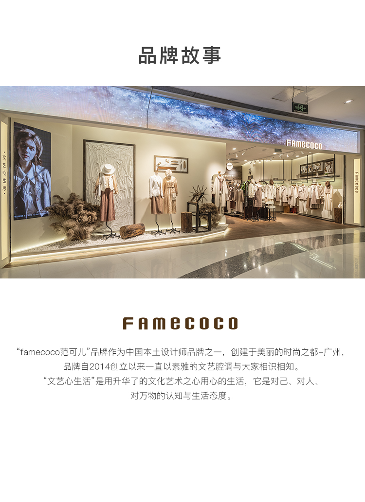 - Famecoco作为中国本土设计师品牌之一的她,创建于美丽的时尚花都广州,自2013年创立以来,一直致力于打造优雅、知性、文艺的穿着理念。