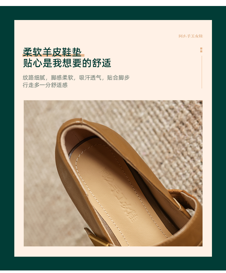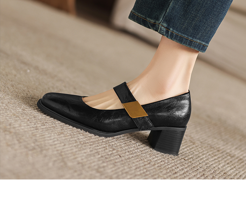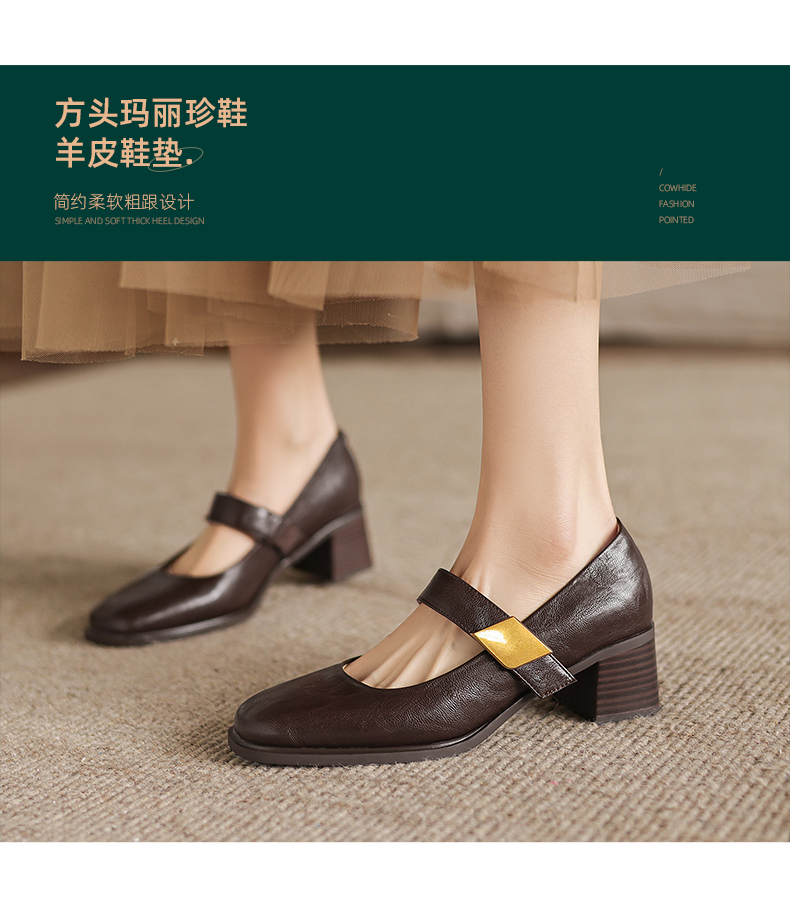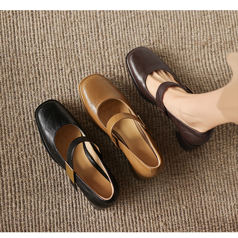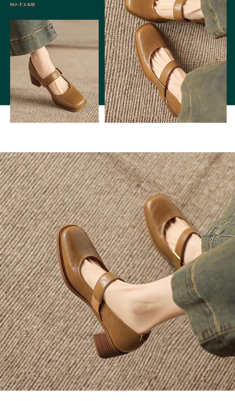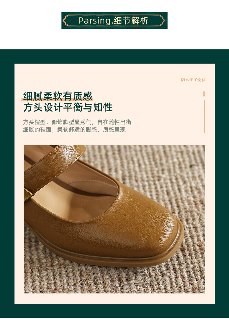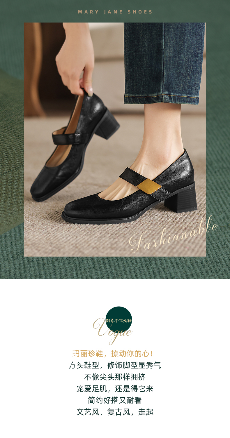 阿么手工女鞋复古粗跟一字带浅口单鞋春季新款真皮玛丽珍鞋女5CM