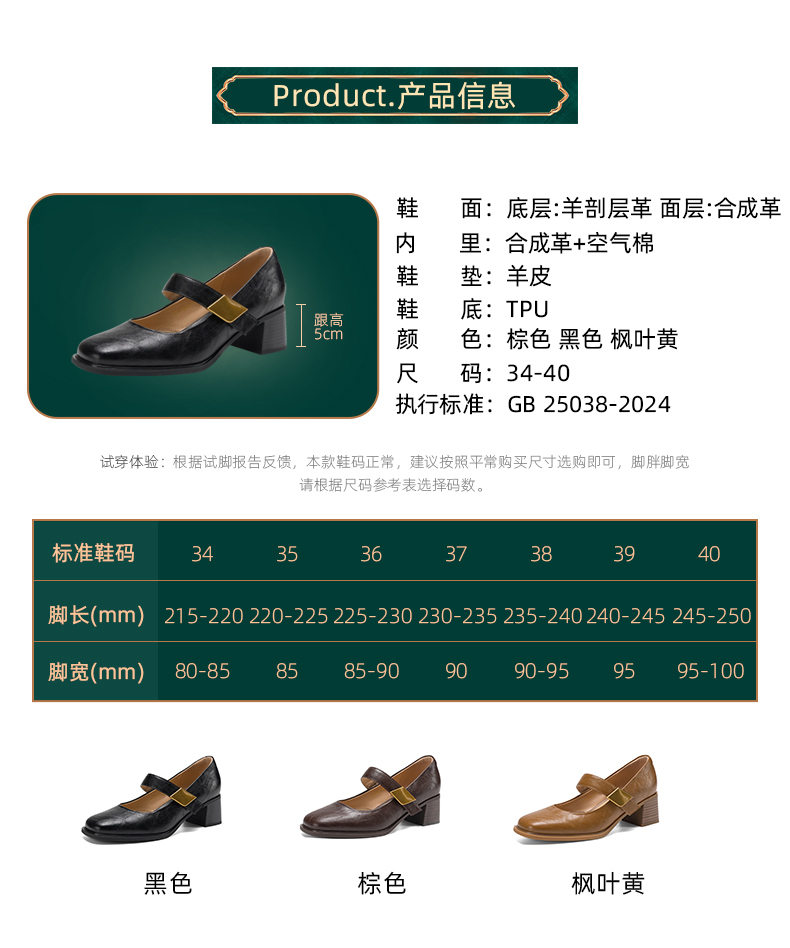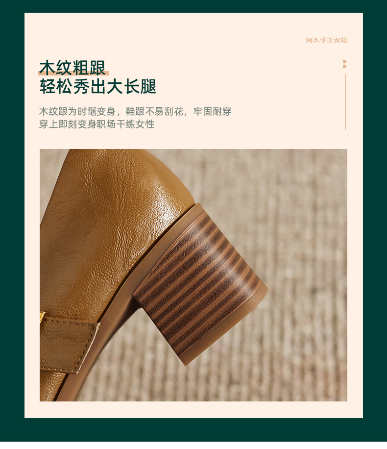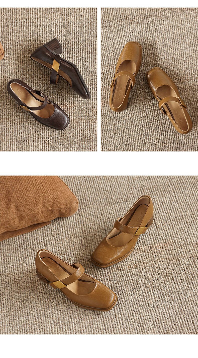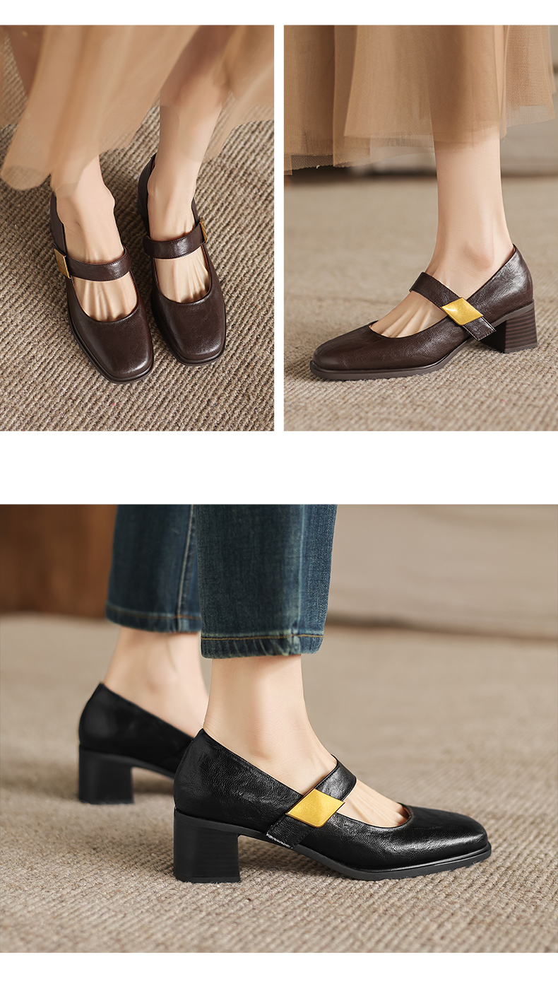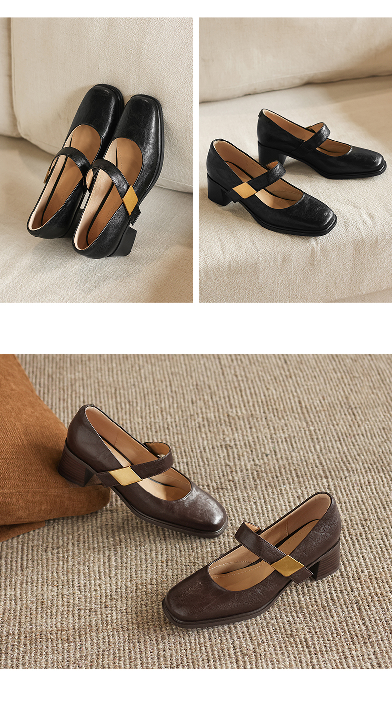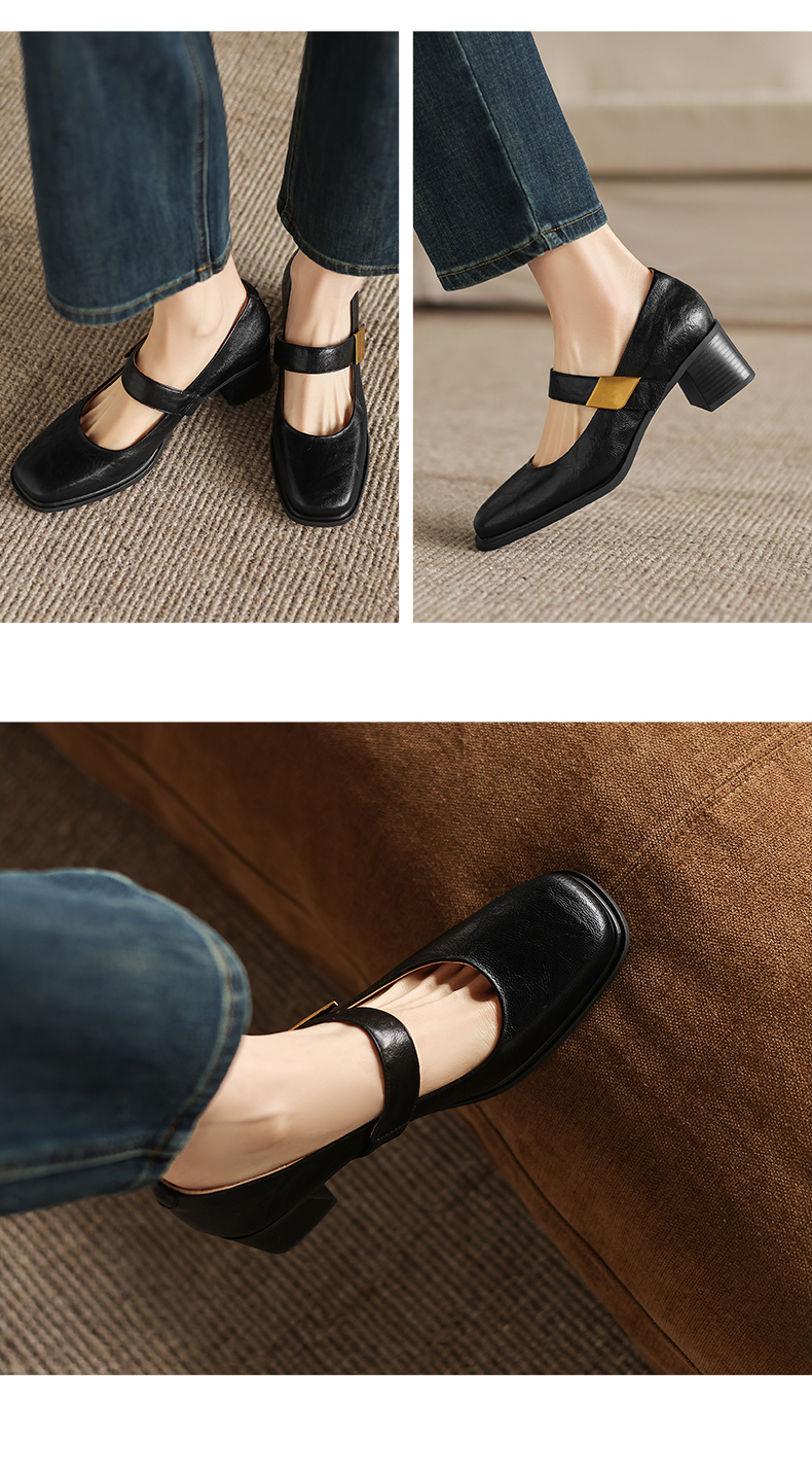 阿么手工女鞋复古粗跟一字带浅口单鞋春季新款真皮玛丽珍鞋女5CM