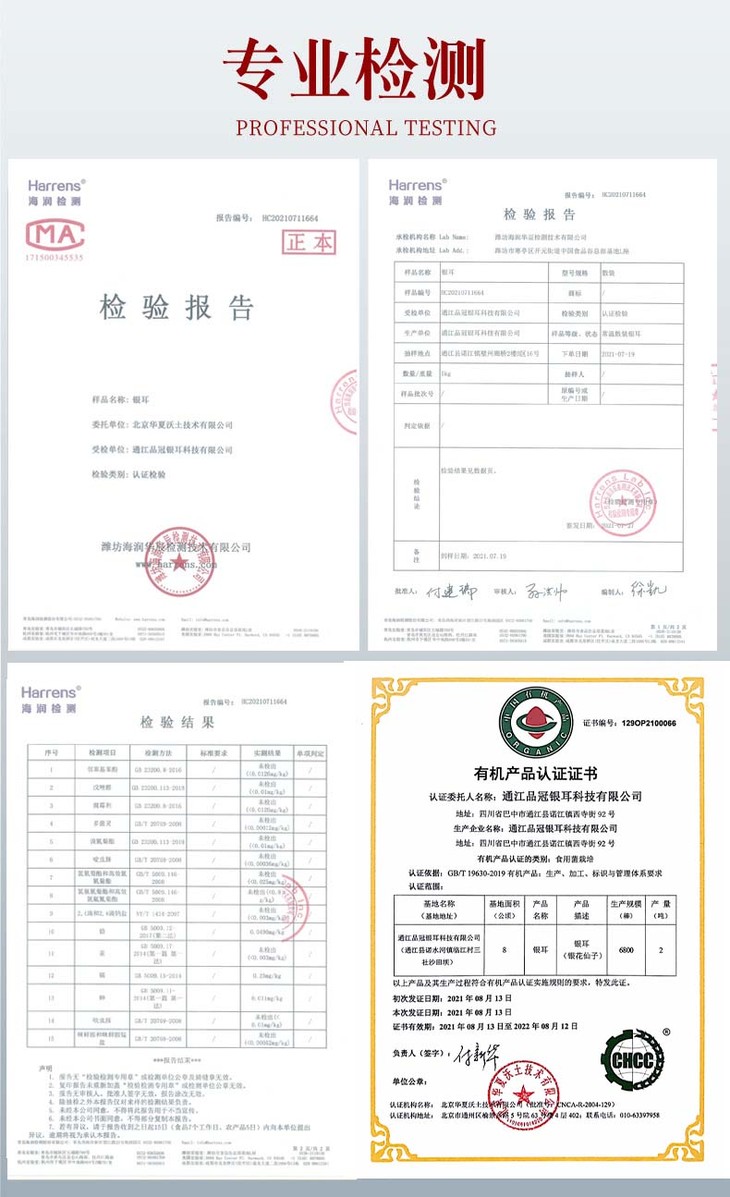 (五)顶级品质。我们与江油微生物研究院合作,采用电解水技术,不使用农药,从根本上解决了银耳病虫害防治难题,真正做到无污染、自然、健康、有机,已成功获得《有机产品认证证书》。