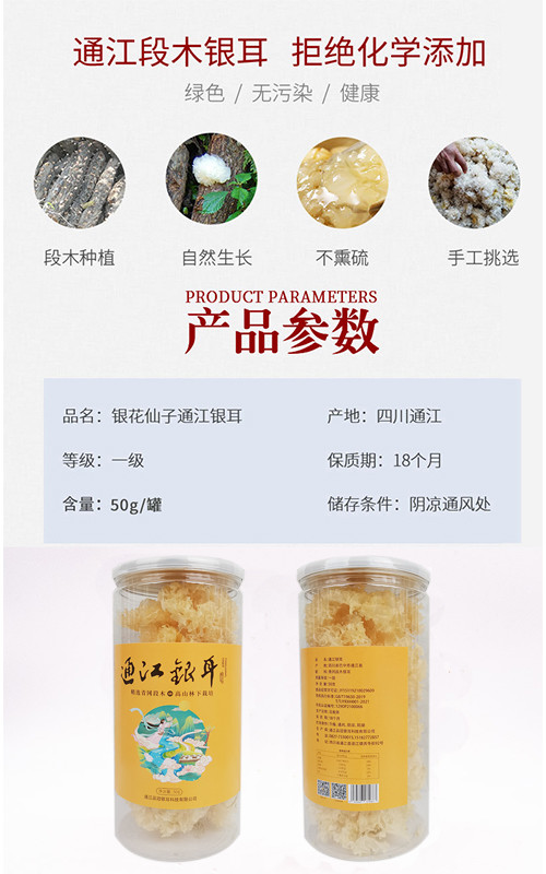 通江银耳朵型适中,耳片厚实,鲜品白如凝脂、晶莹剔透、有弹性,干品色泽米白、空松油润、有清香气,不易褐变,因其独特的区域生态环境、独特的大巴山青杠原料、独特的原生态段木栽培方法、独特的银耳文化传承,素有“耳中极品、菌中之冠”的美称