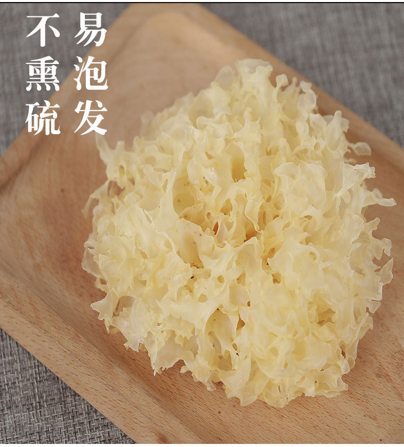 闻:在气味上,通江段木银耳闻起来有一股清香味,这是一种叫芳樟醇的物质在起作用,袋料银耳没香味。如有刺鼻的味道证明这种银耳是用硫磺熏制过了。