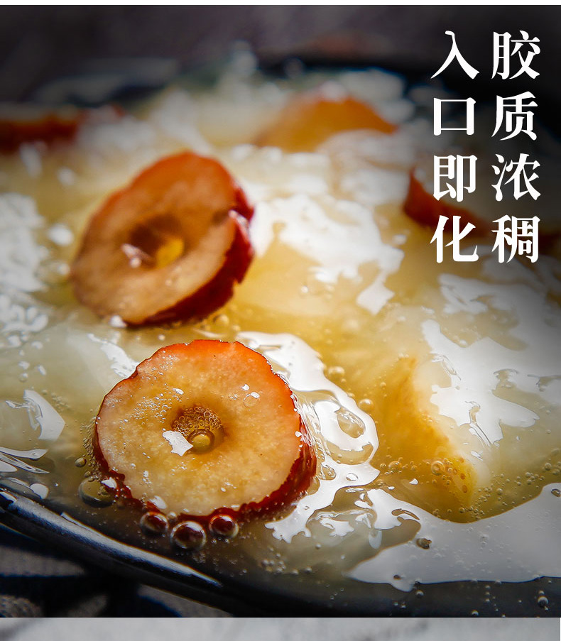 5)以上方法可以根据自己的口味和习惯添加适量冰糖、枸杞、大枣或者雪梨等水果类;配料可待银耳熬制好后加入再熬煮几分钟即可,但如莲子、山药等需要炖煮时间较长的,宜和银耳同时加入。忌糖人群可以在食用的时候加入适量蜂蜜。
