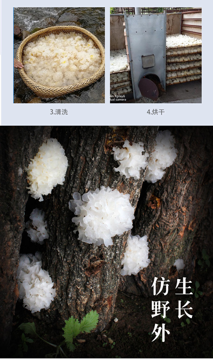 3.原生态的段木栽培方法:江银耳要经历“砍山—截段—架晒—钻孔—接种—发菌—排堂—管理—出耳—采耳—修剪—淘洗—烘干—分级”等众多环节