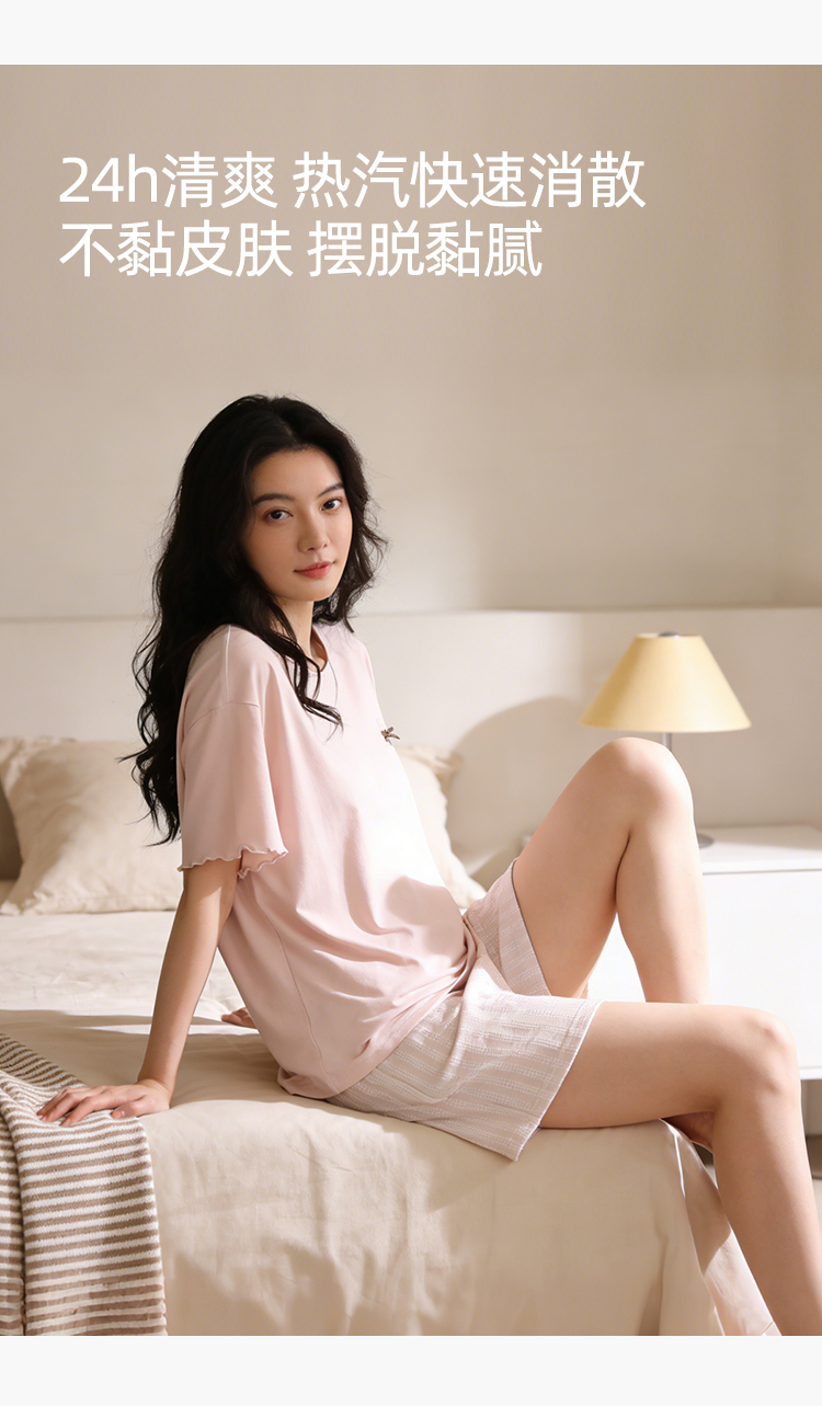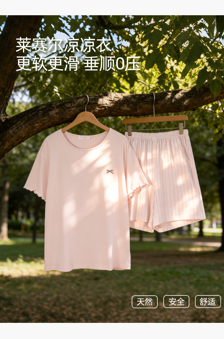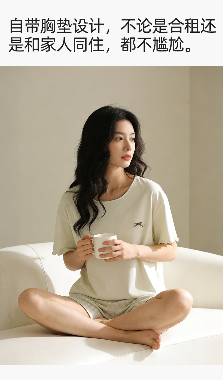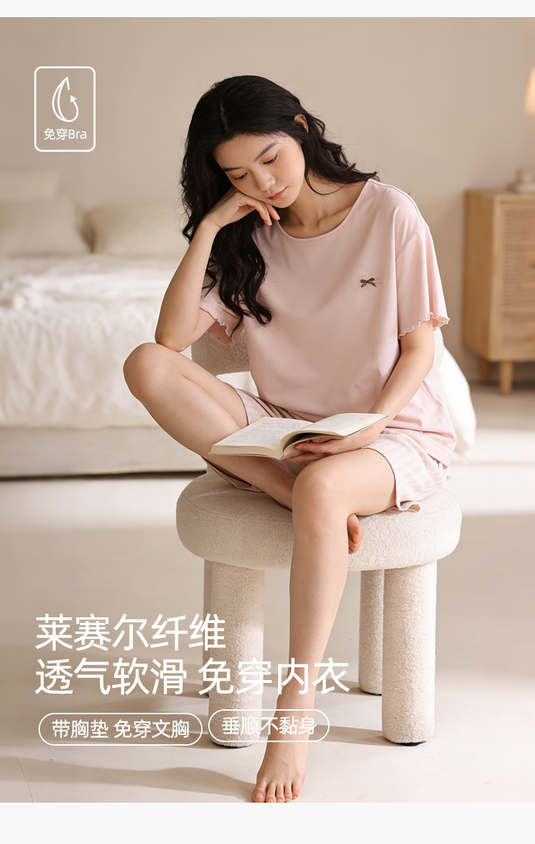 【带杯垫】熳洁儿 莱赛尔棉家居服短袖短裤套装简约甜美木耳边26263207