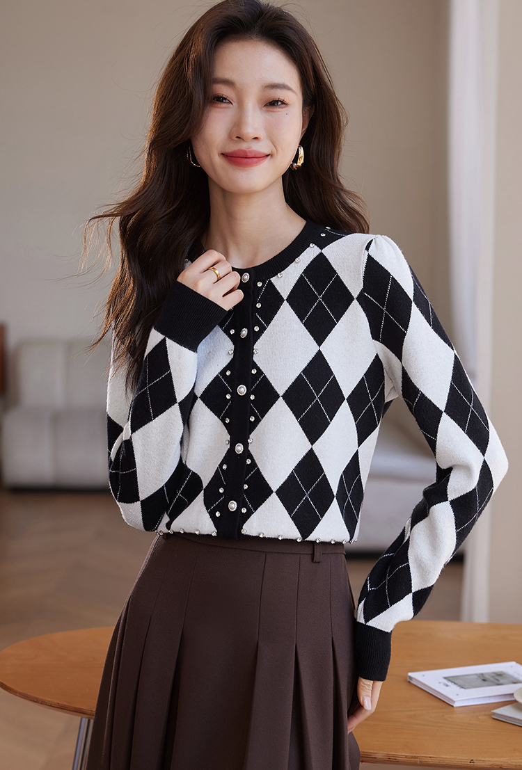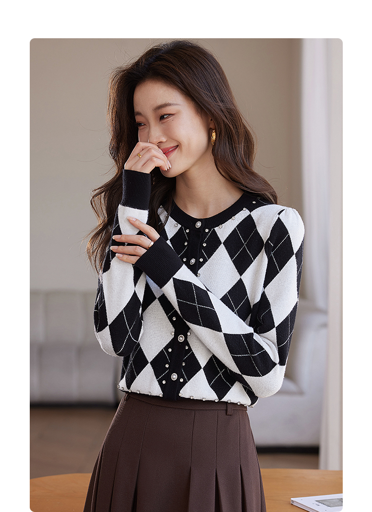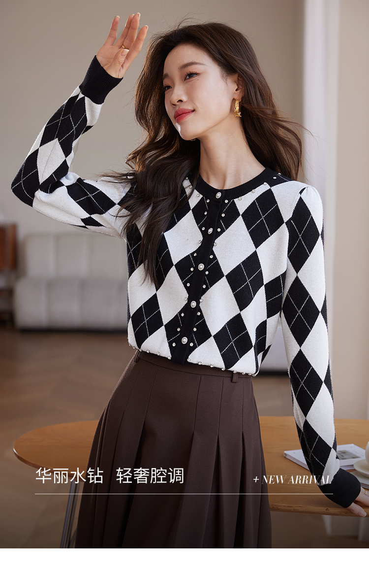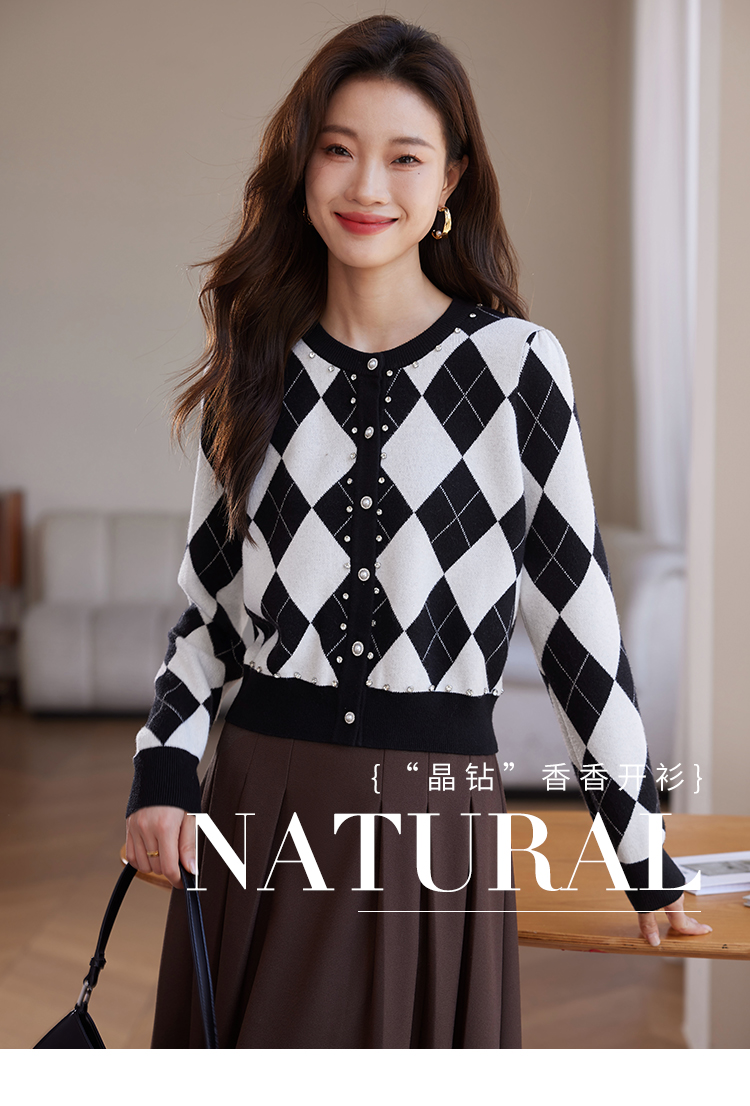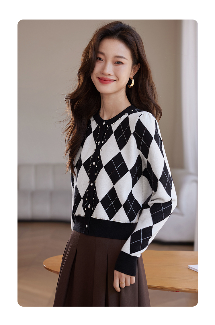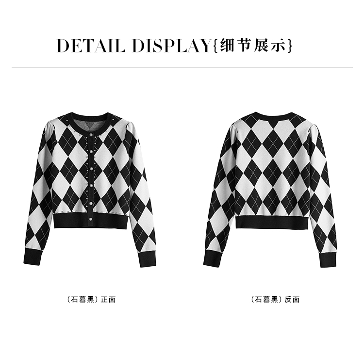 【年终特卖】熙世界黑白格子针织开衫女2025秋冬新款小个子圆领菱格毛衣短外套