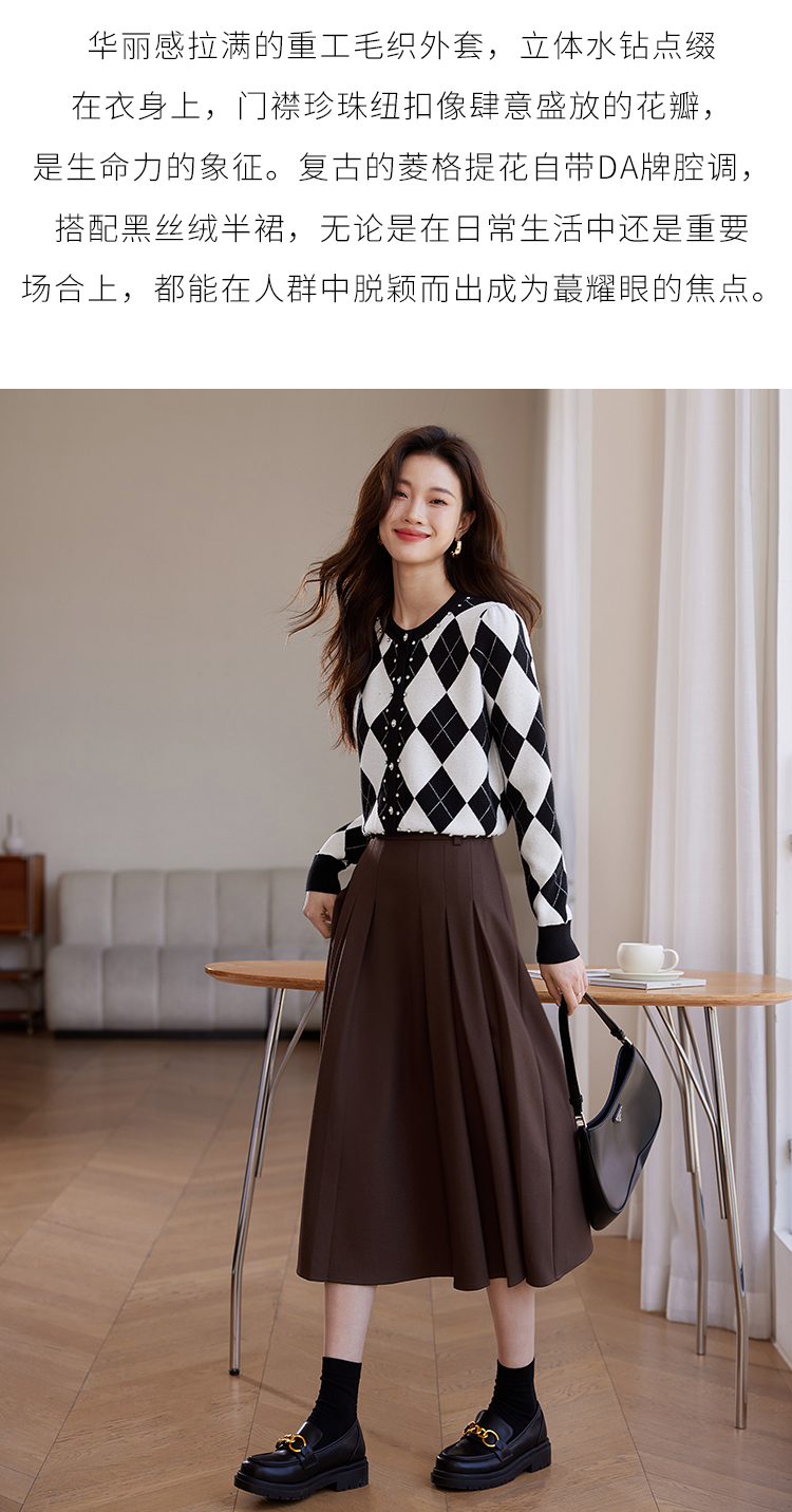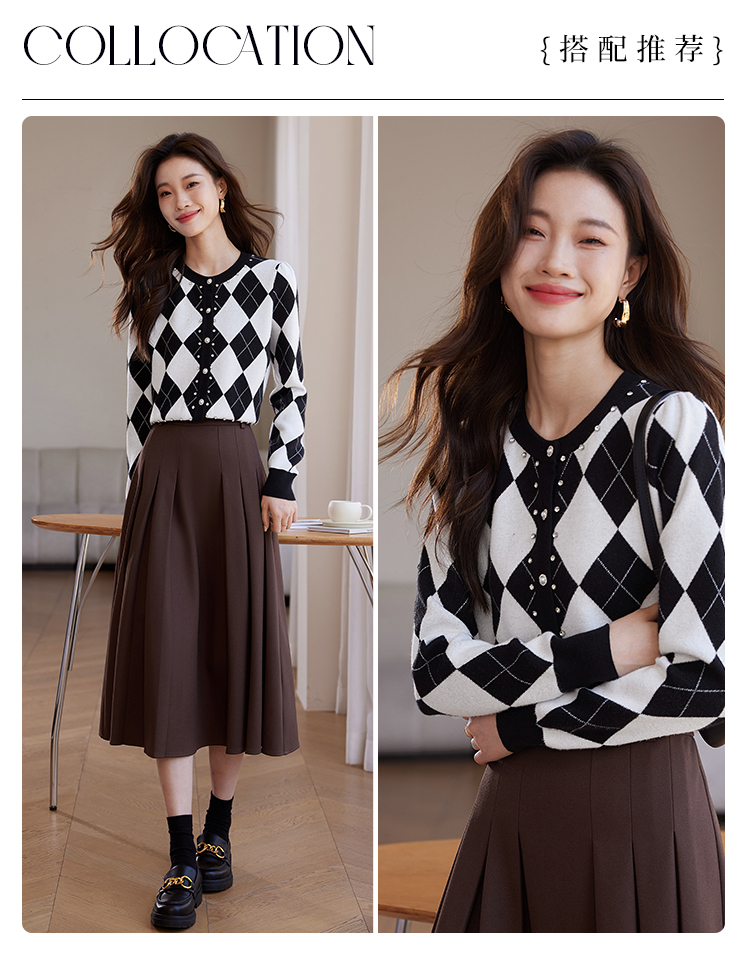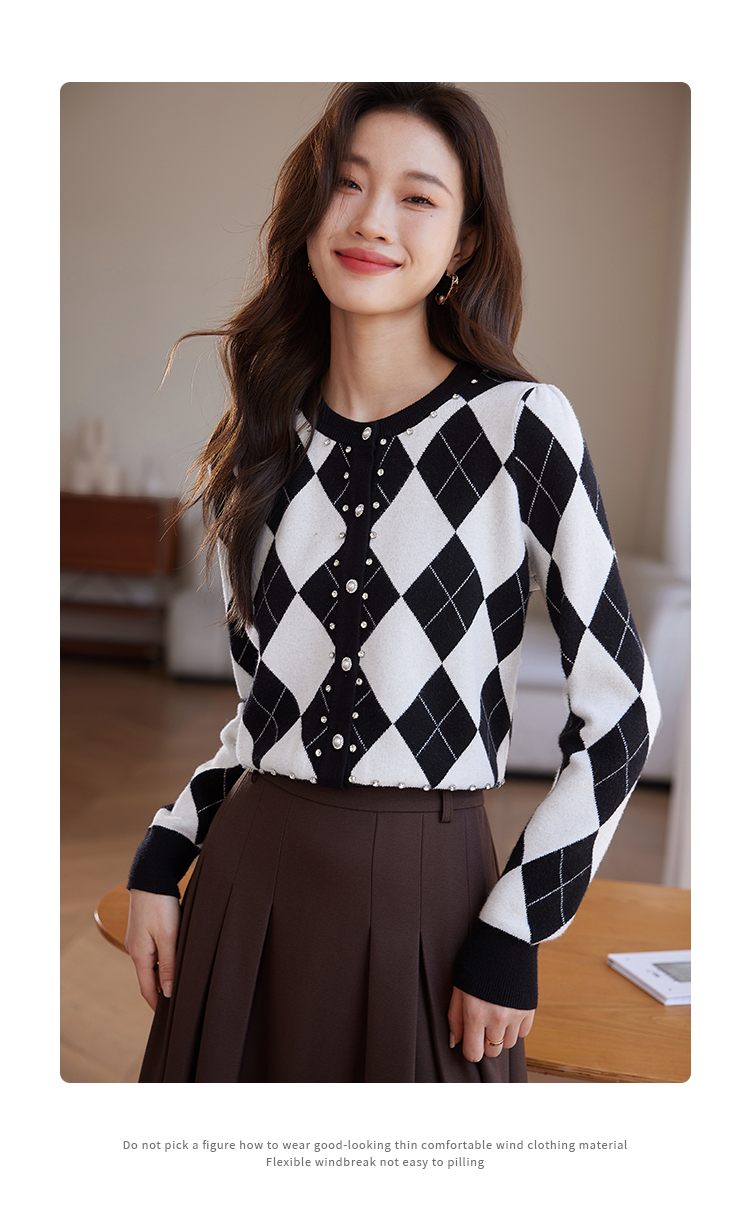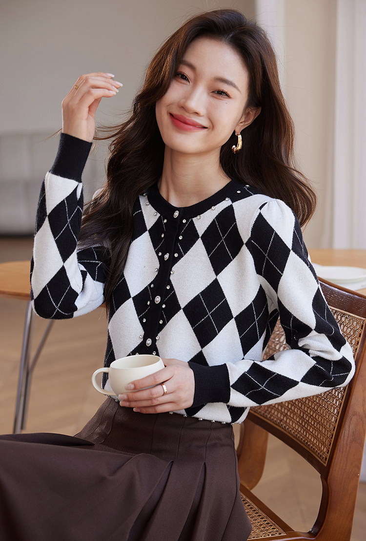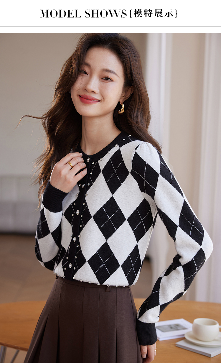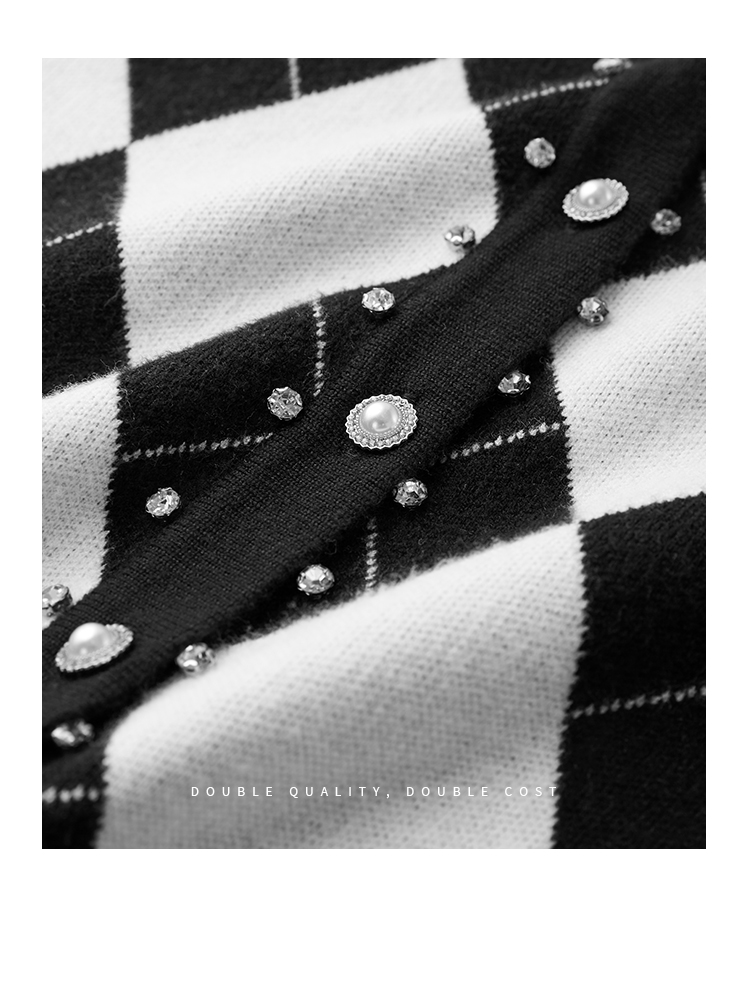 【年终特卖】熙世界黑白格子针织开衫女2025秋冬新款小个子圆领菱格毛衣短外套