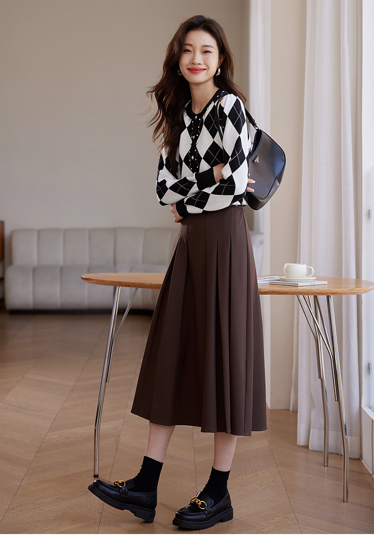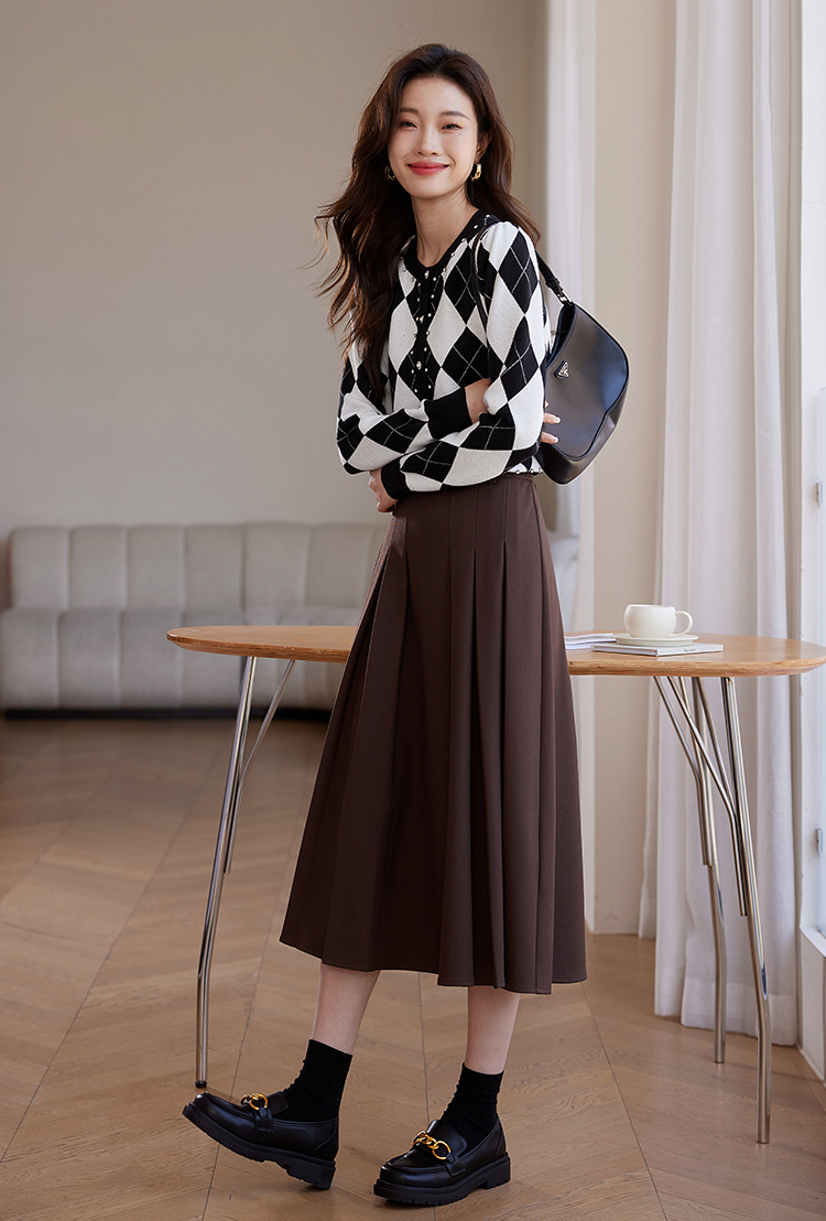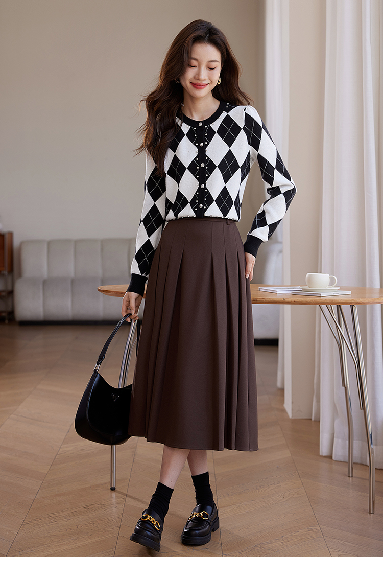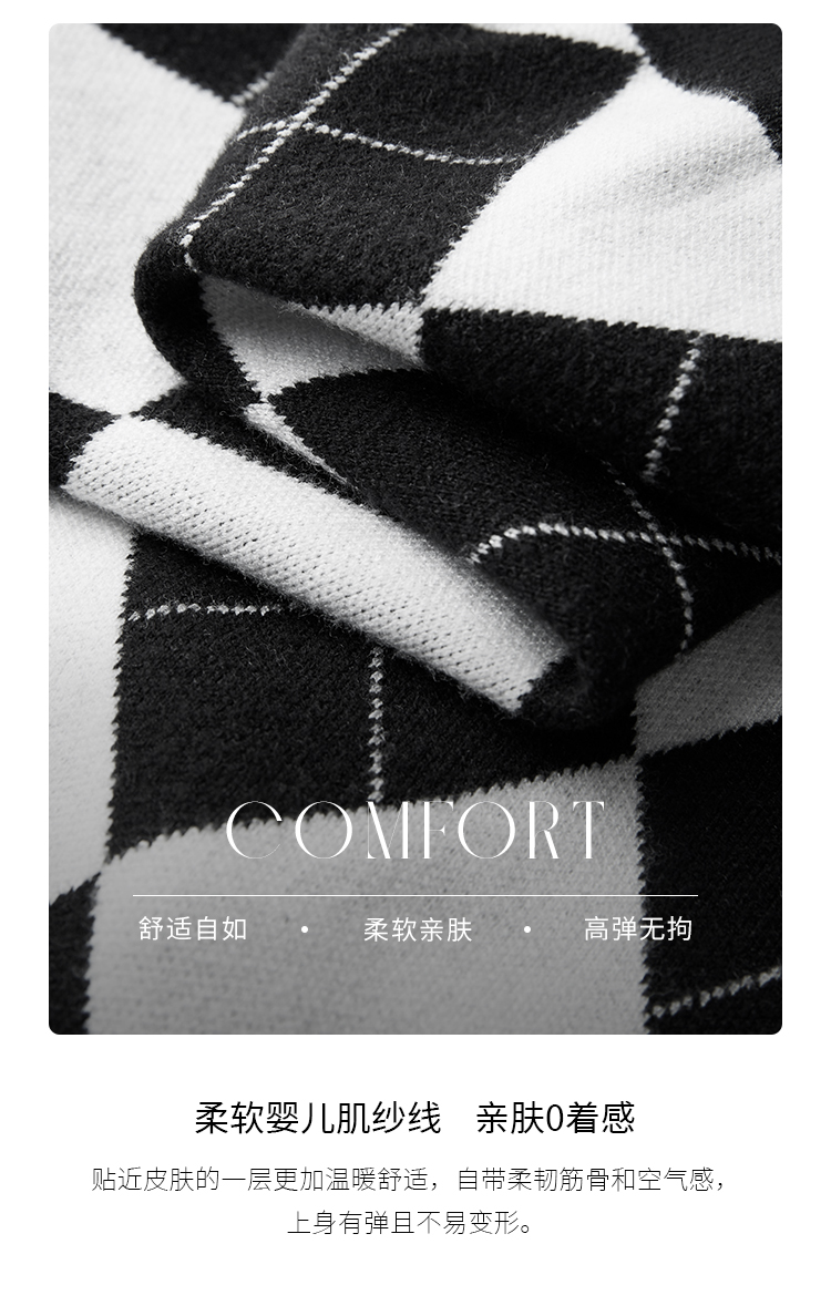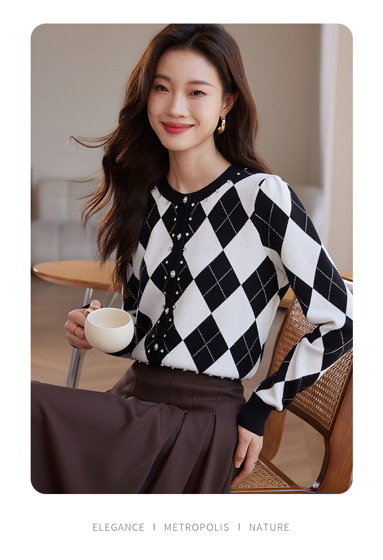 【年终特卖】熙世界黑白格子针织开衫女2025秋冬新款小个子圆领菱格毛衣短外套