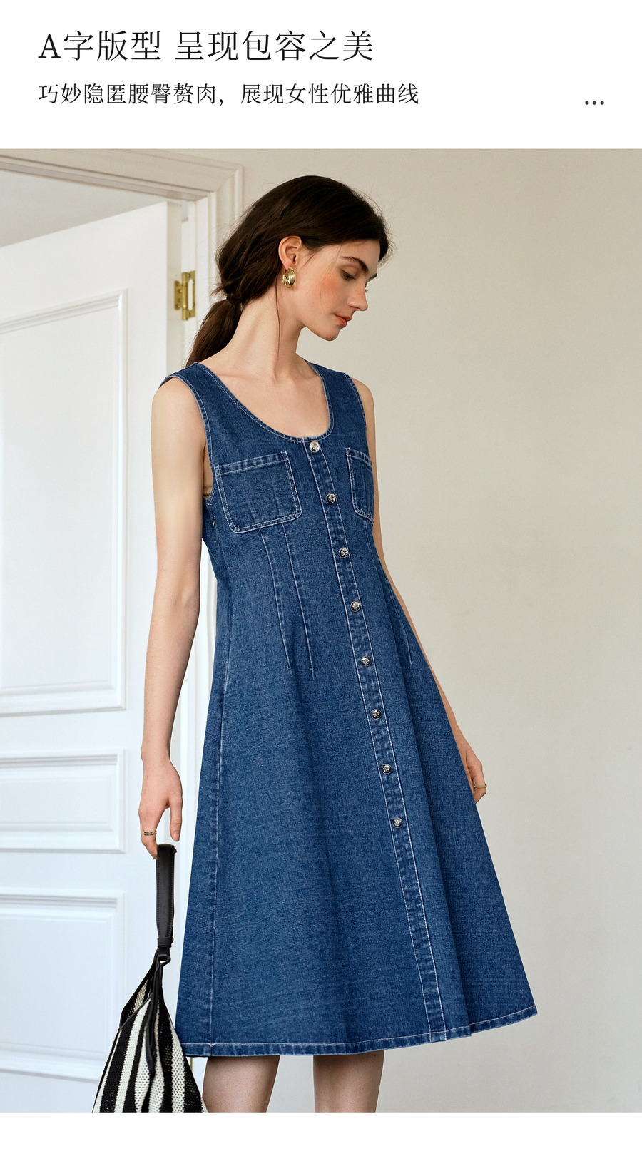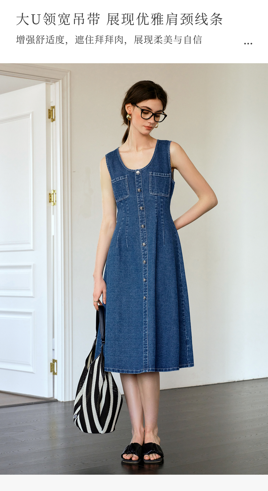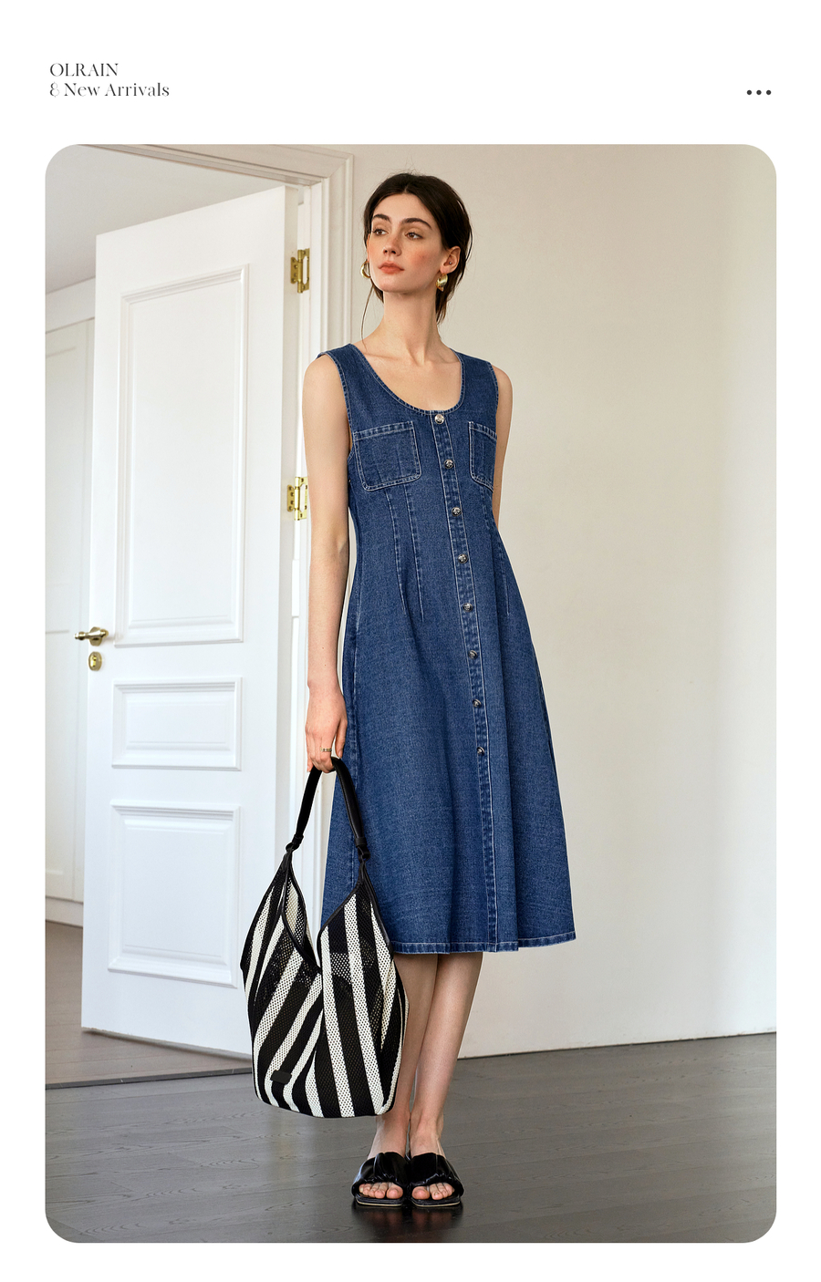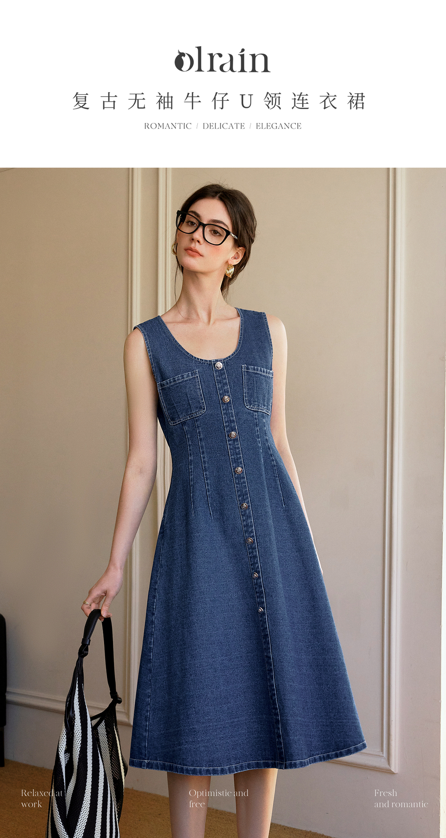 OLrain欧芮儿2025年春夏新款修身显瘦复古无袖牛仔U领气质连衣裙