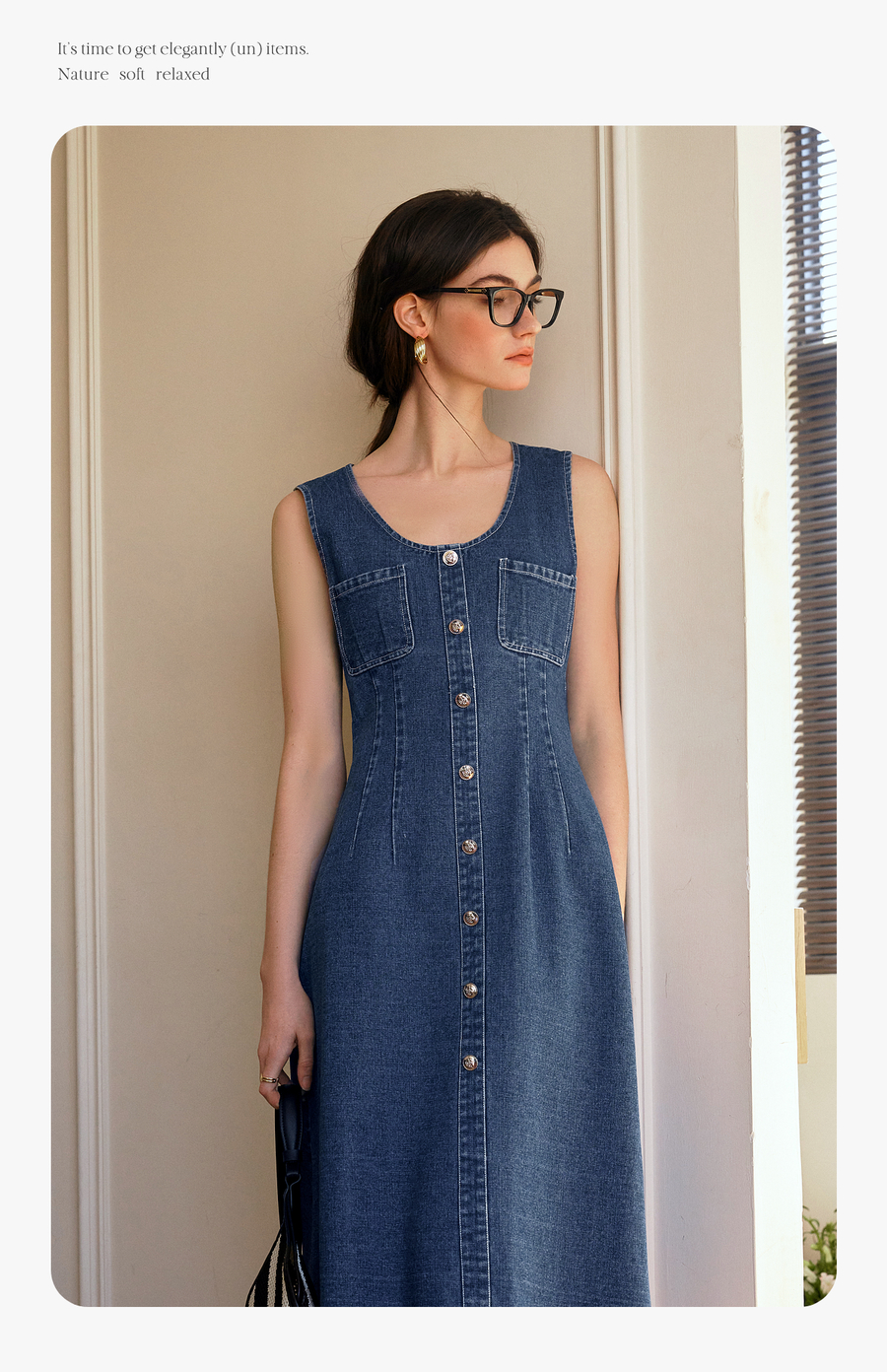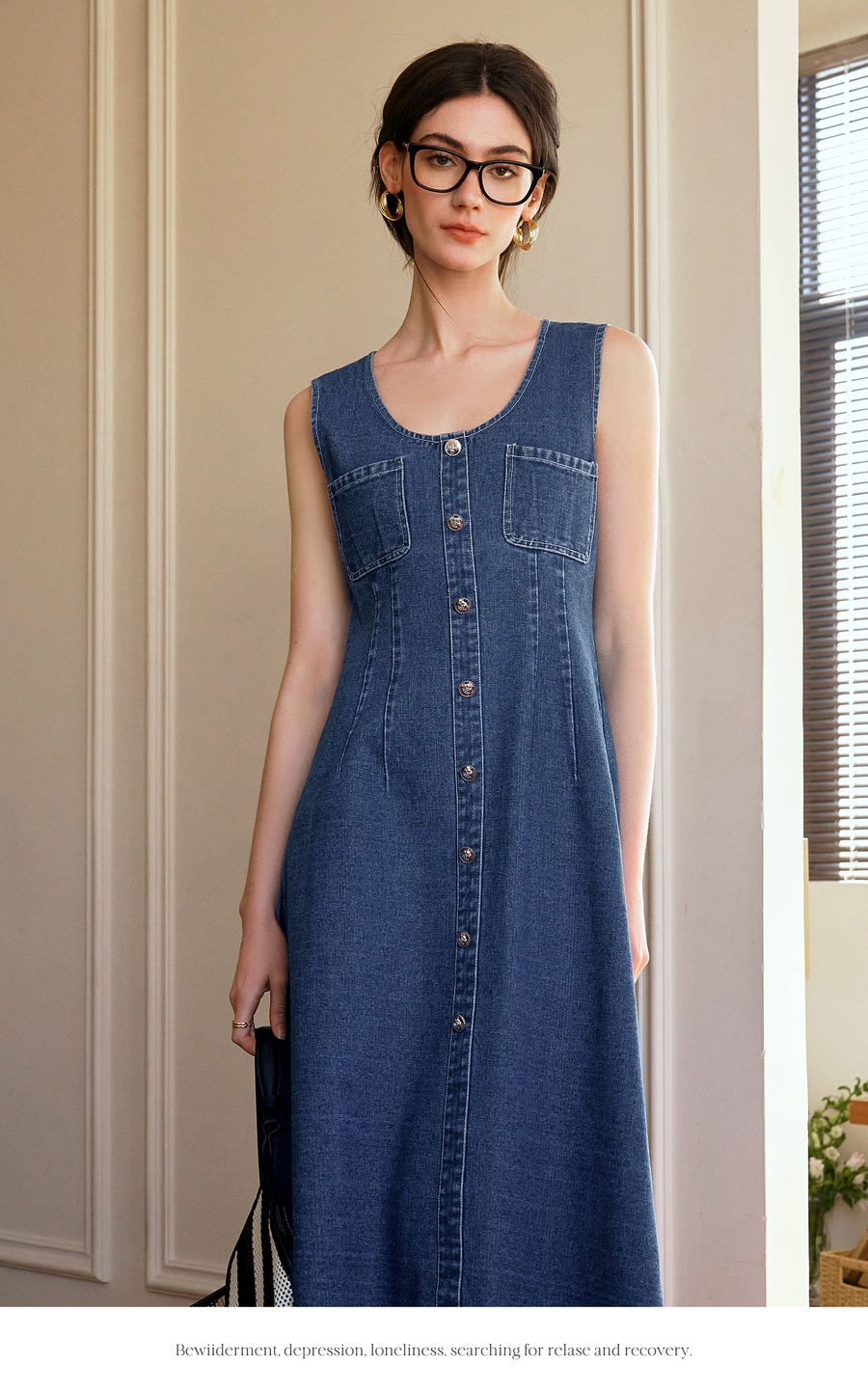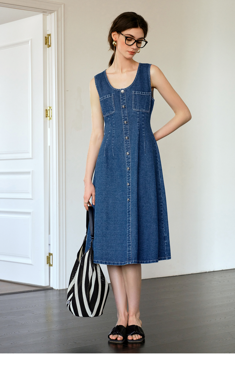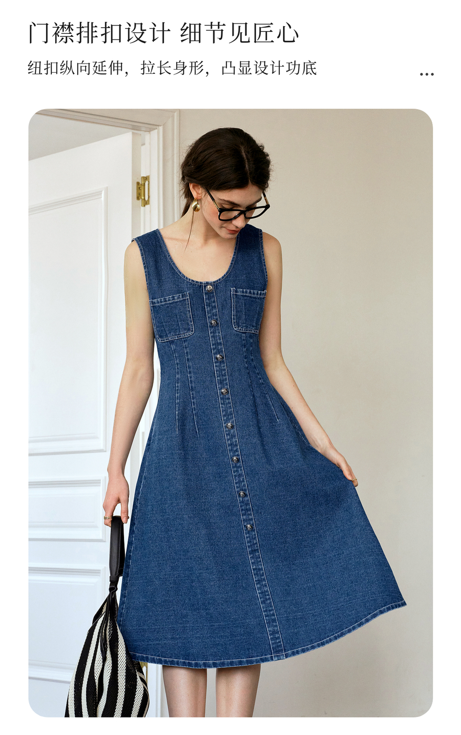 OLrain欧芮儿2025年春夏新款修身显瘦复古无袖牛仔U领气质连衣裙