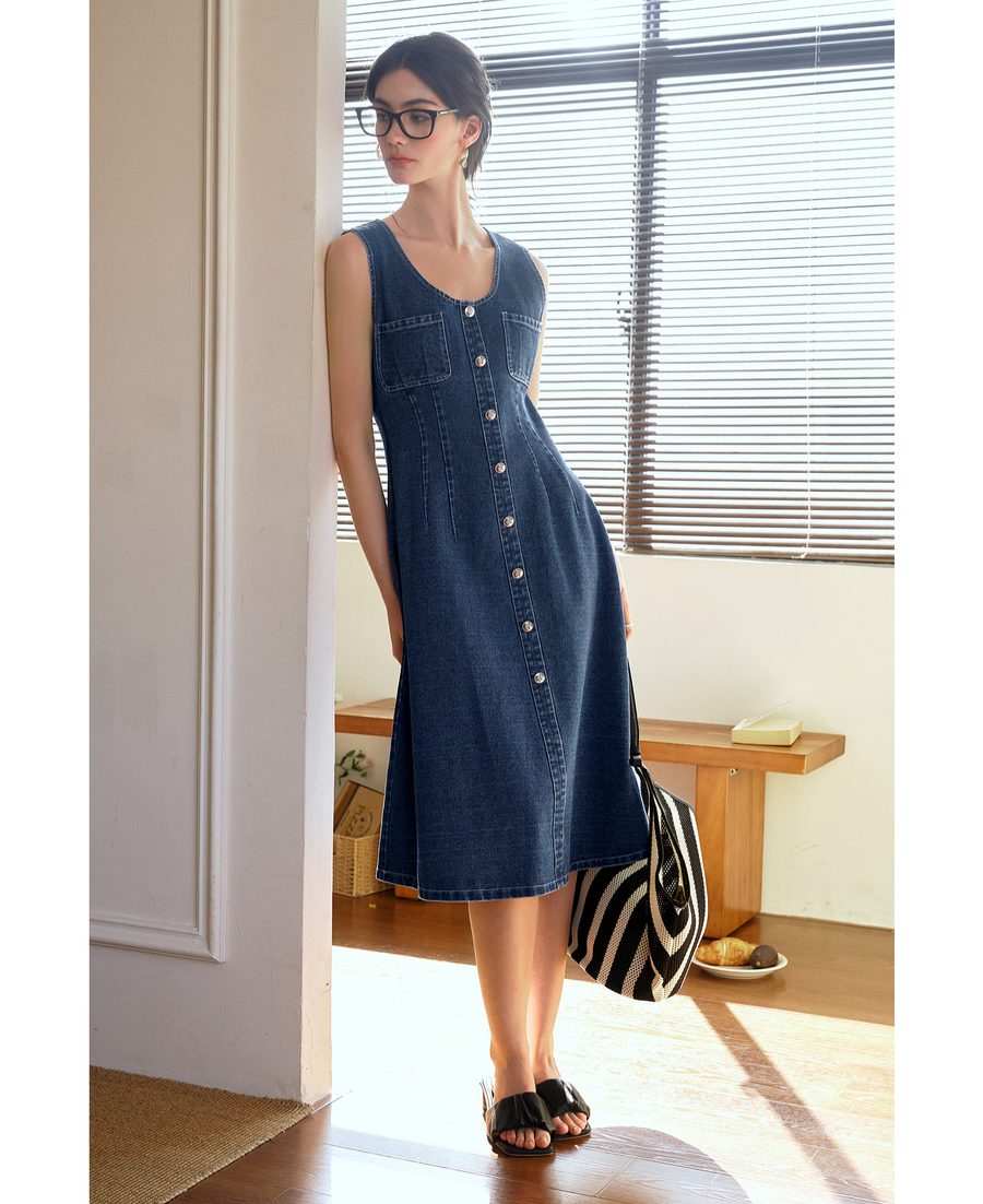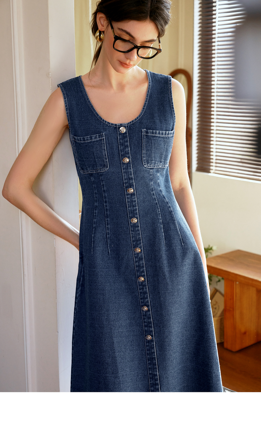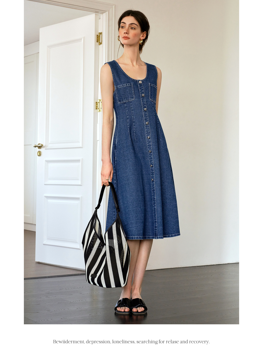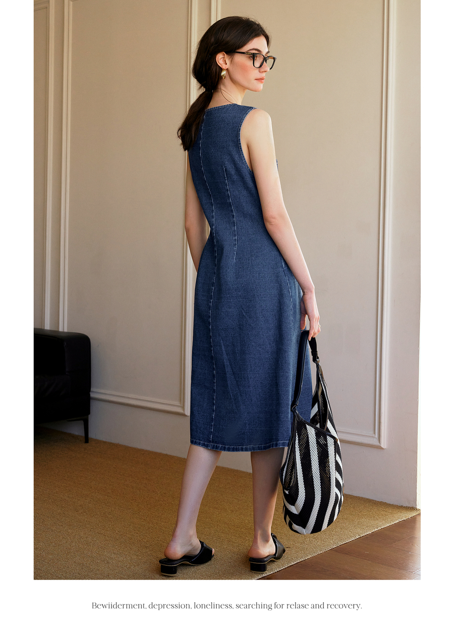 OLrain欧芮儿2025年春夏新款修身显瘦复古无袖牛仔U领气质连衣裙