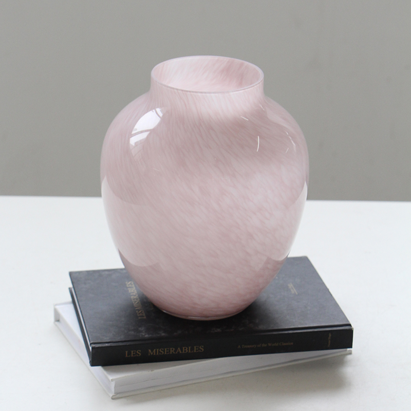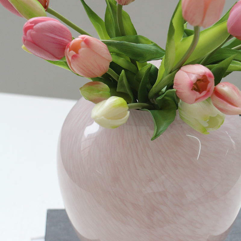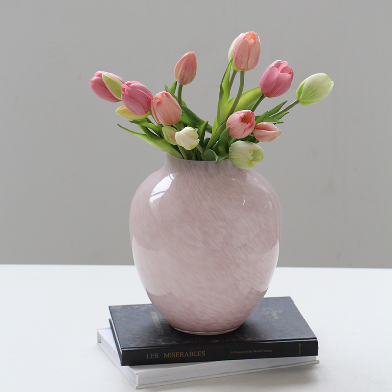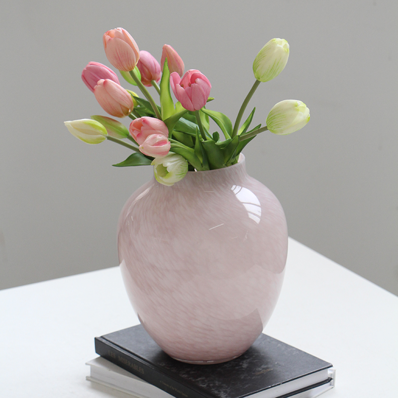 北欧中古淡粉色玻璃花瓶鲜花郁金香圆桶花器高颜值插花客厅装饰摆