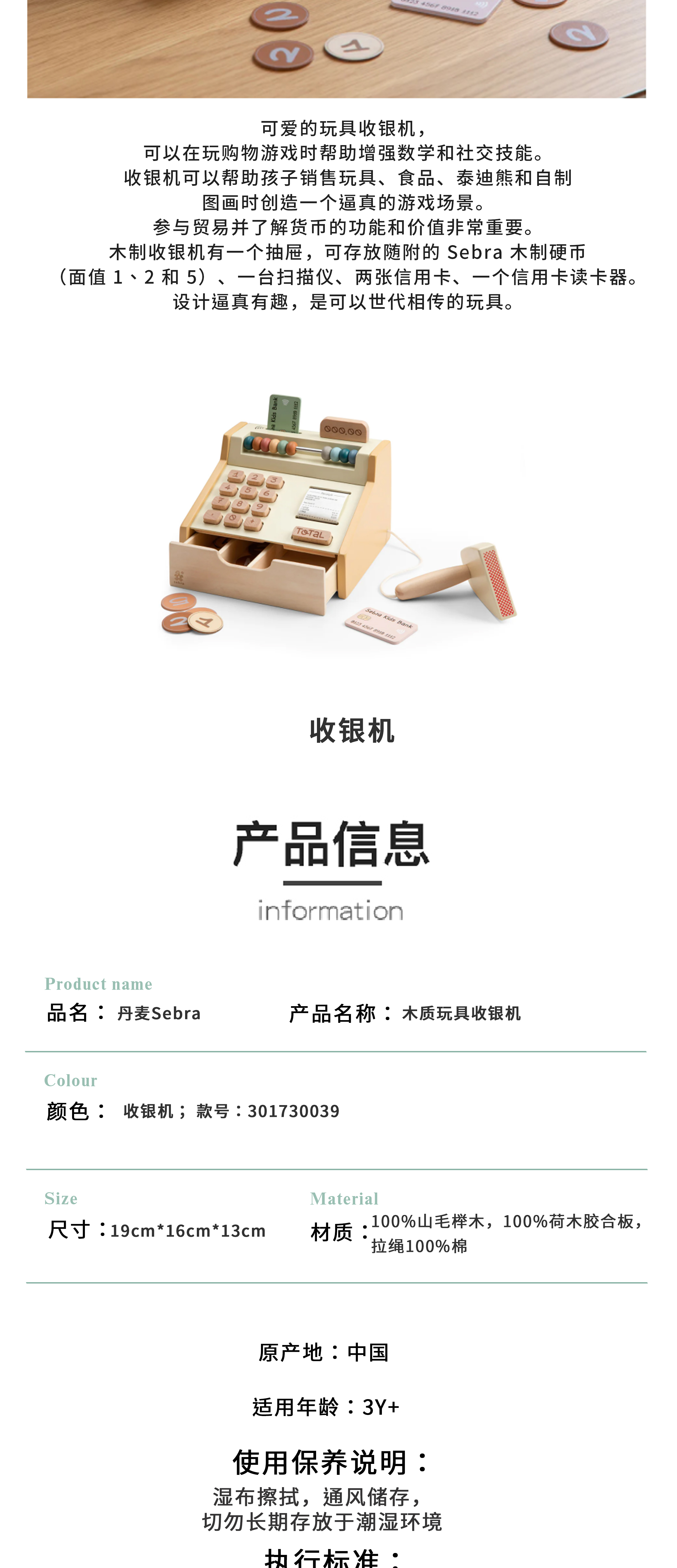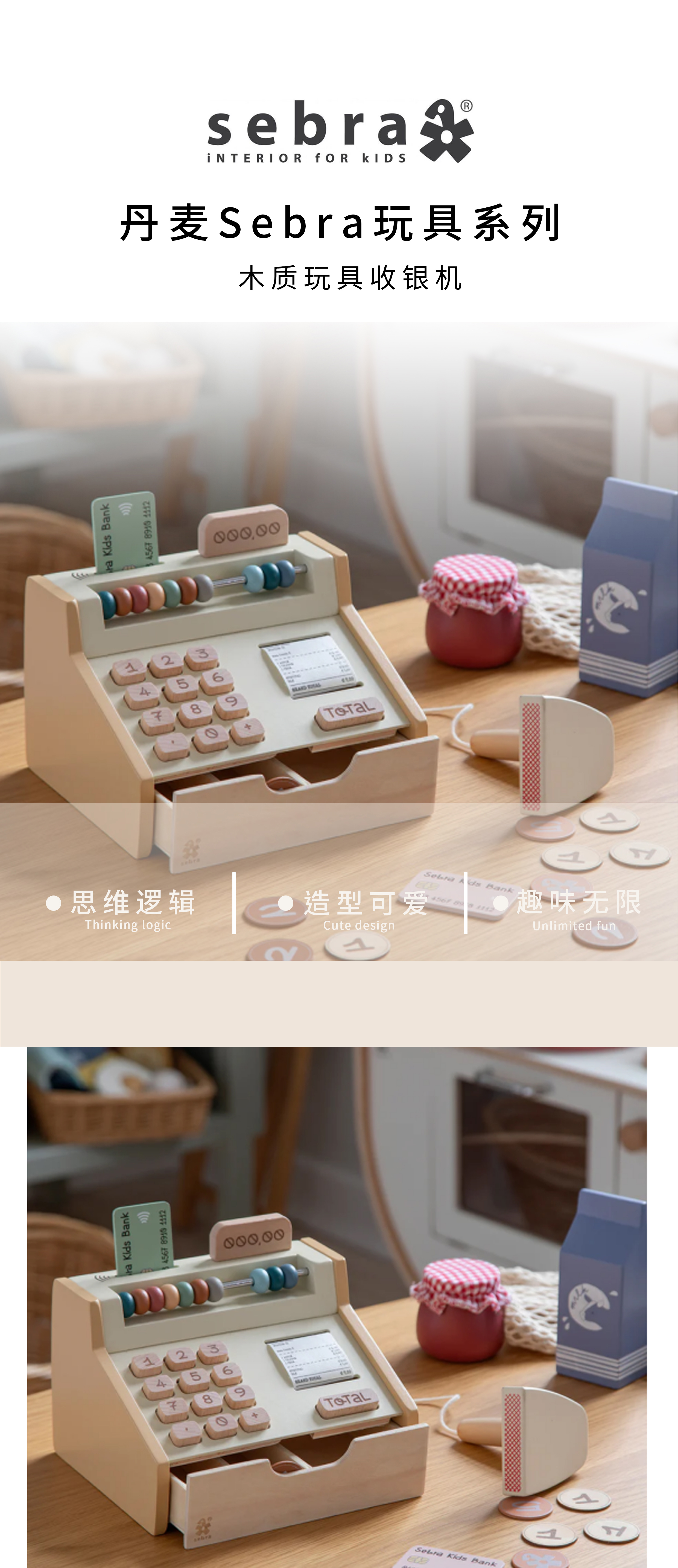 Sebra 木质玩具收银机收银员角色扮演过家家游戏益智 -19cm*16cm*13cm 3岁+