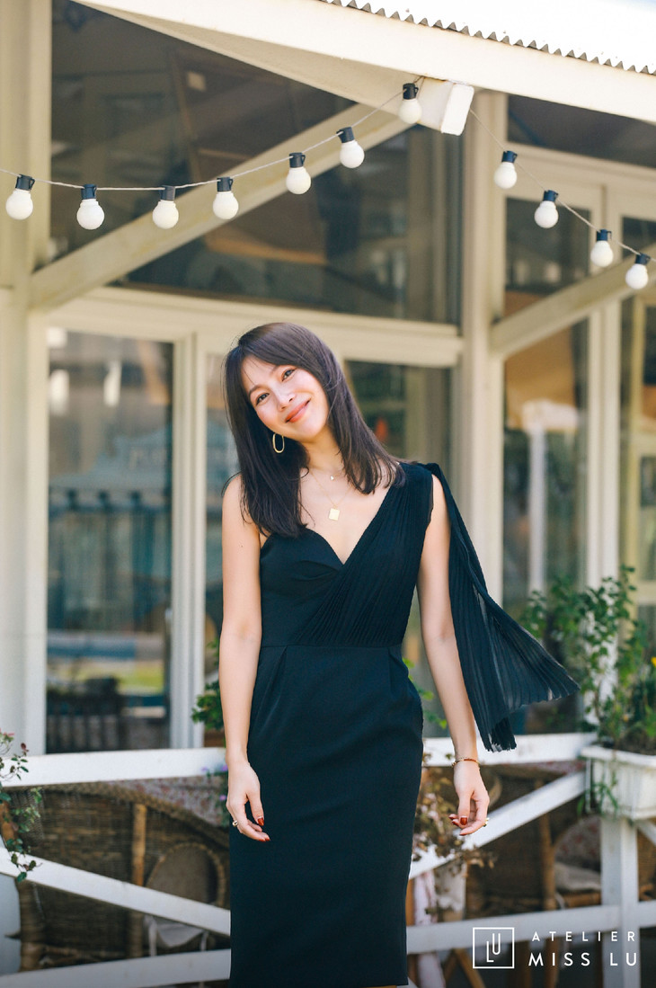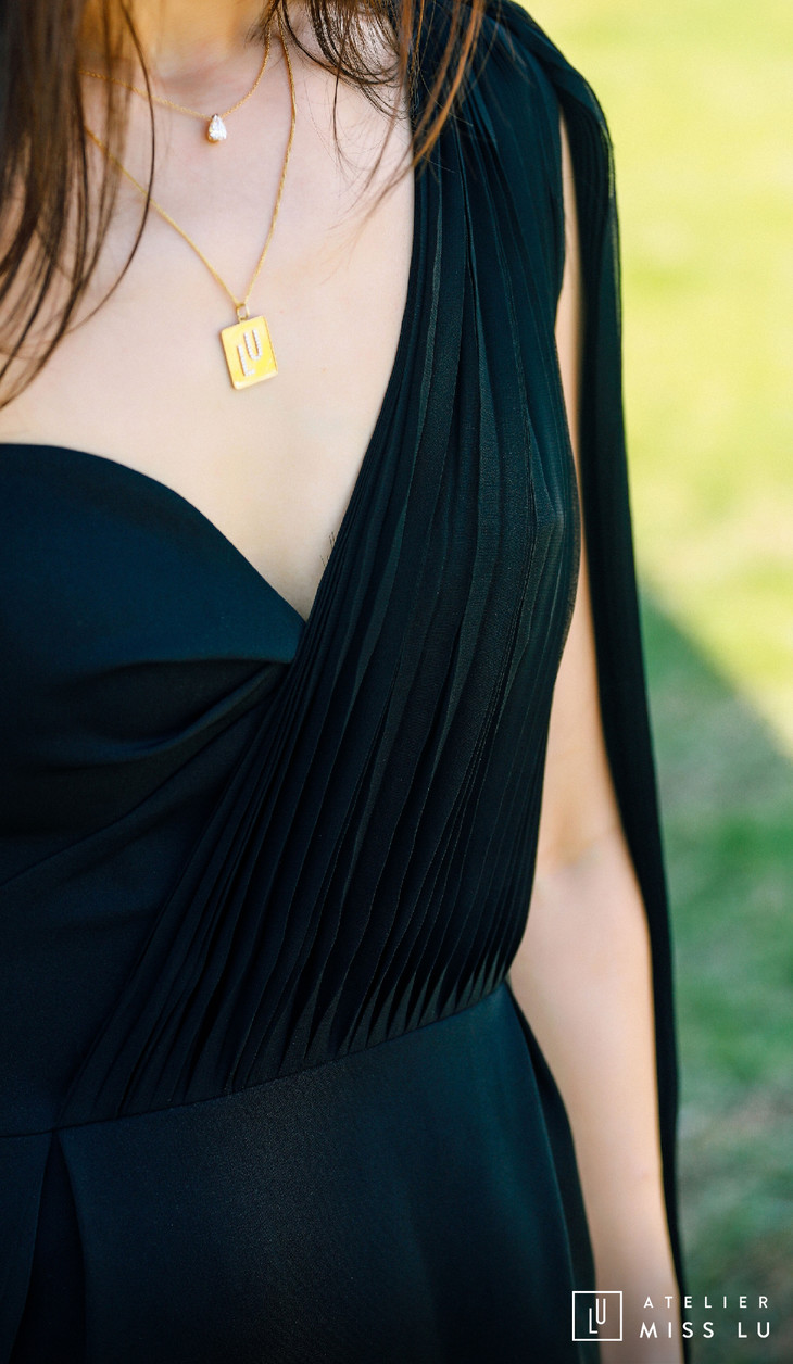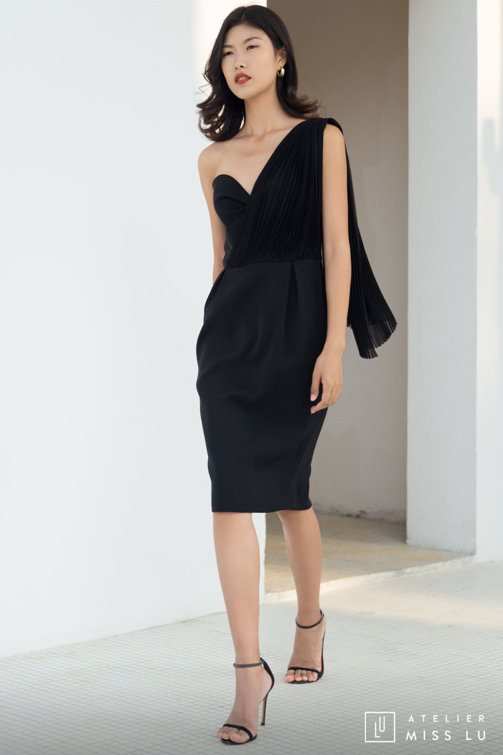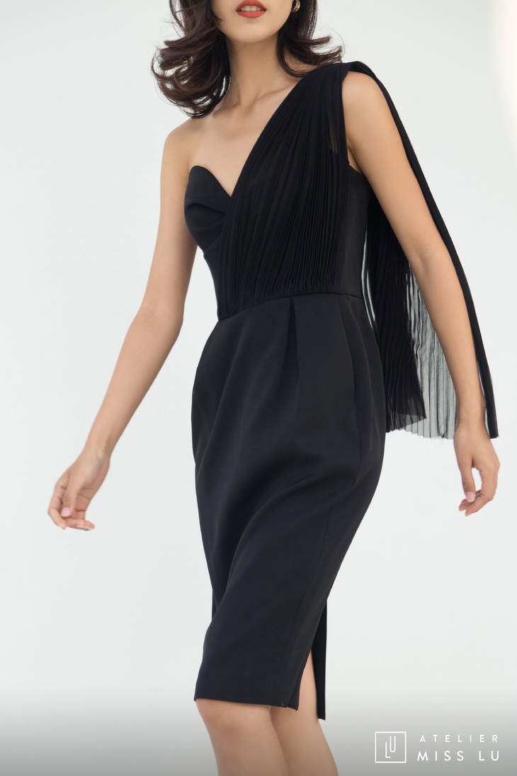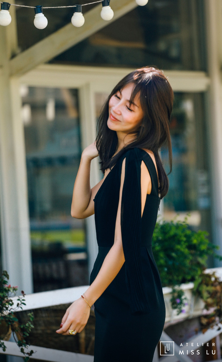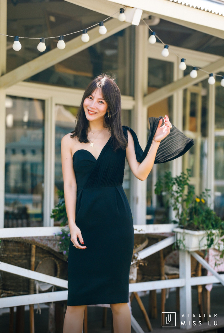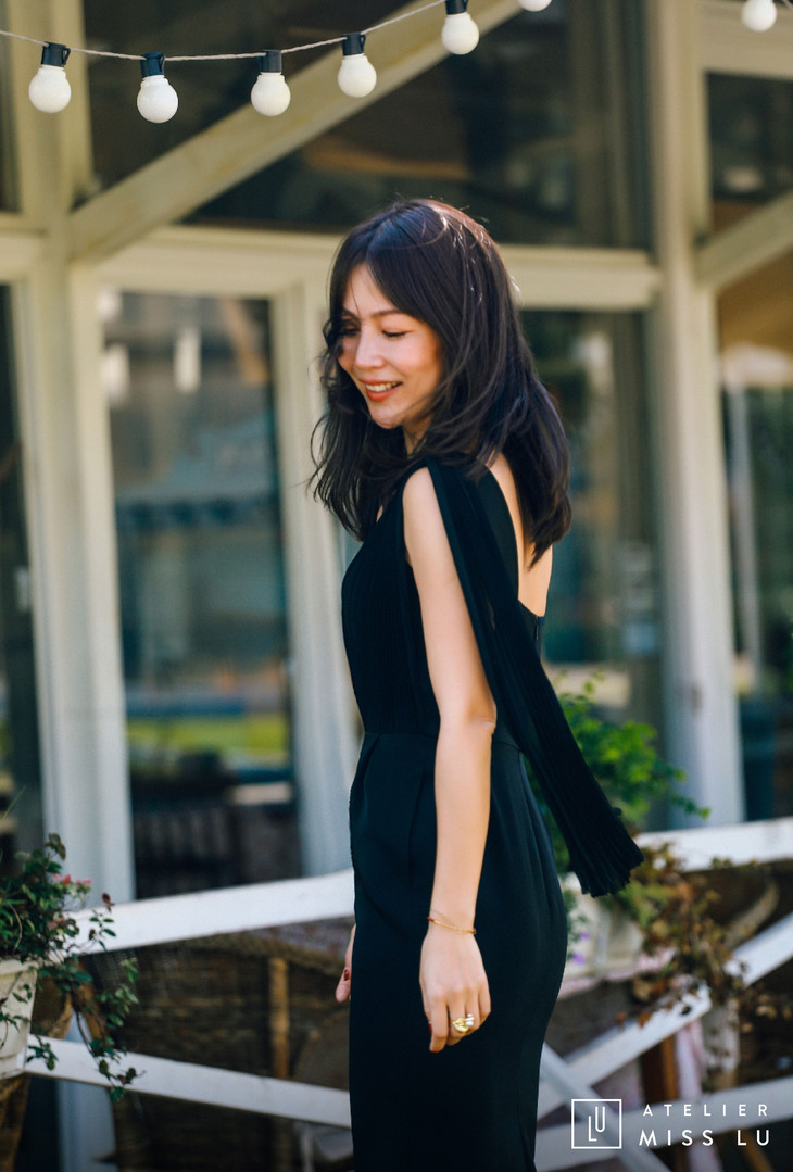 AtelierMissLu / Sinead-黑色单肩风琴褶飘带连身裙