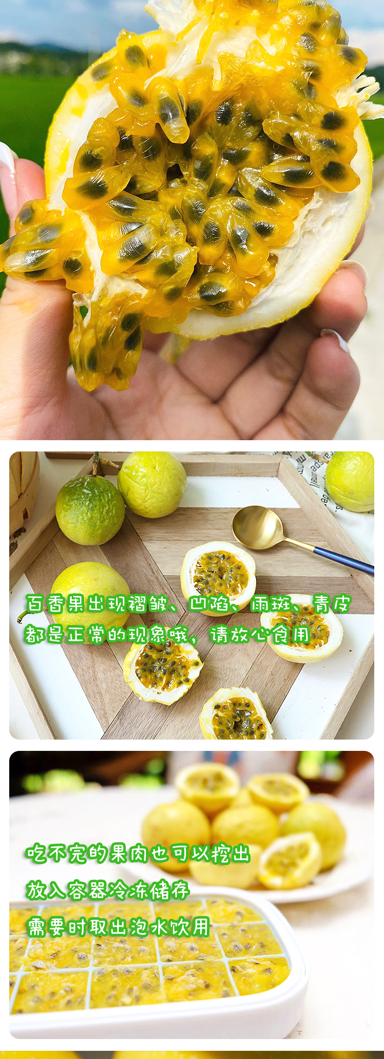 2.收到百香果后,请挑表皮变黄的果子先吃!表皮如有凹陷、褶皱、青皮、雨斑,均属于正常现象,不影响果肉品质,并非坏果,请放心食用!