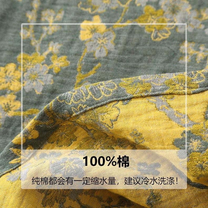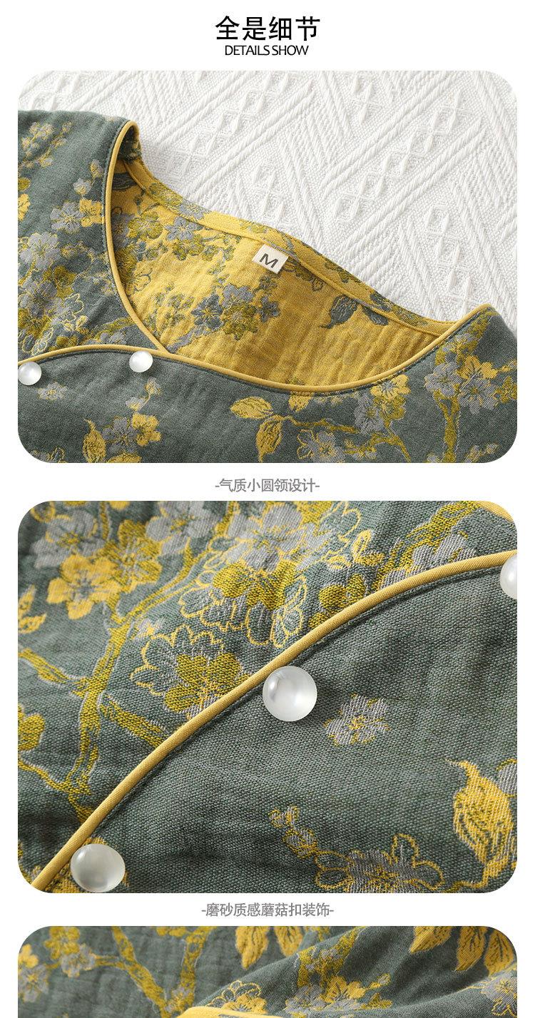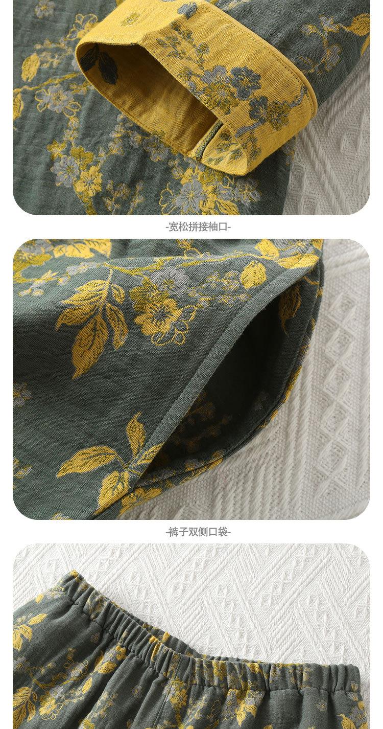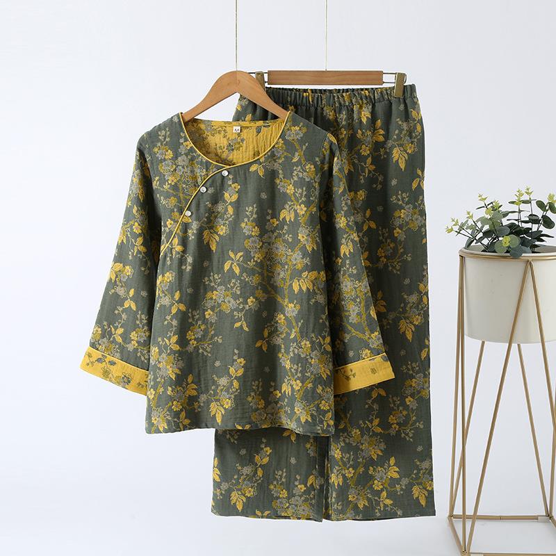 春秋中式国风睡衣女纯棉色织纱布睡衣九分袖斜襟家居服套装可外穿