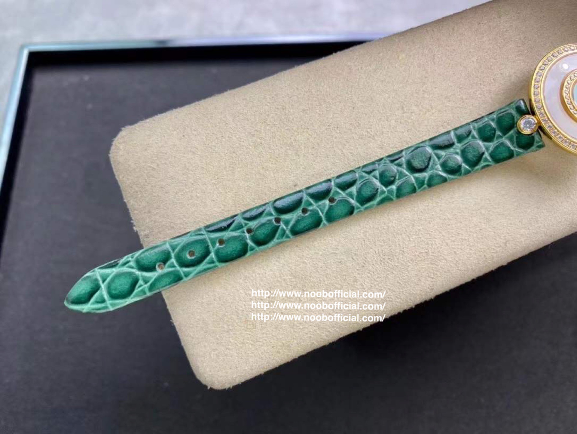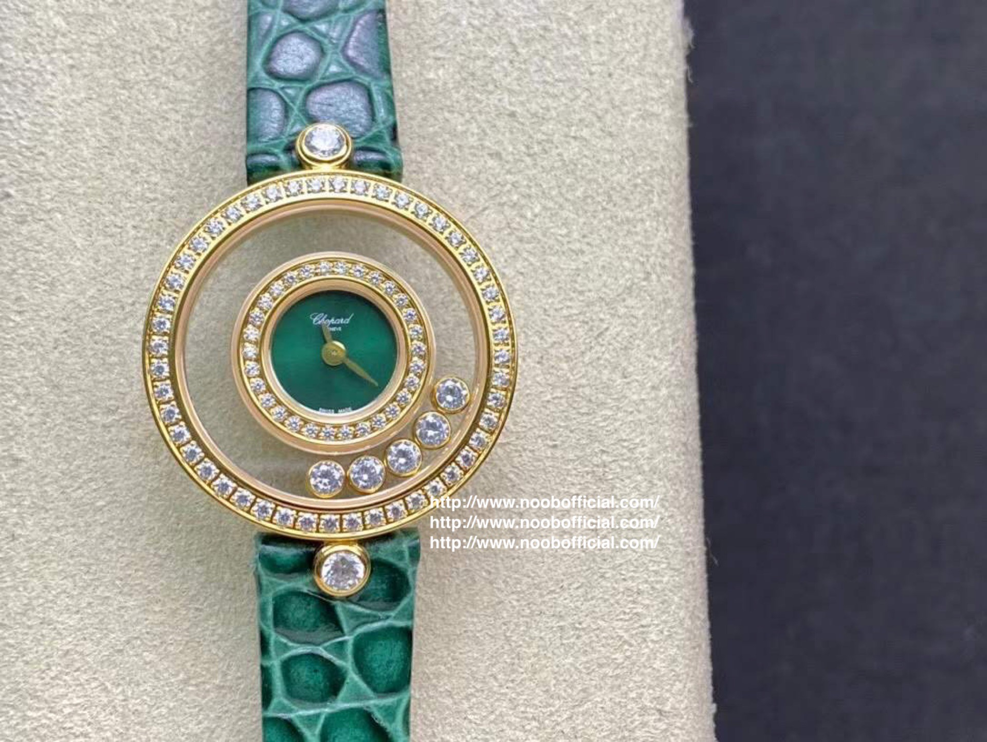 【萧邦HAPPY DIAMONDS系列快乐钻腕表】新增最新绿表盘 蓝宝石玻璃镜面 我们就是自己的神话 原厂瑞士石英机芯 镜面内7颗快乐钻自由转动 活动钻石围绕表盘回旋起舞 制作精巧的表壳玩味透明概念 chopard家标志性的Happy钻石在两片蓝宝石水晶玻璃 形成的空间内自由滑动 充分展现自由和欢快的感觉 表壳顶端与底端各缀有一圈钻石 树叶形指针 较小的同心圆为珍珠母贝质地 呈圆满的球型 两个同心圆环上皆全手工镶有钻石 五颗灵动钻石如悬空漂浮一般 细节见真知