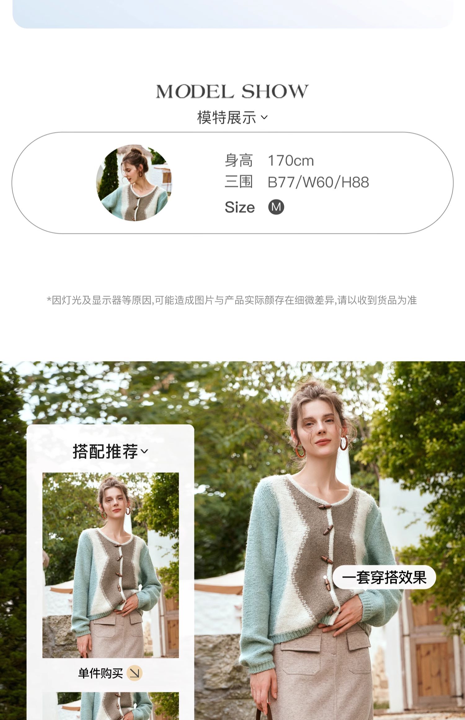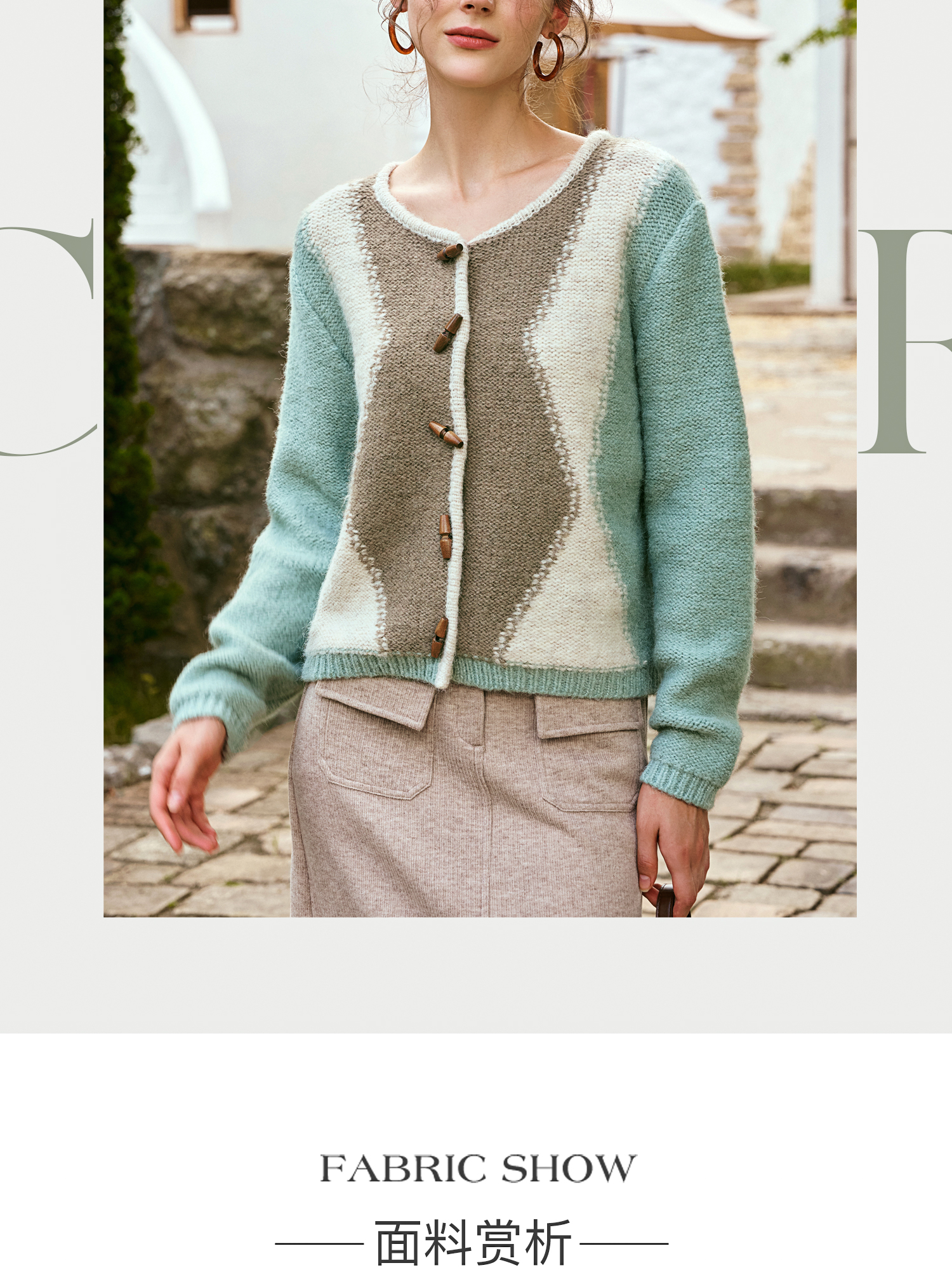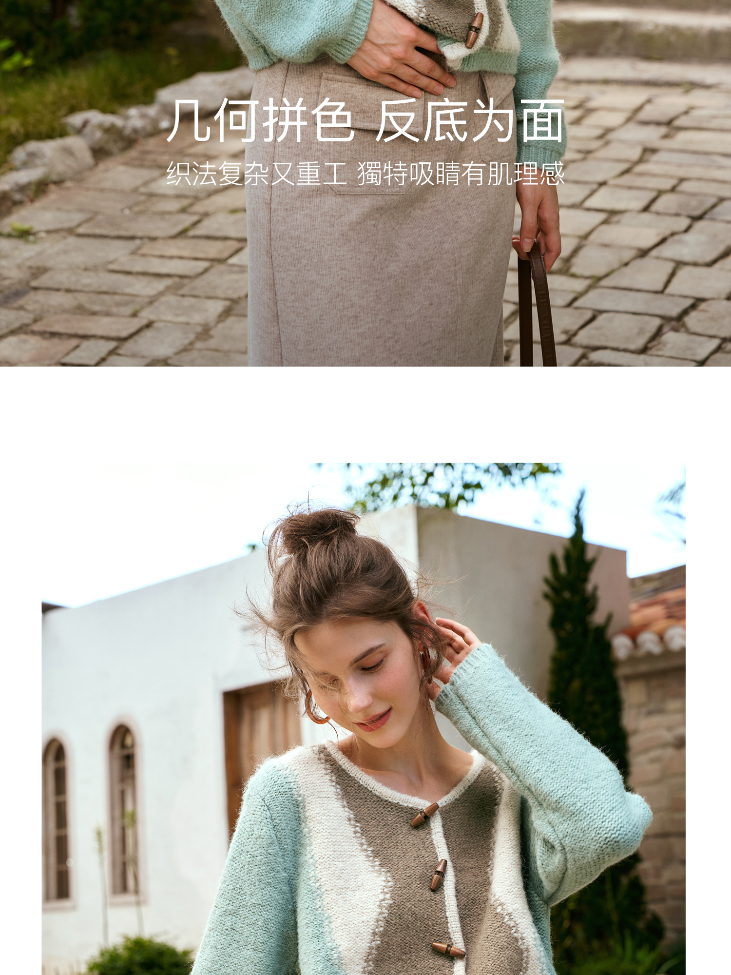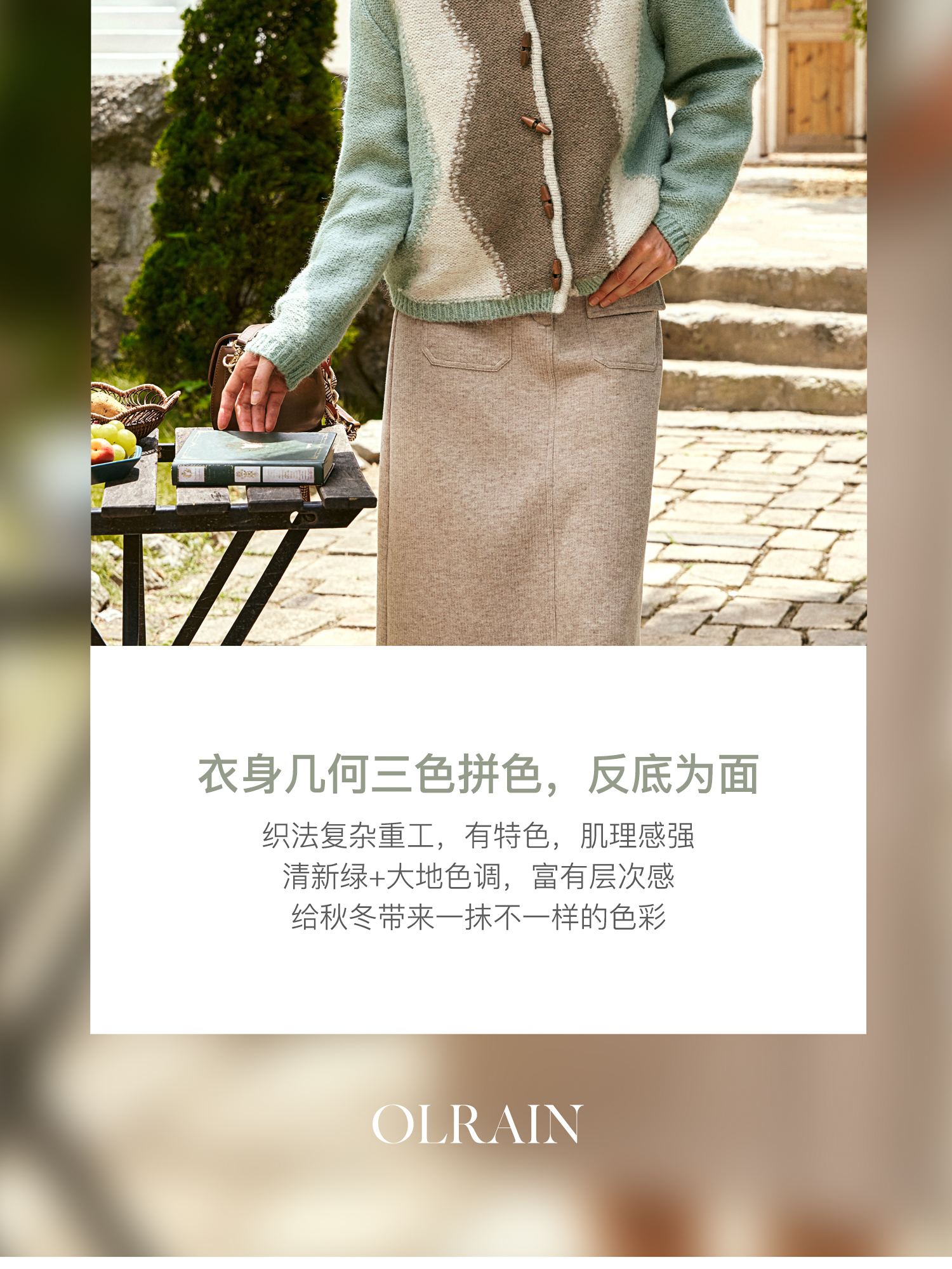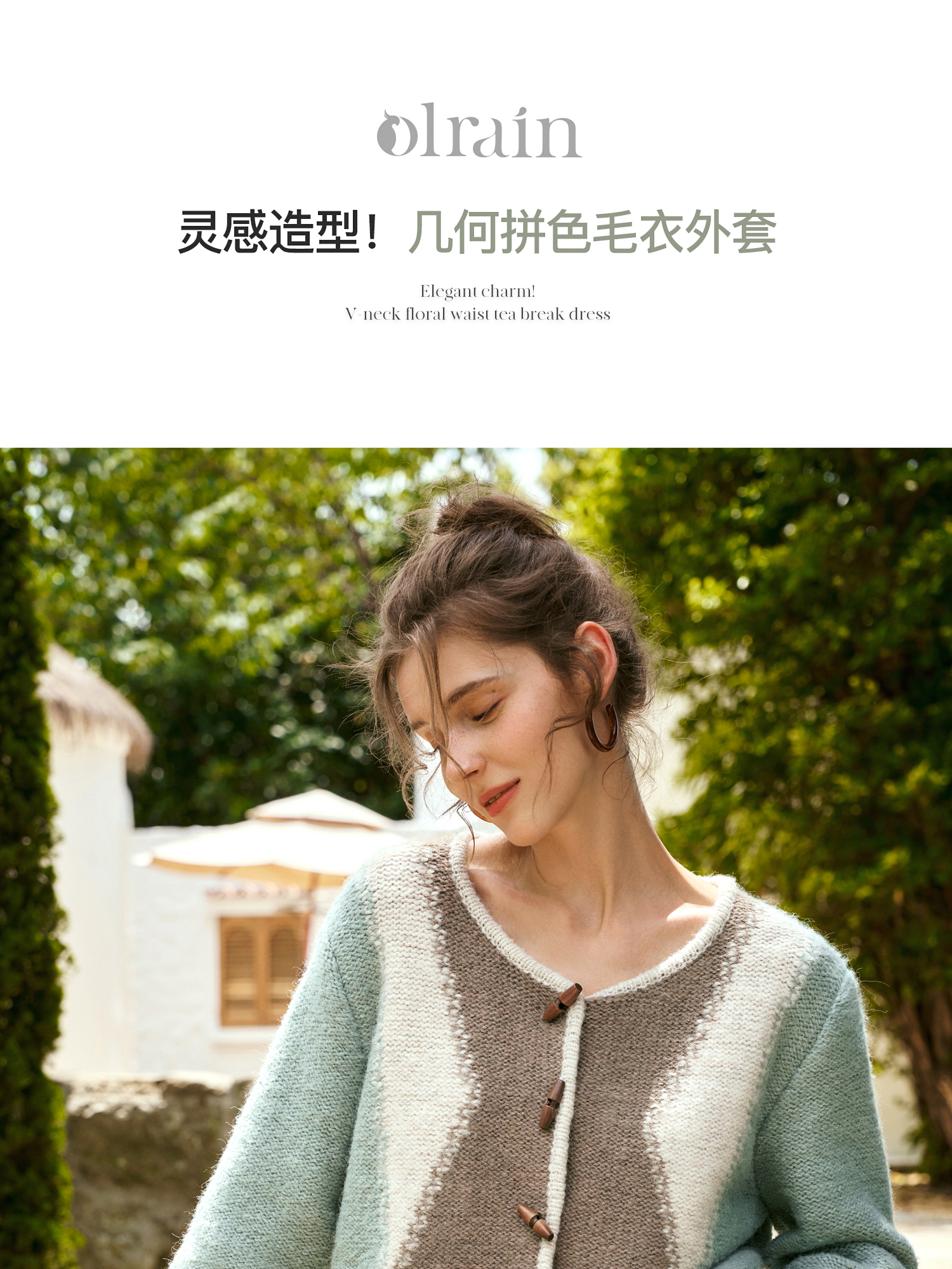 OLrain欧芮儿圆领毛衣外套女秋季2024年新款通勤几何拼色针织开衫