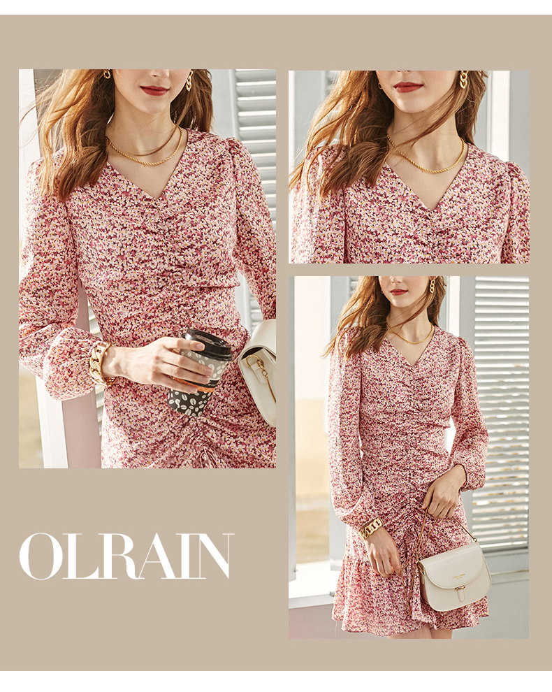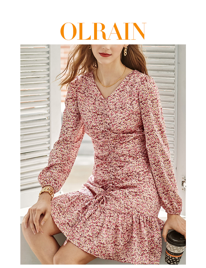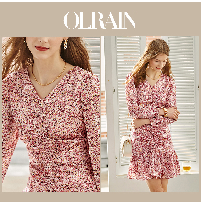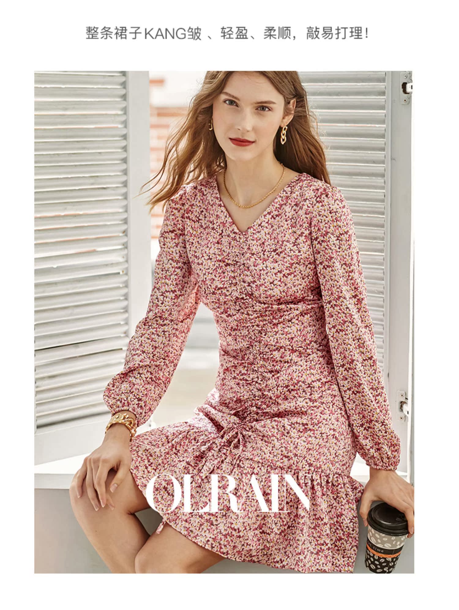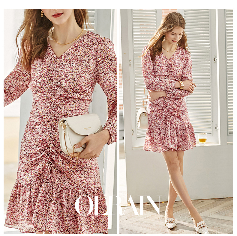 欧芮儿V领抽绳收腰碎花连衣女2020春装新品长袖雪纺鱼尾裙女