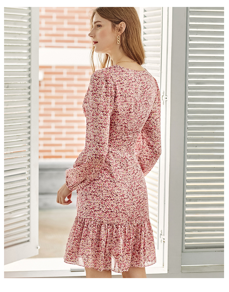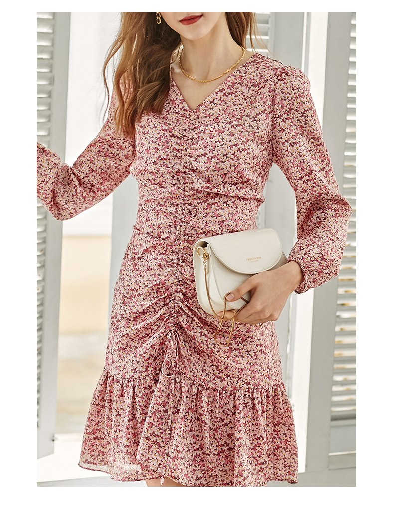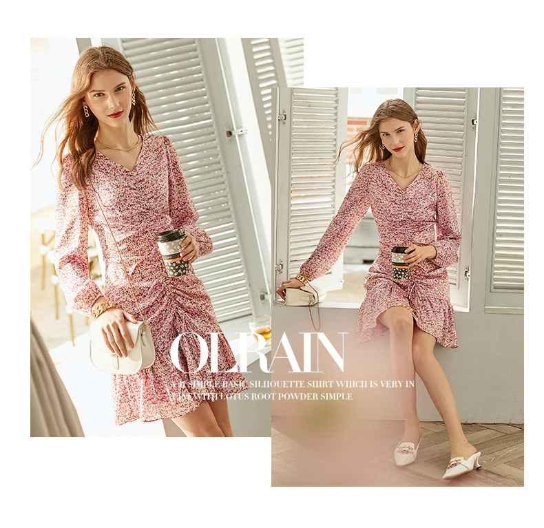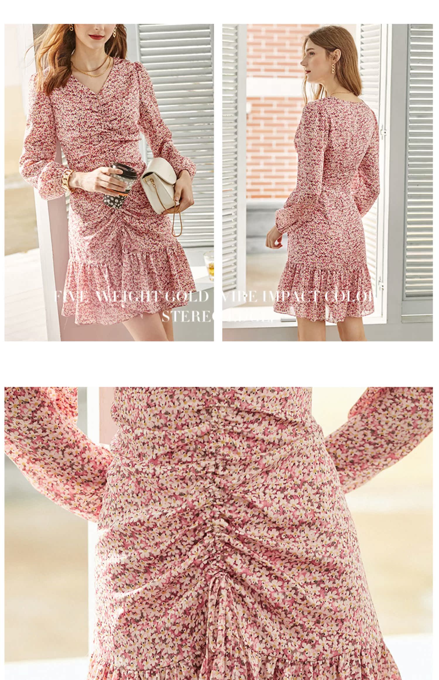 欧芮儿V领抽绳收腰碎花连衣女2020春装新品长袖雪纺鱼尾裙女