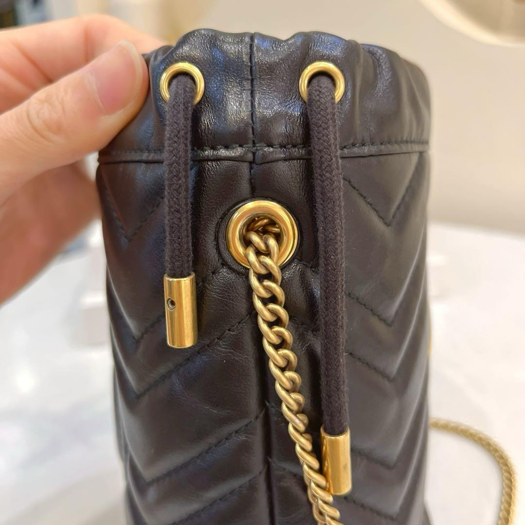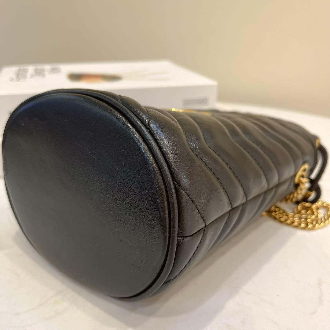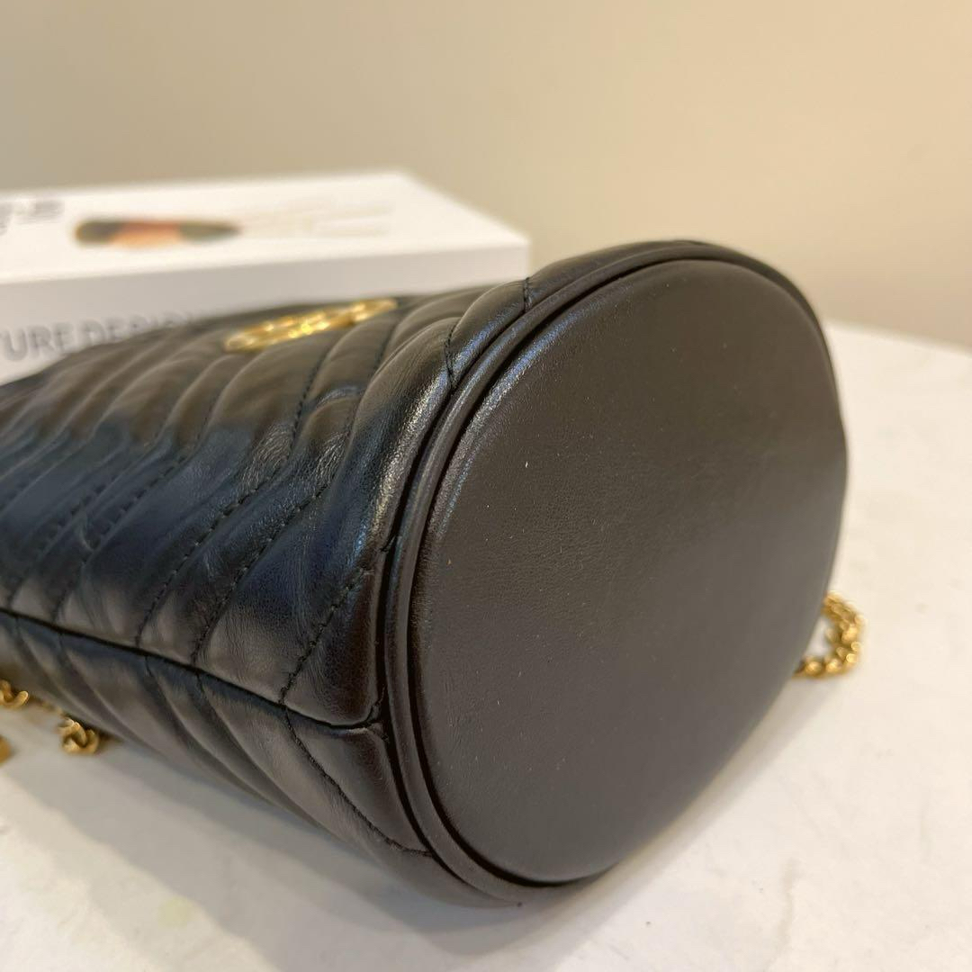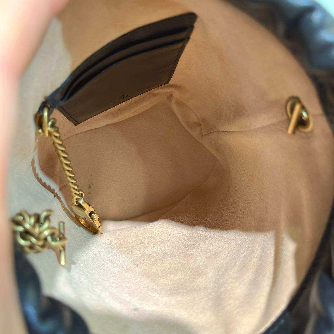 【商品詳情】正品二手 Gucci mini 黑金 牛皮 双G 马蒙 水桶包🕰️95新 13x17 配件:肩带 龙虾扣 防尘袋。底部有轻微使用划痕 内里麂皮有正常使用痕迹。解放双手mini包包