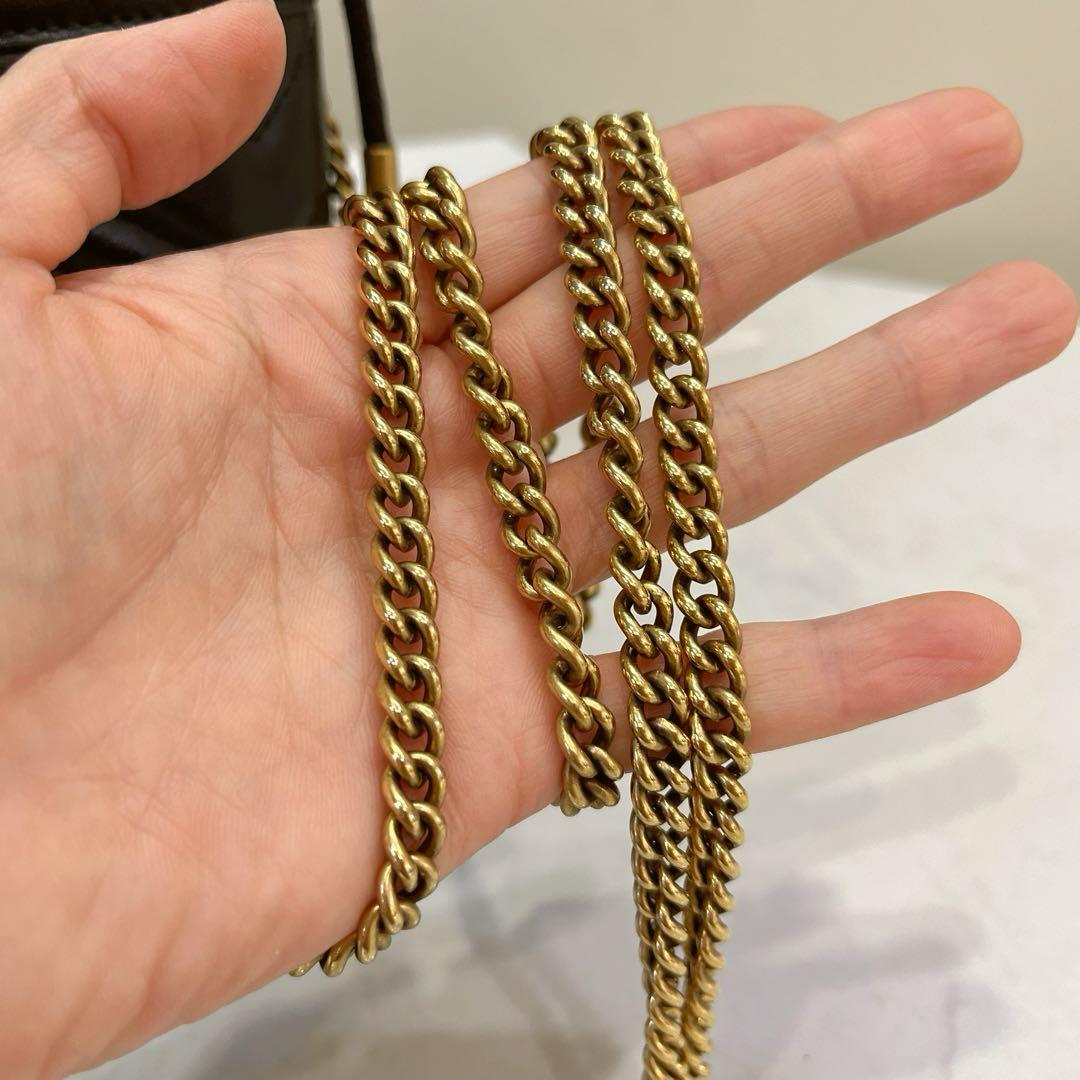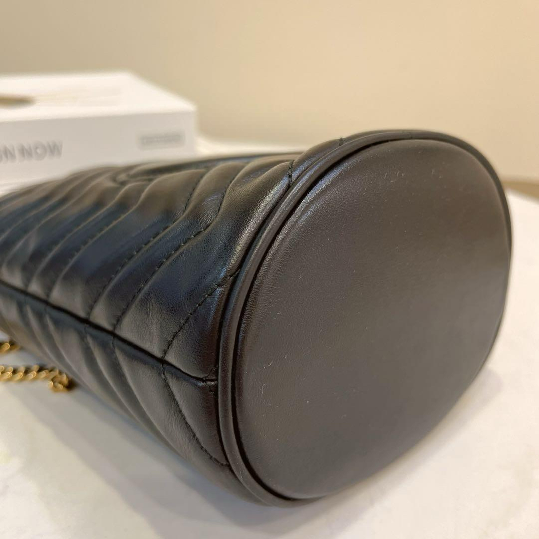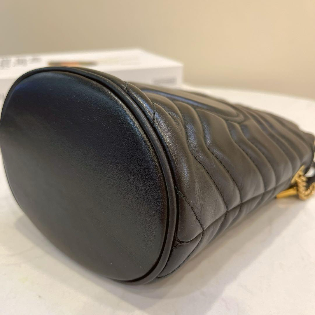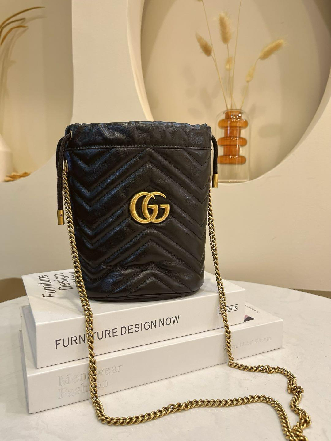 【商品詳情】正品二手 Gucci mini 黑金 牛皮 双G 马蒙 水桶包🕰️95新 13x17 配件:肩带 龙虾扣 防尘袋。底部有轻微使用划痕 内里麂皮有正常使用痕迹。解放双手mini包包