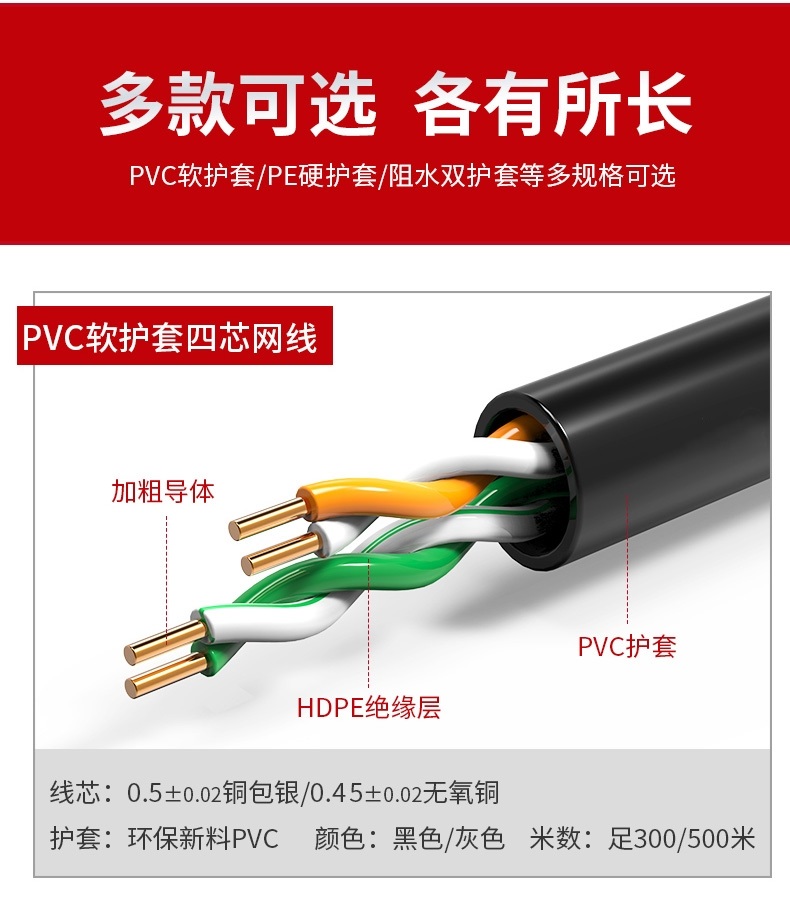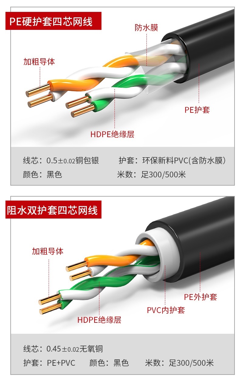 | 室外【4芯加粗0.45无氧铜芯】黑色双护套300米/卷 | HSYV 2*2*0.45 |