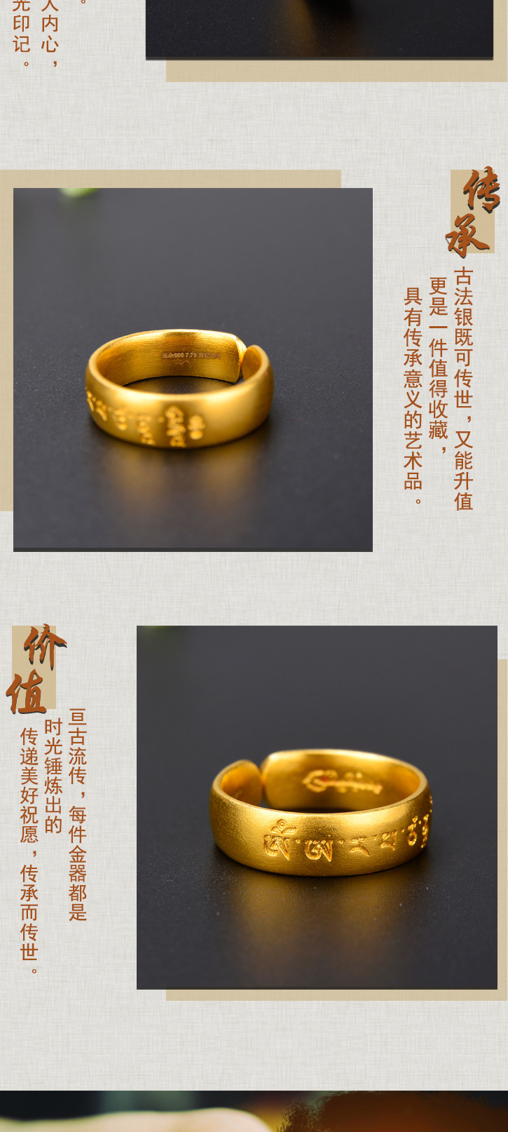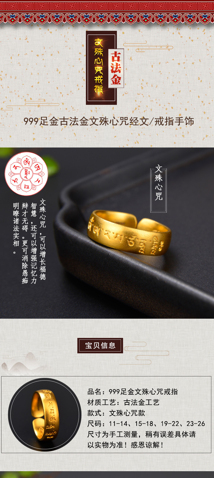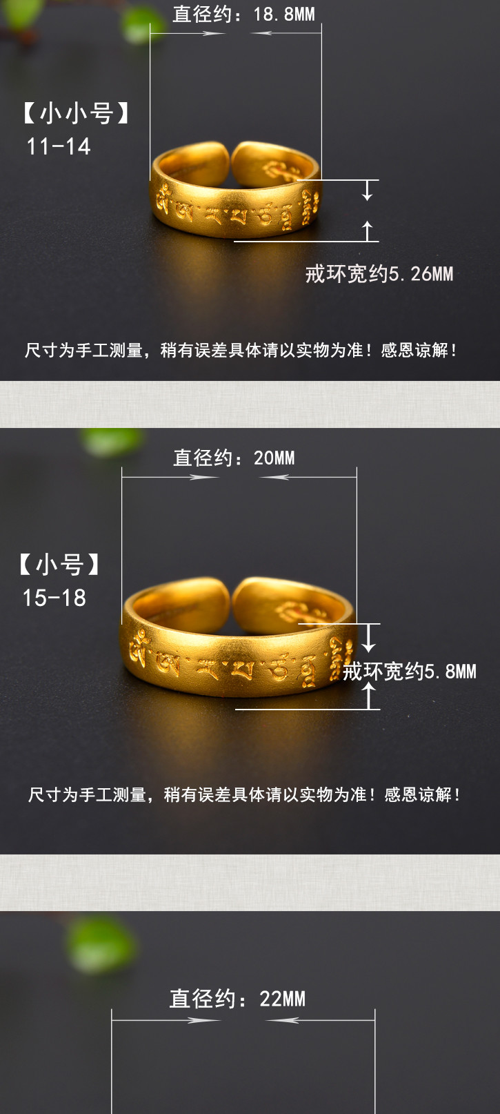 天语龙吟足金 古法黄金文殊心咒戒指黄金戒指男女款可调节