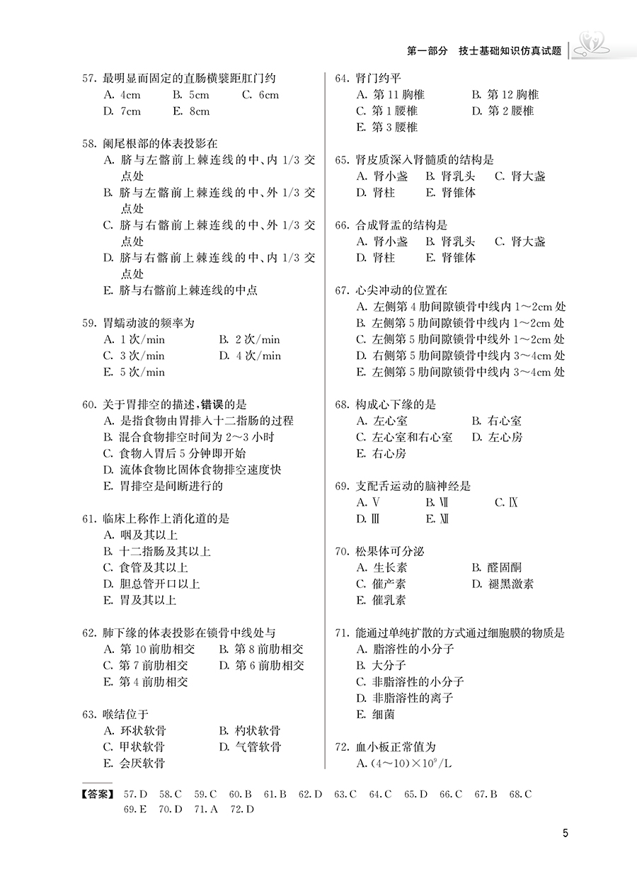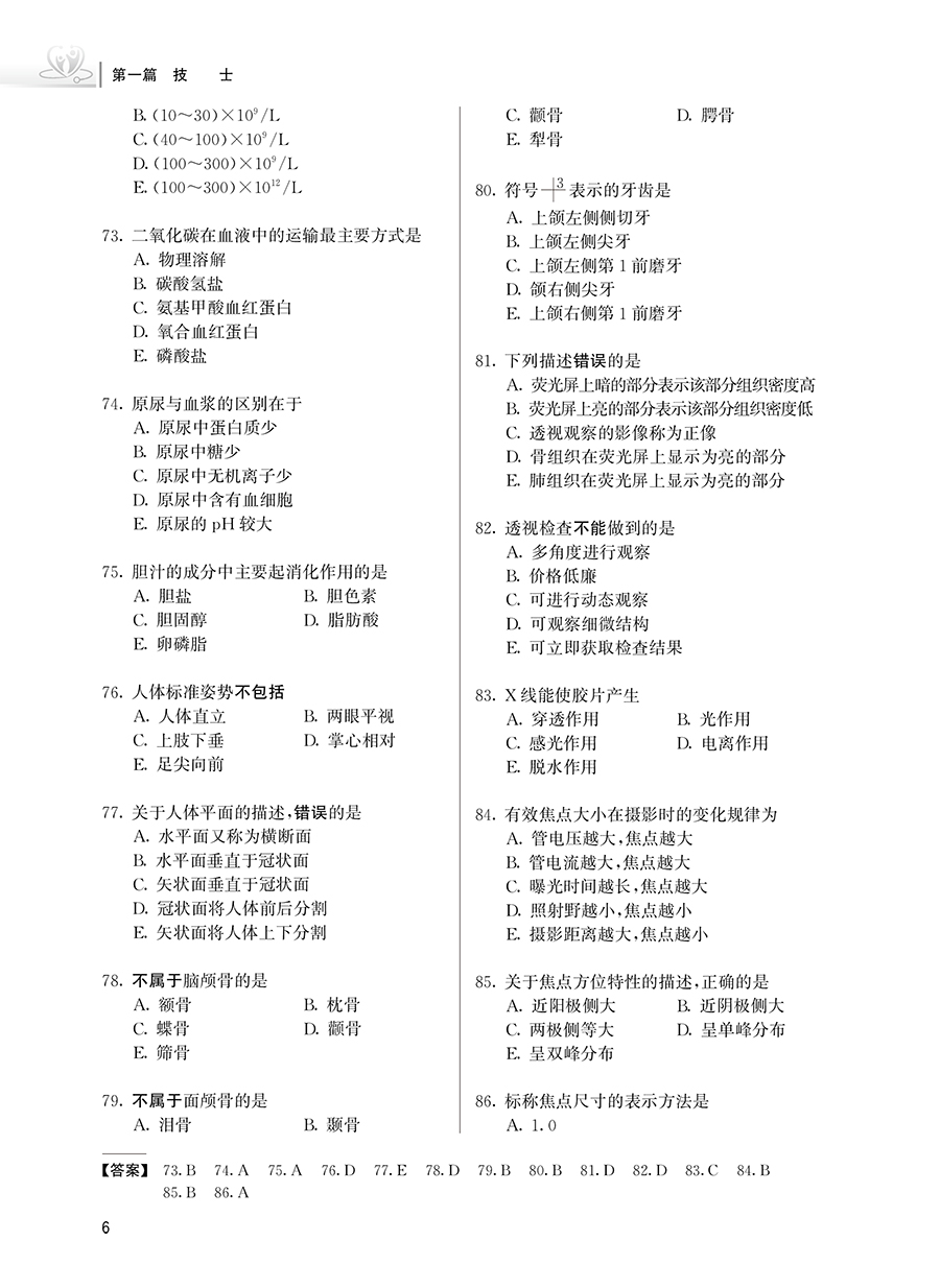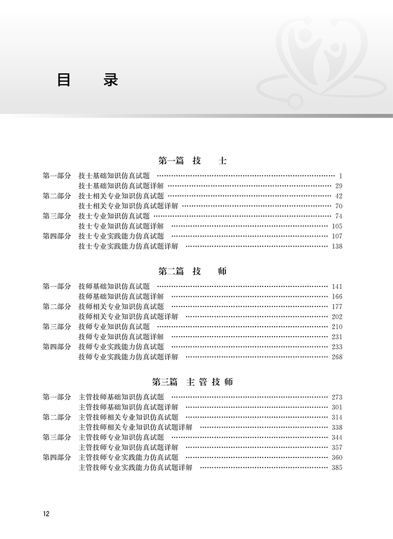 第一篇 技 士 第一部分 技士基础知识仿真试题 / 1 技士基础知识仿真试题详解 / 29 第二部分 技士相关专业知识仿真试题 / 42 技士相关专业知识仿真试题详解 / 70 第三部分 技士专业知识仿真试题 / 74 技士专业知识仿真试题详解 / 105 第四部分 技士专业实践能力仿真试题 / 107 技士专业实践能力仿真试题详解 / 138 第二篇 技 师 第一部分 技师基础知识仿真试题 / 141 技师基础知识仿真试题详解 / 166 第二部分 技师相关专业知识仿真试题 / 177 技师相关专业知识仿真试题详解 / 202 第三部分 技师专业知识仿真试题 / 210 技师专业知识仿真试题详解 / 231 第四部分 技师专业实践能力仿真试题 / 233 技师专业实践能力仿真试题详解 / 268 第三篇 主管技师 第一部分 主管技师基础知识仿真试题 / 273 主管技师基础知识仿真试题详解 / 301 第二部分 主管技师相关专业知识仿真试题 / 314 主管技师相关专业知识仿真试题详解 / 338 第三部分 主管技师专业知识仿真试题 / 344 主管技师专业知识仿真试题详解 / 357 第四部分 主管技师专业实践能力仿真试题 / 360 主管技师专业实践能力仿真试题详解 / 385