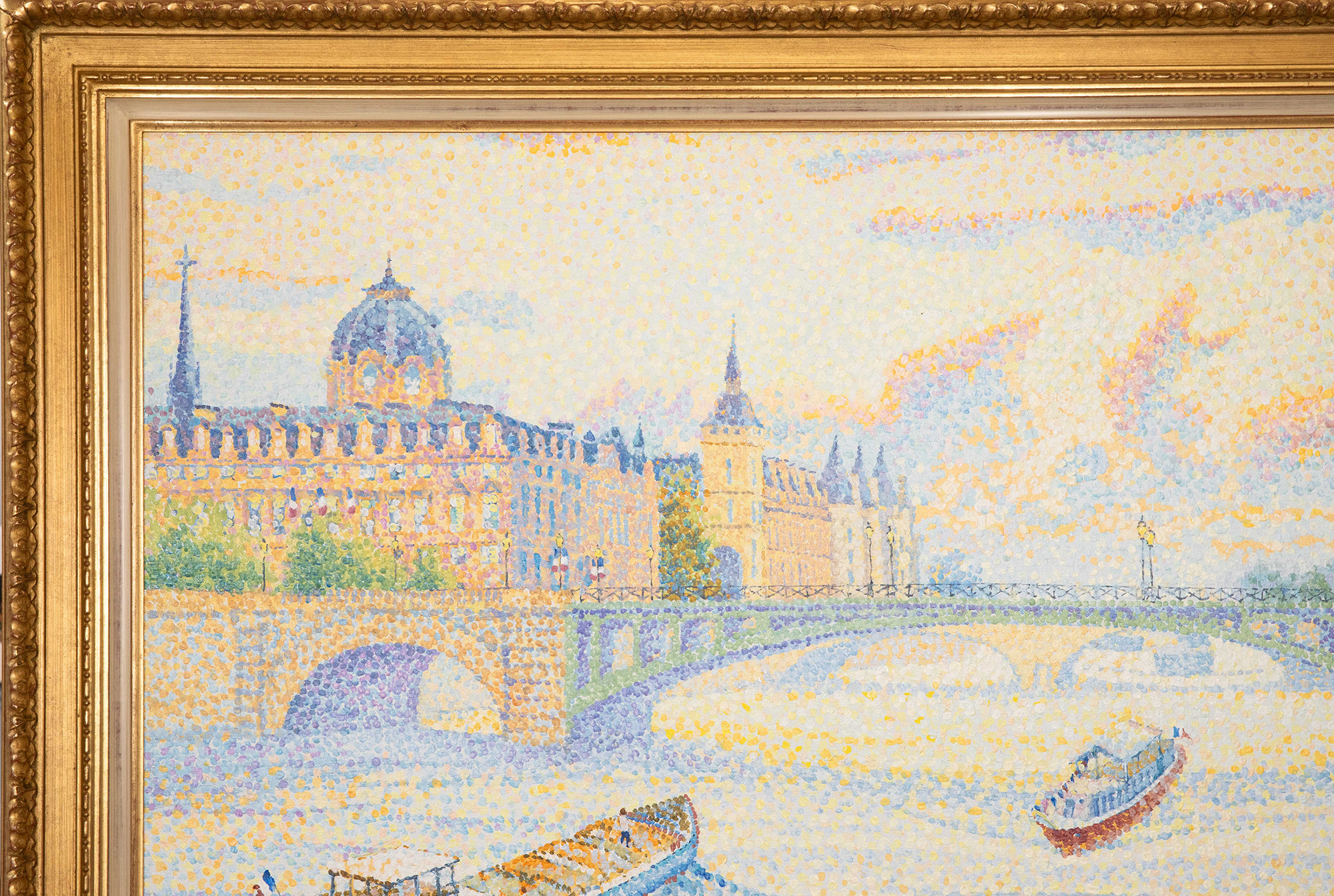 独角鹿西洋古董20世纪法国现代点彩画派名家Yvonne Canu签名创作风景主题布面油画《巴黎塞纳河畔》