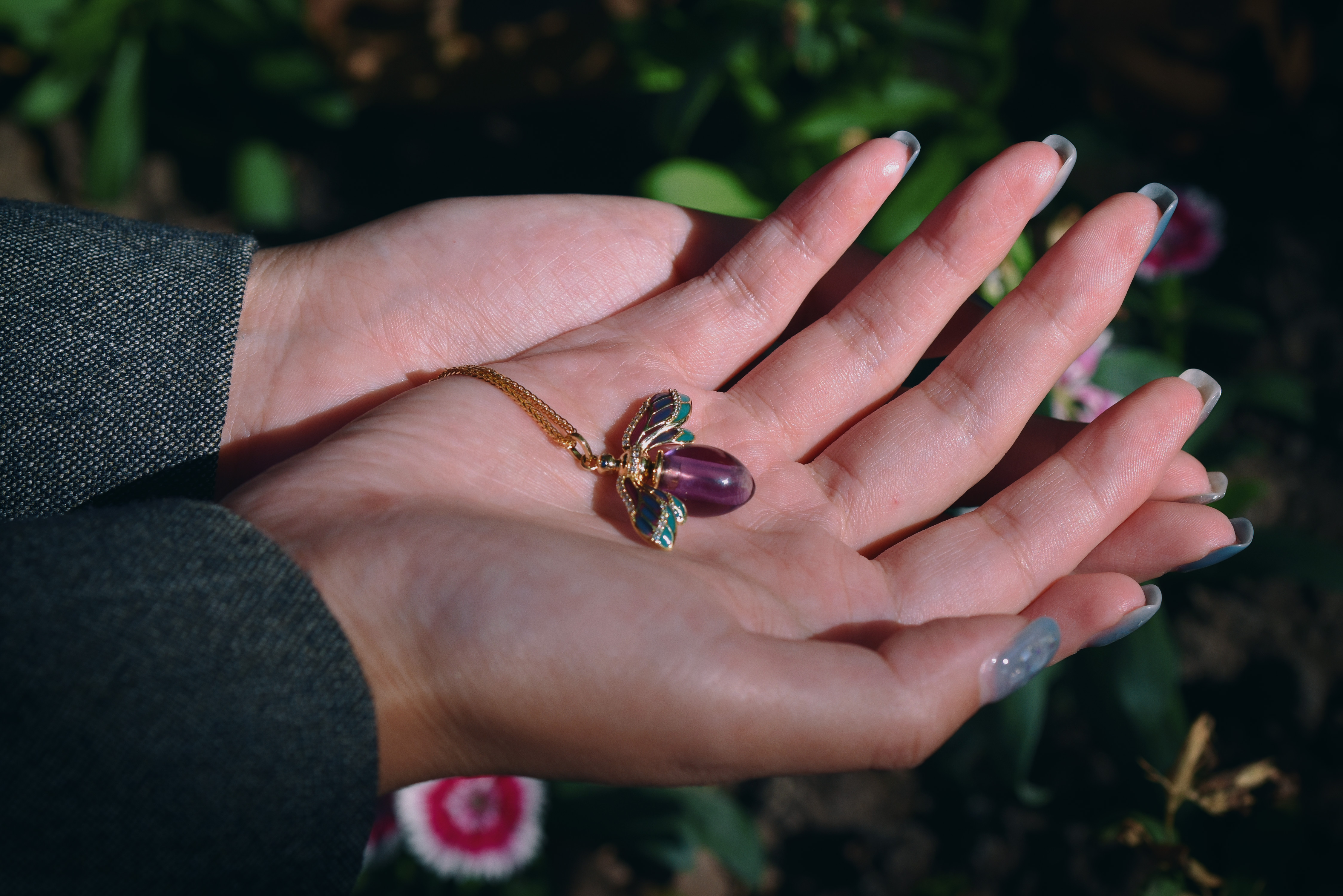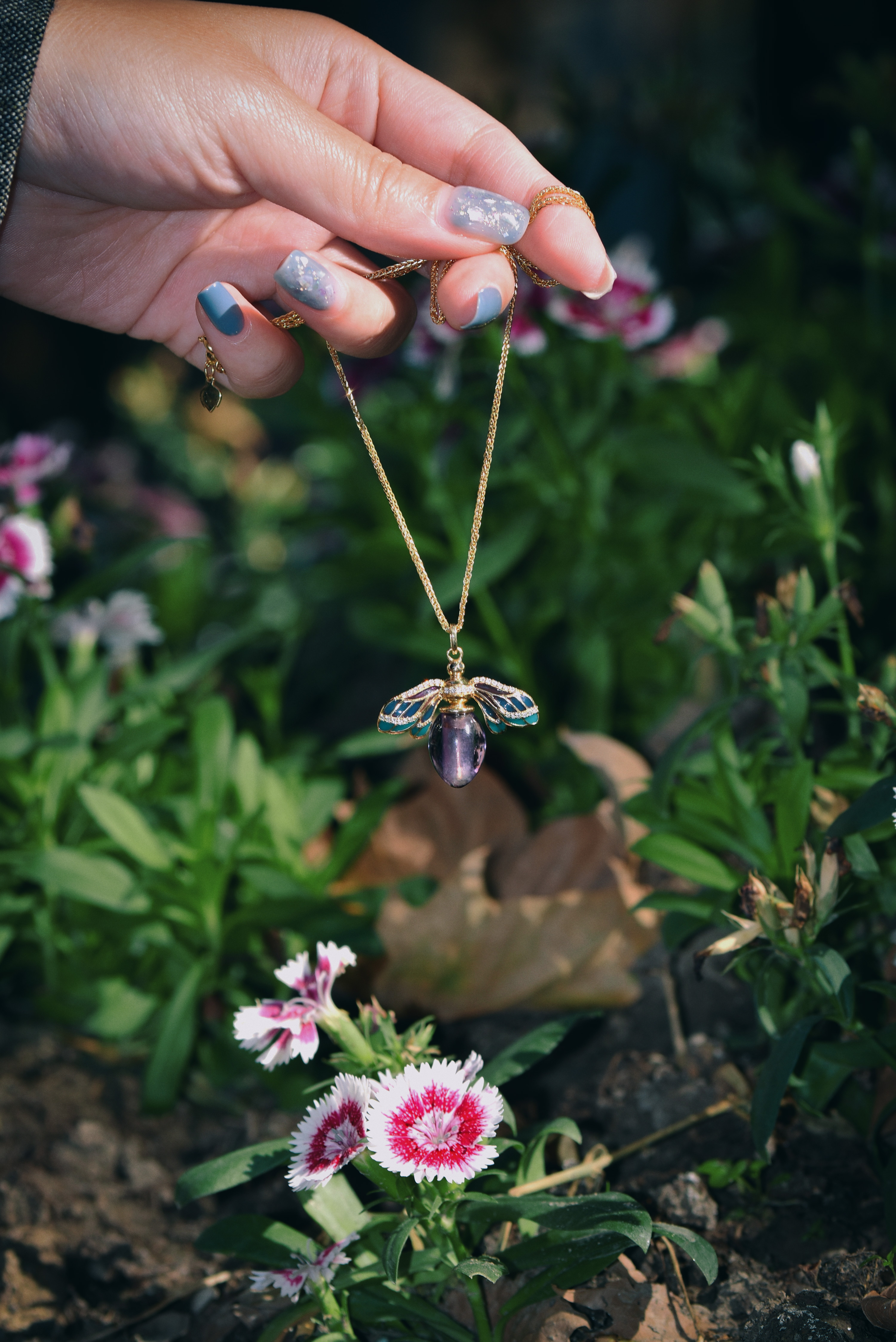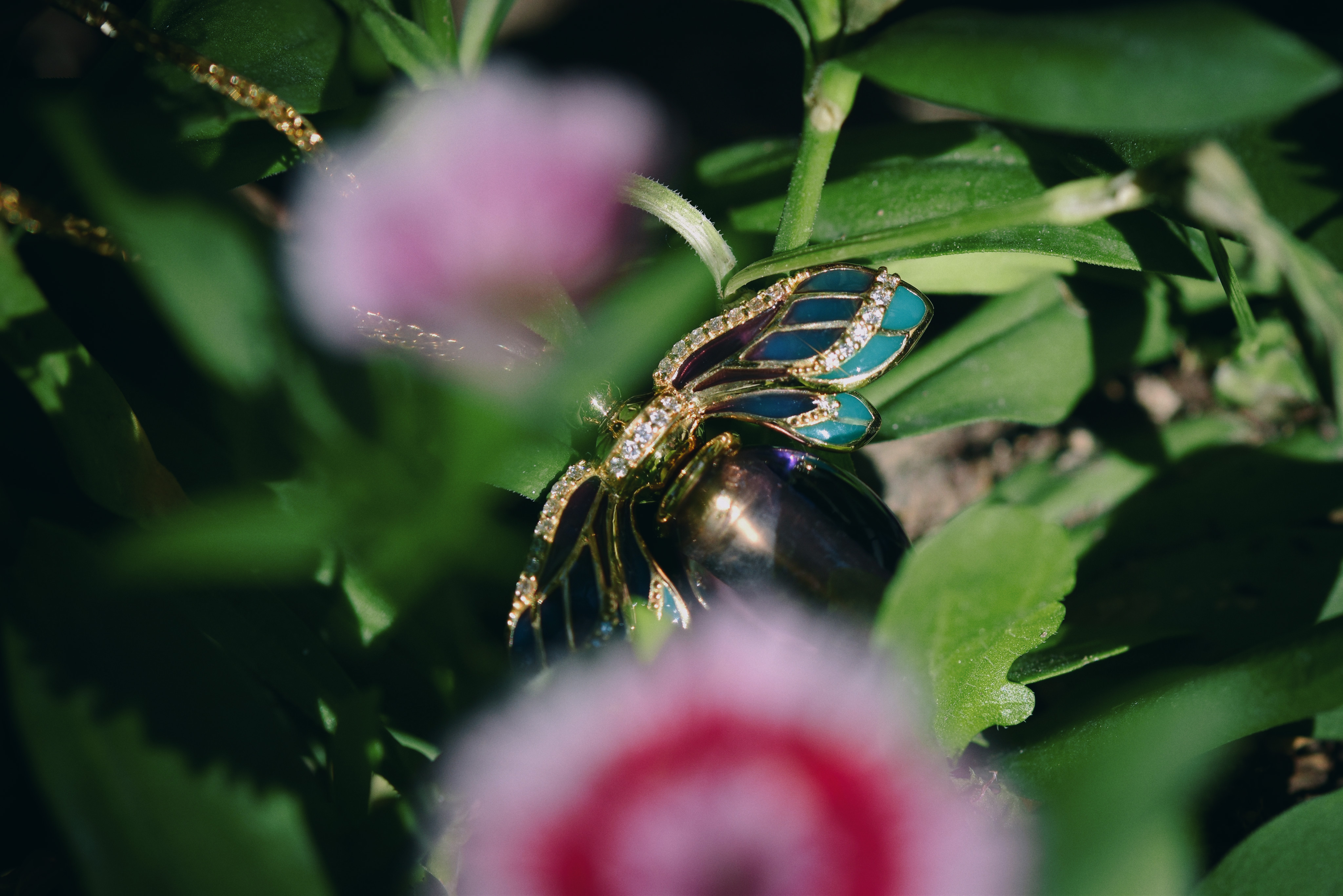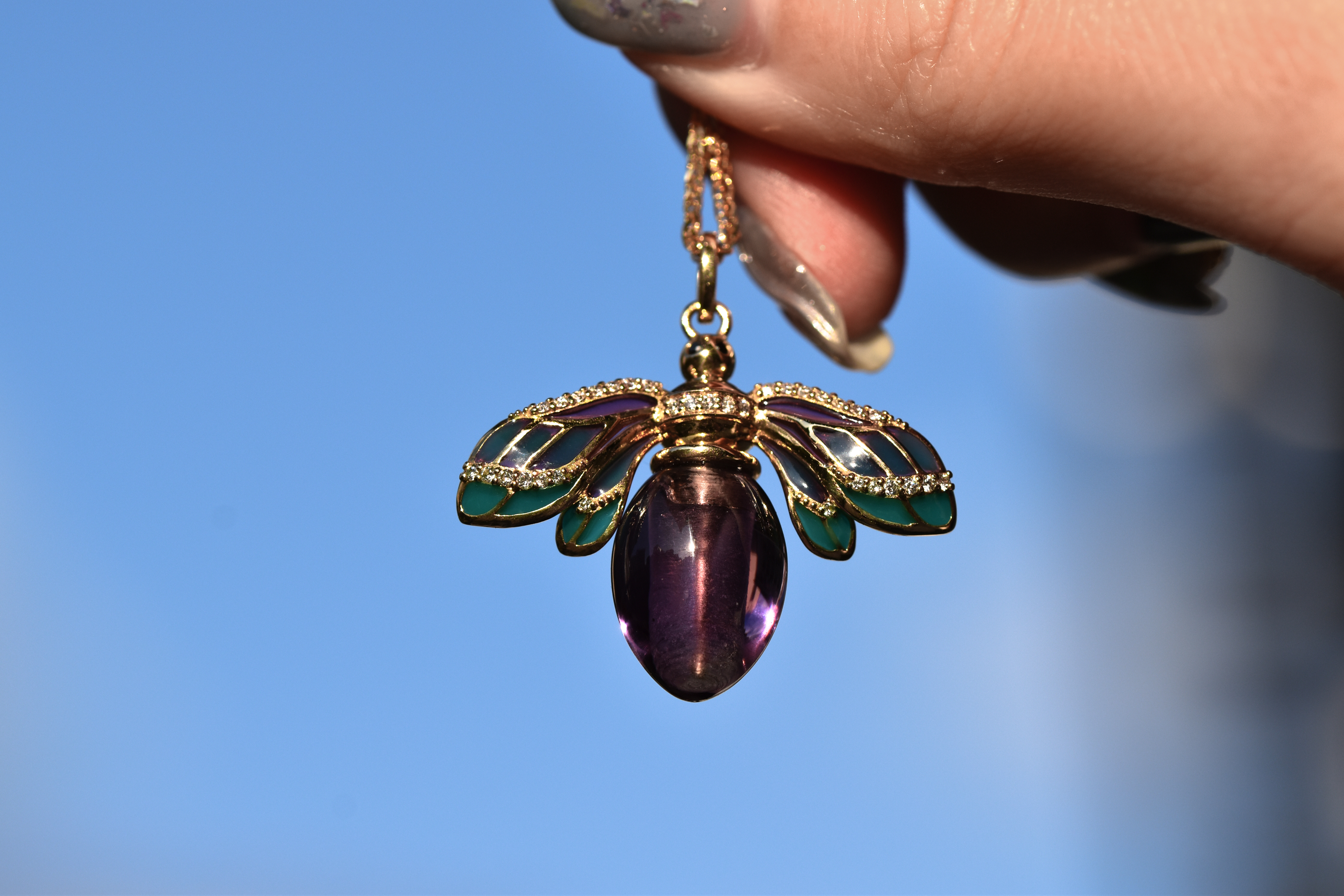 以透光蓝紫色珐琅描绘蜜蜂翅膀