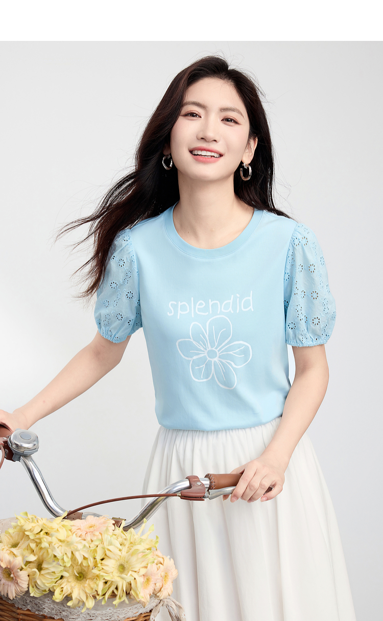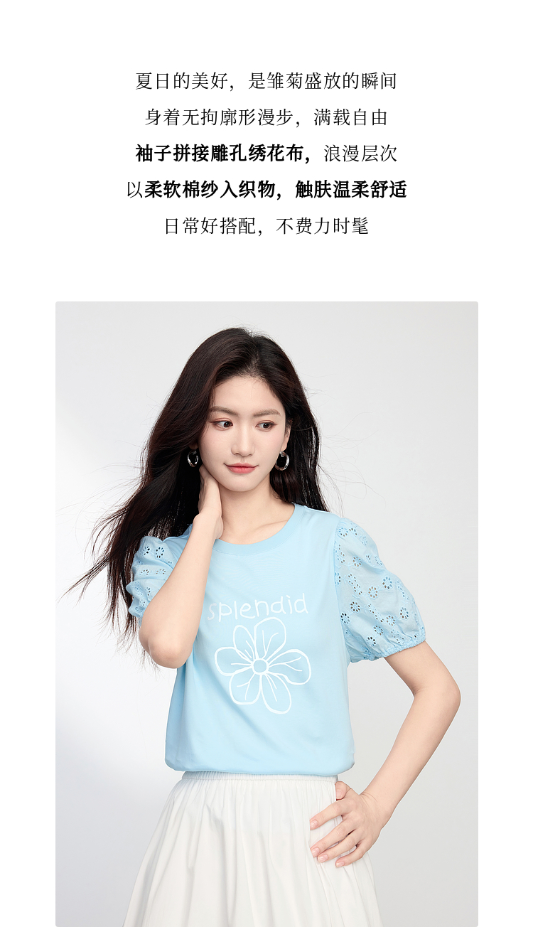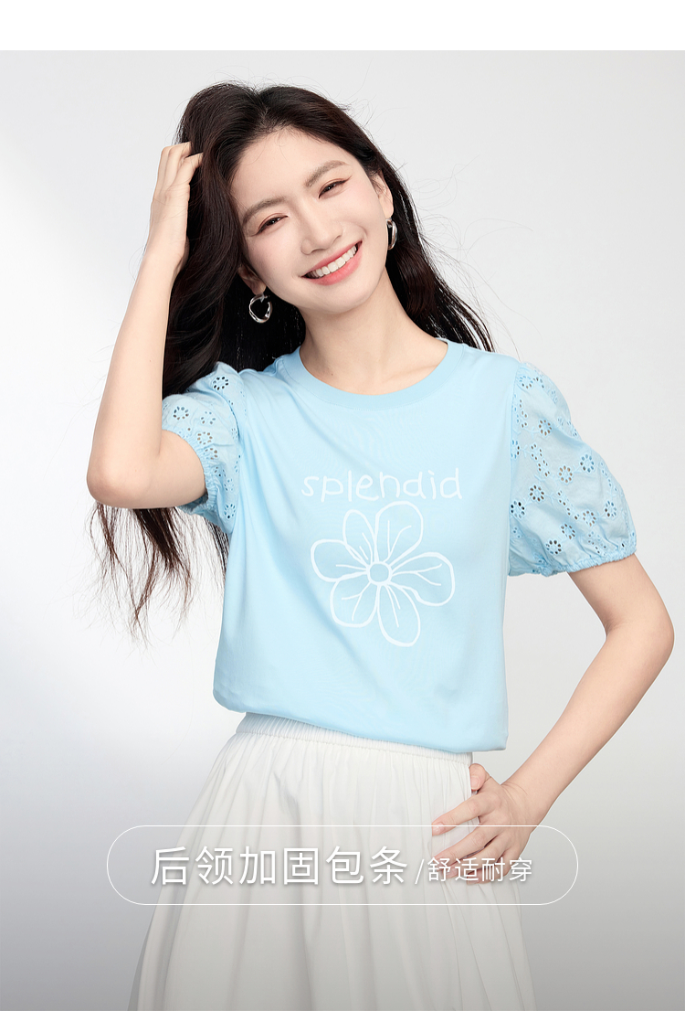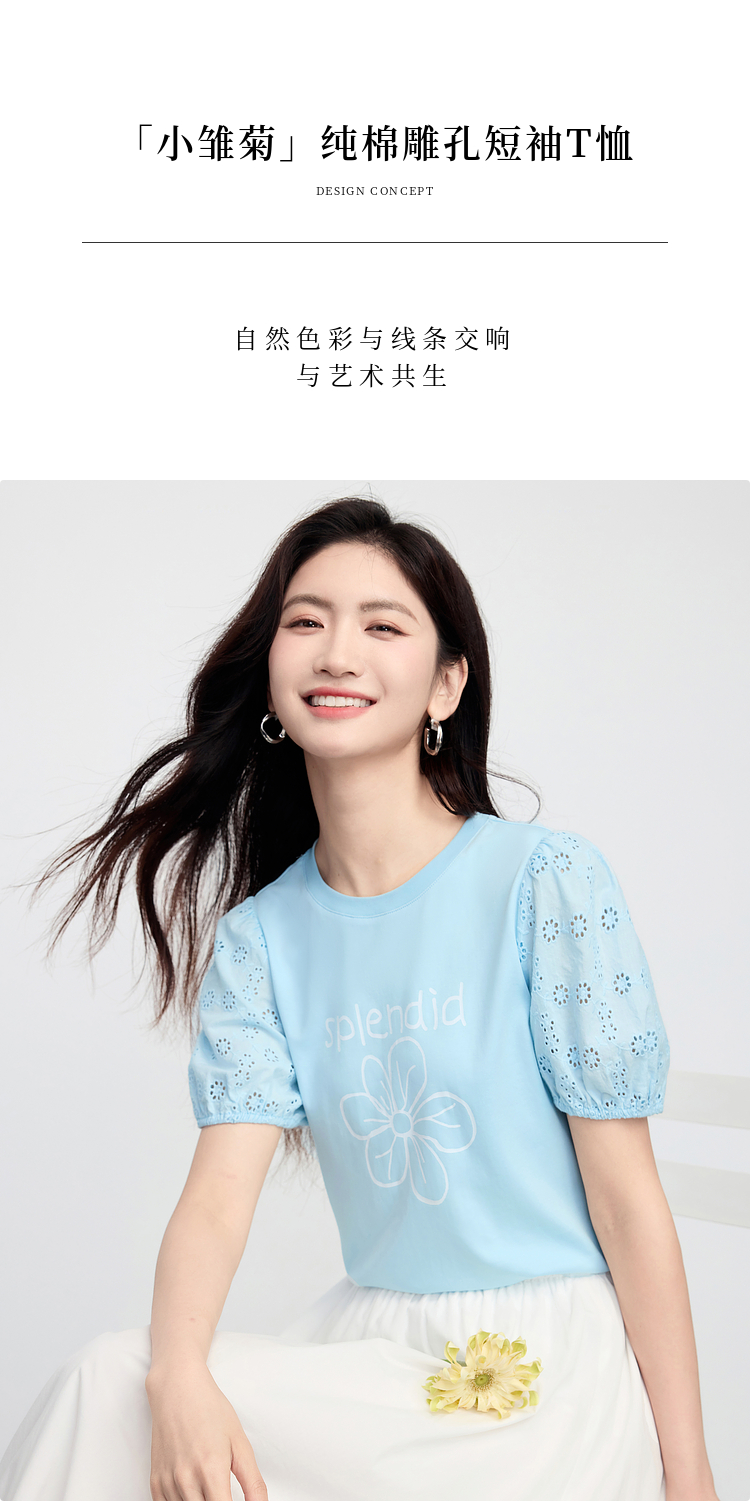 【专属特价】熙世界小雏菊印花T恤女夏季2025新款设计感雕孔短袖体恤纯棉上衣