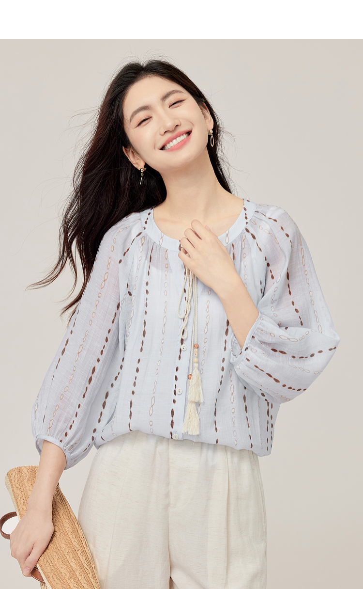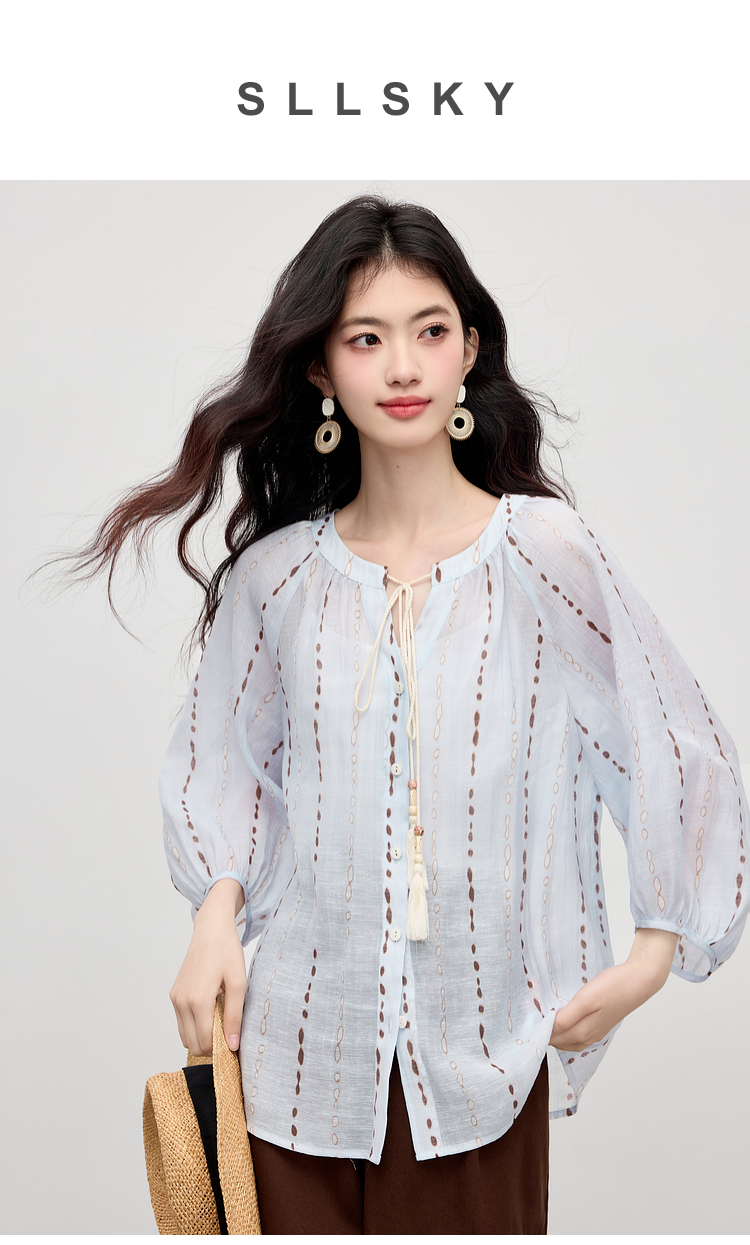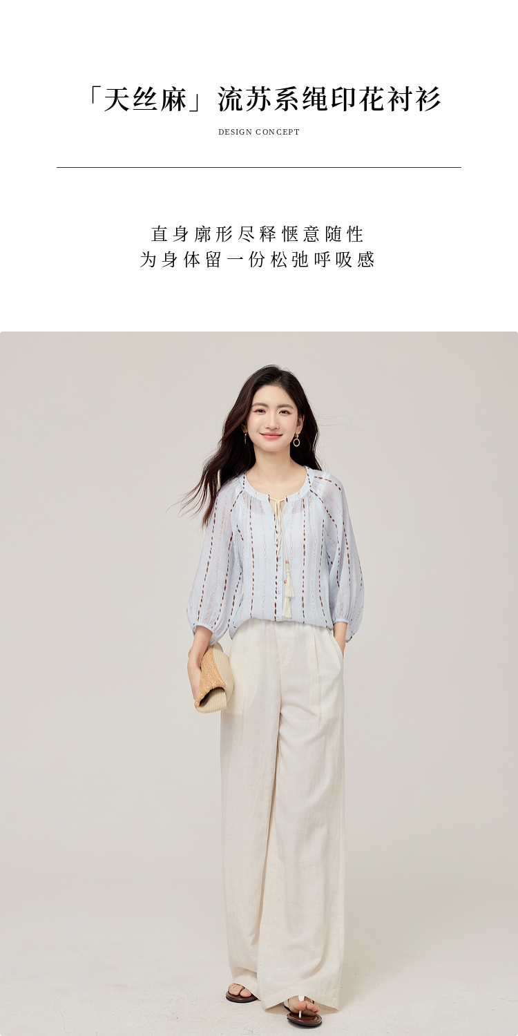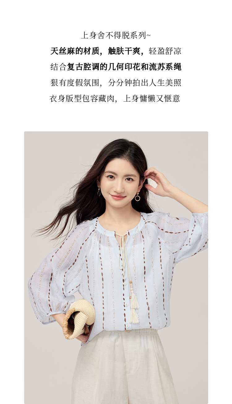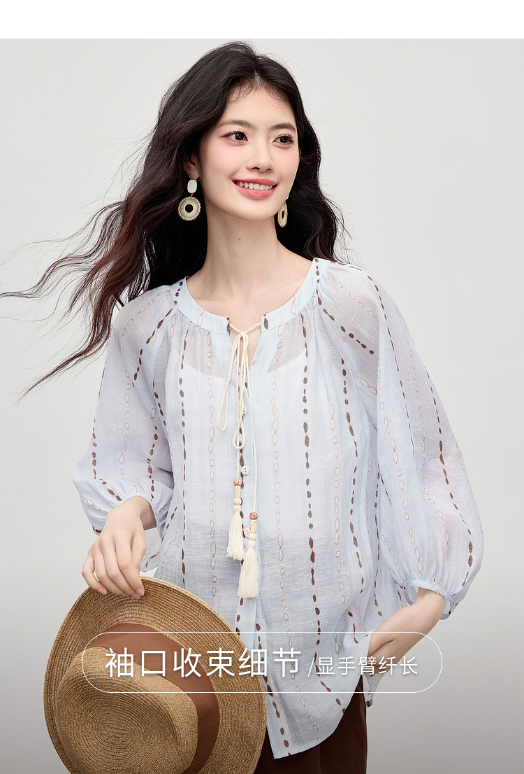【08/06新品】熙世界天丝亚麻七分袖印花衬衫女2025初秋新款设计感独特漂亮上衣