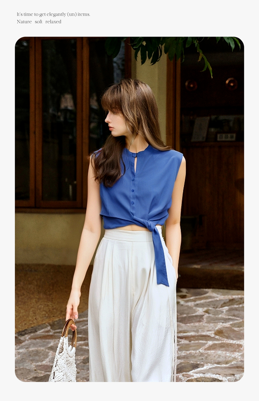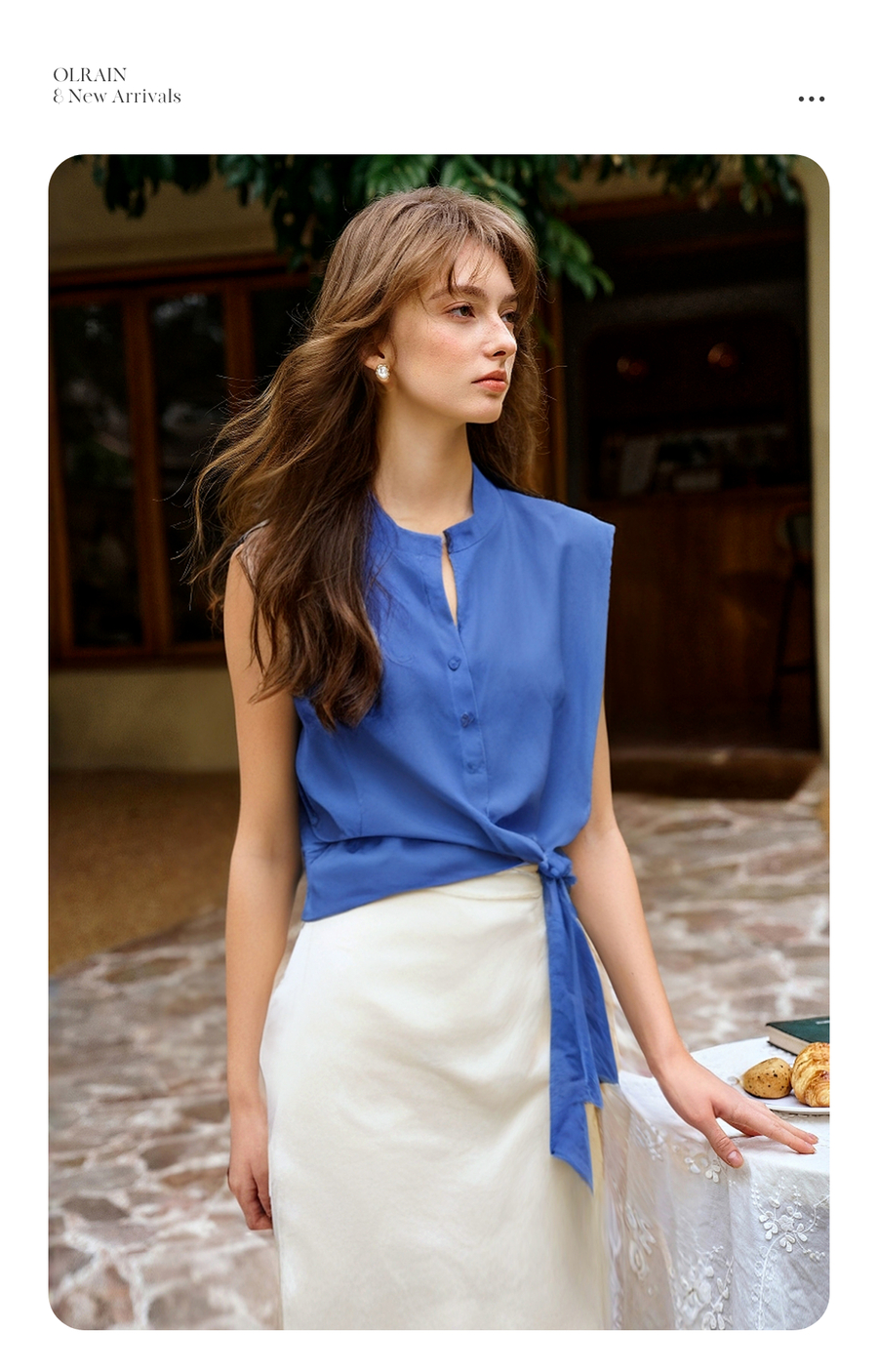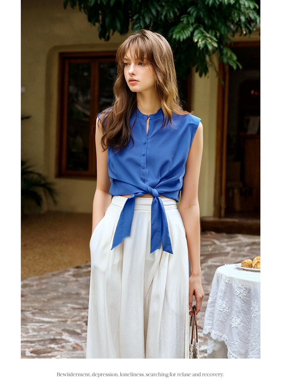 olrain欧芮儿2025夏季新款蓝色绑带设计设计感无袖衬衫上衣衬衣女