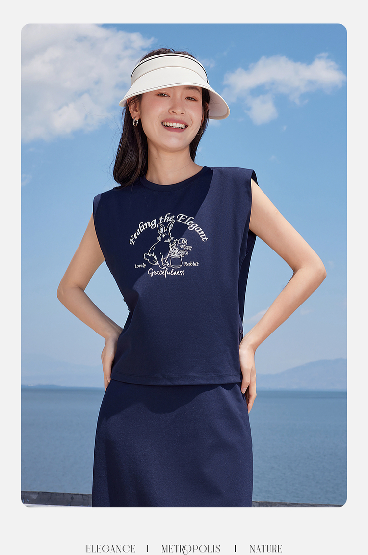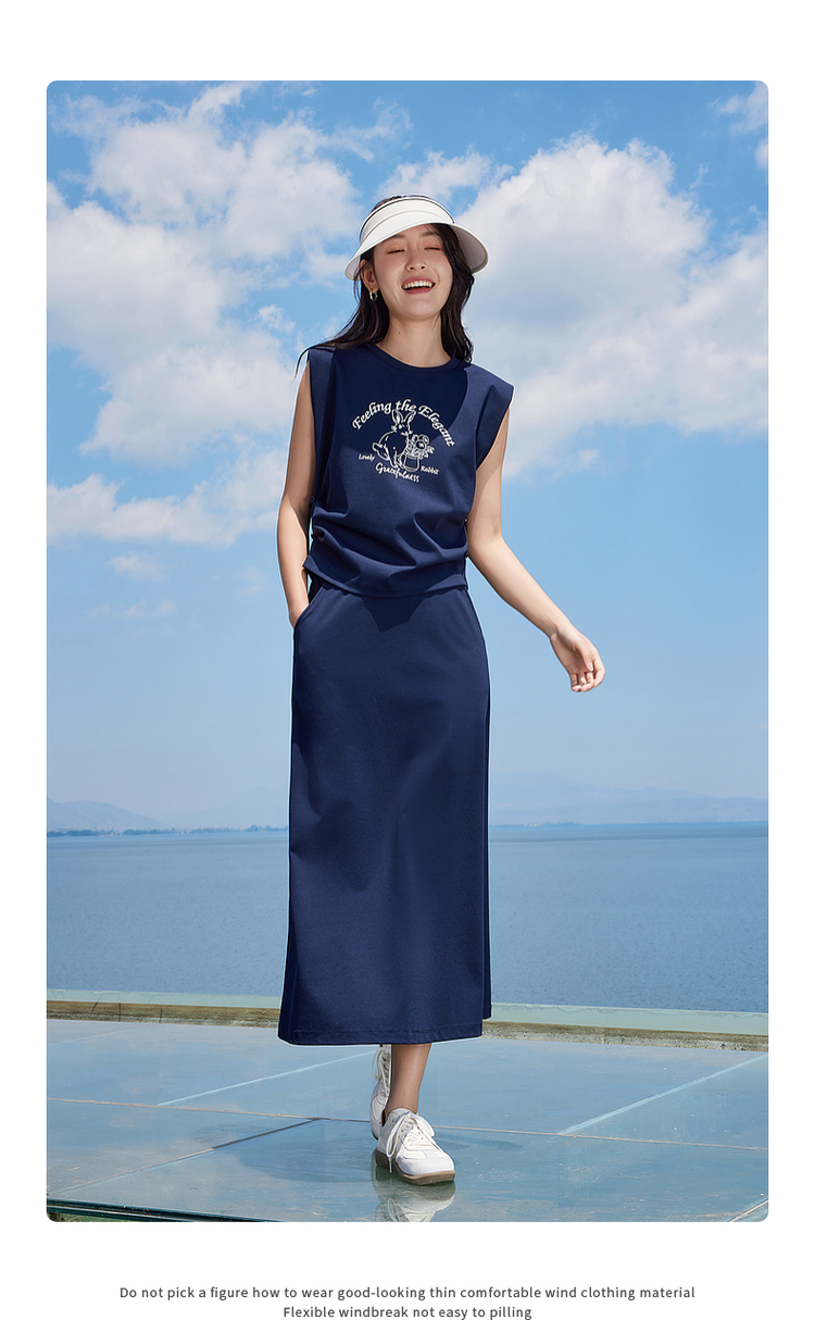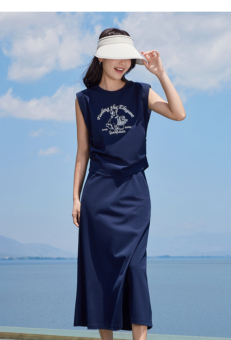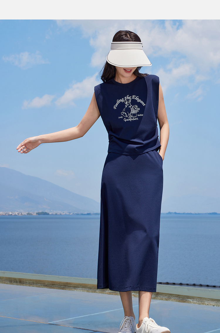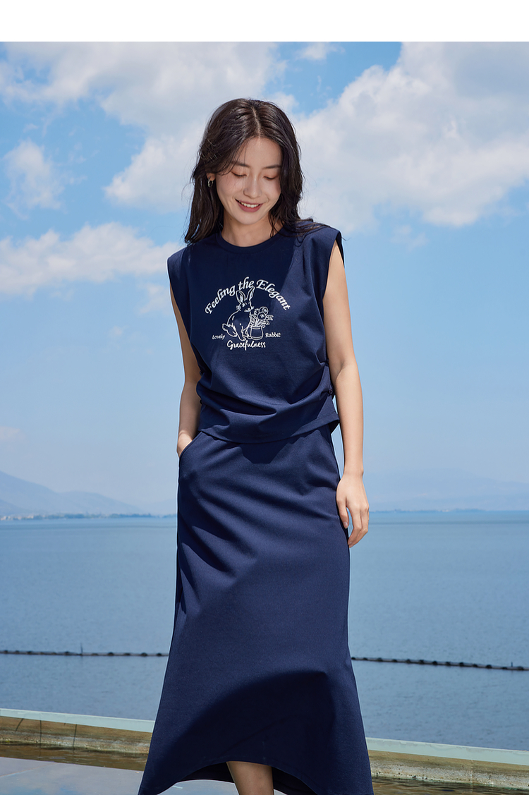 【专属特价】熙世界2025夏女装美式复古印花小飞袖背心高腰半身长裙两件套装