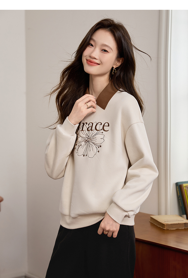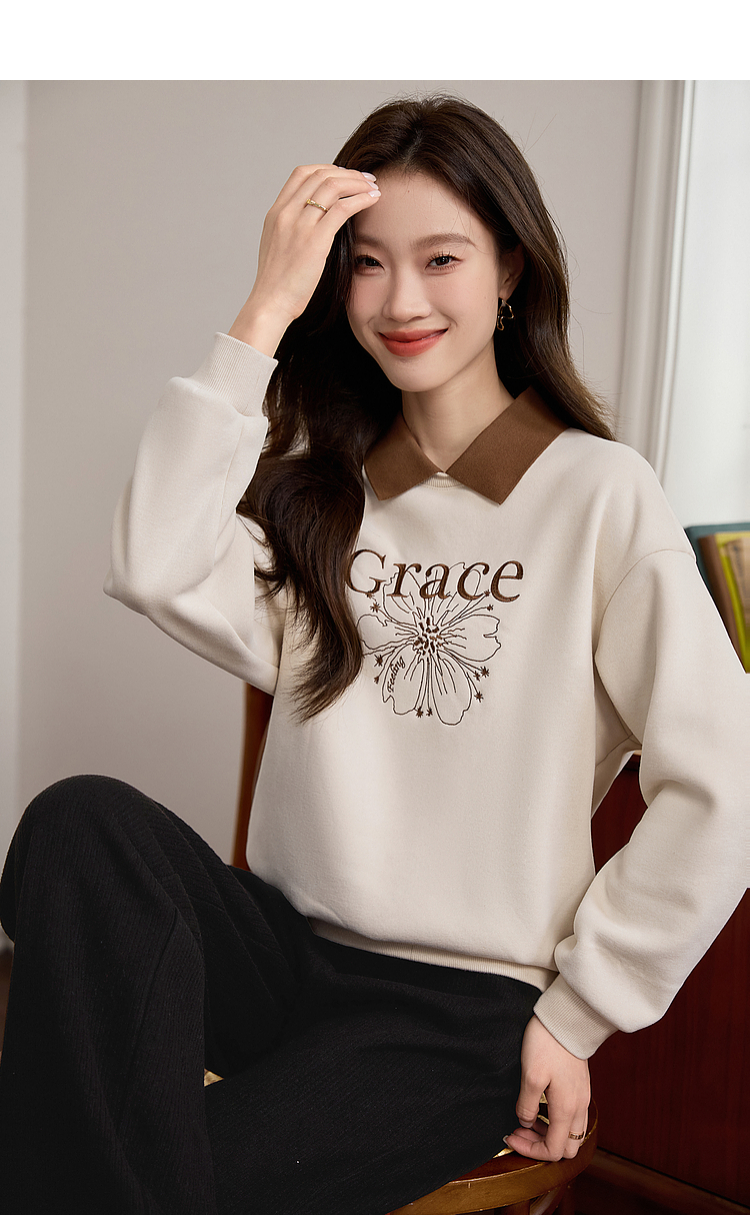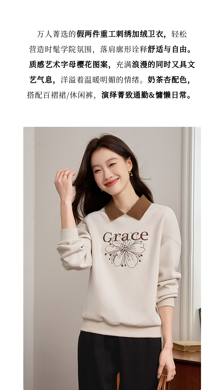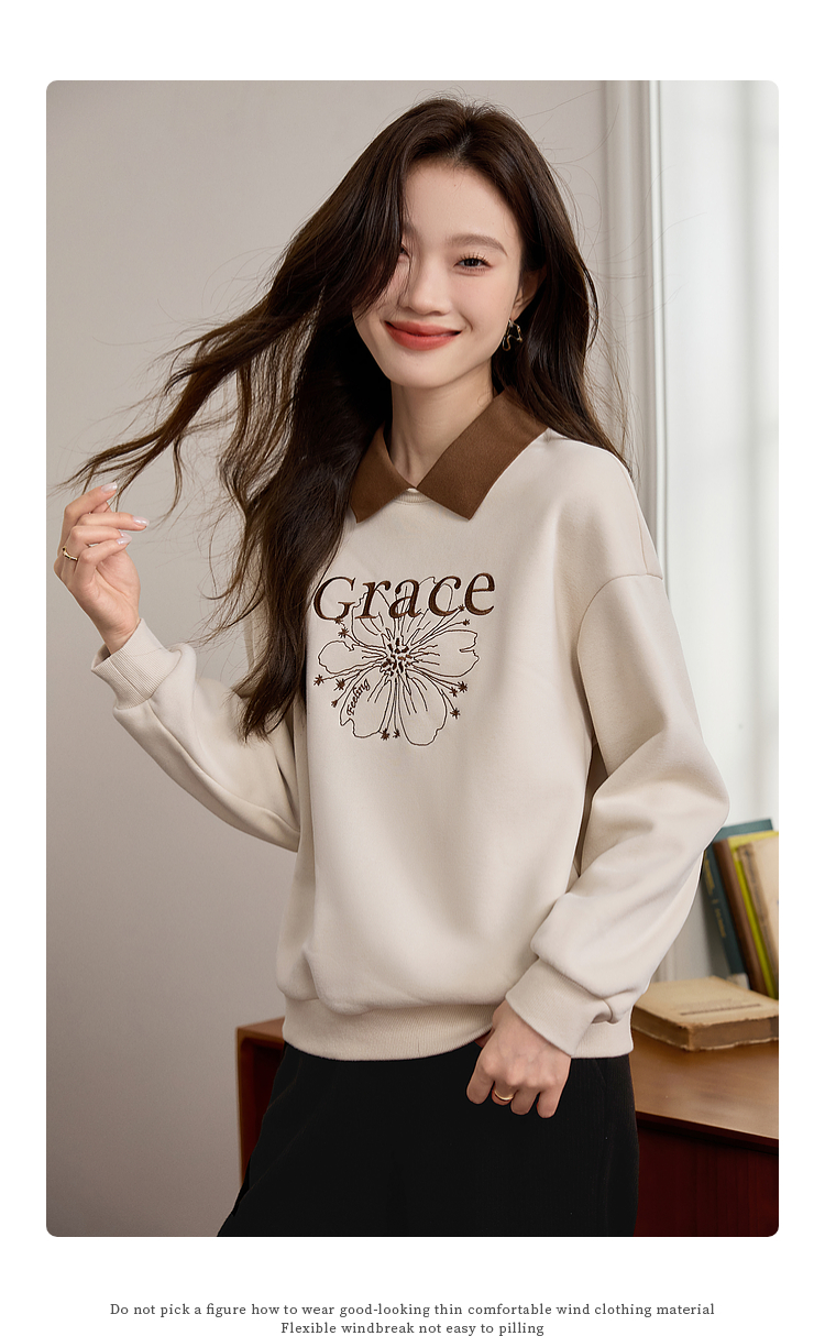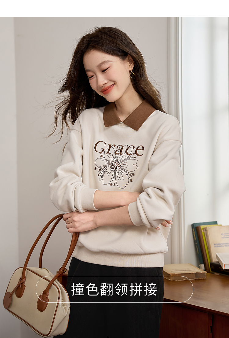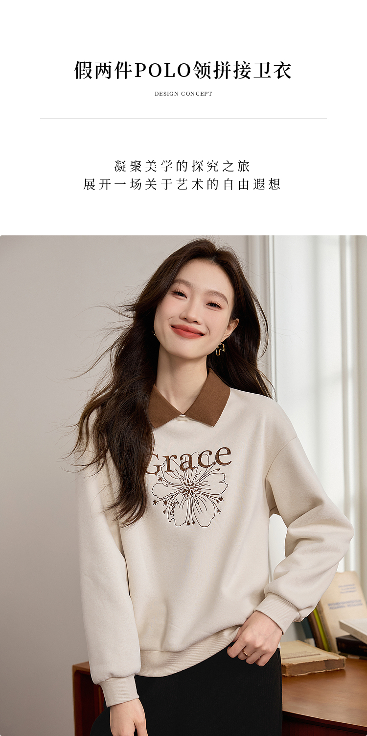 【年中特卖】熙世界假两件POLO领拼接卫衣女加绒秋冬季时尚字母印花套头上衣