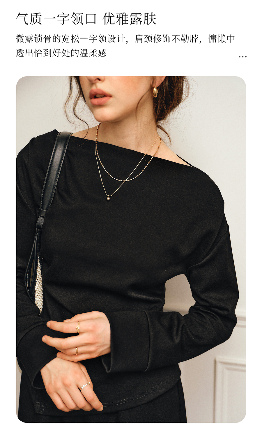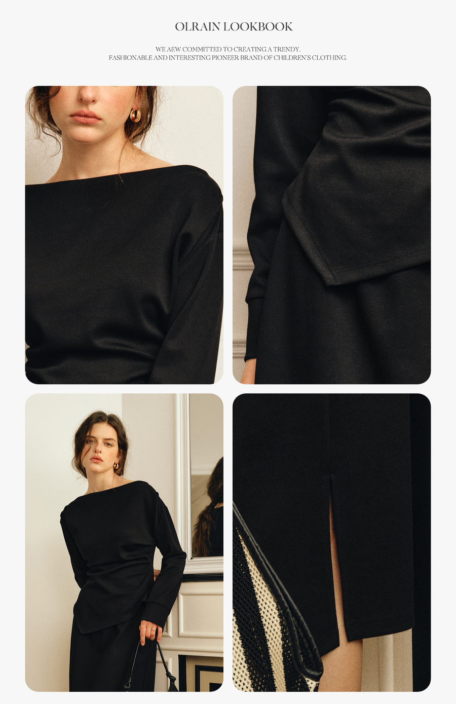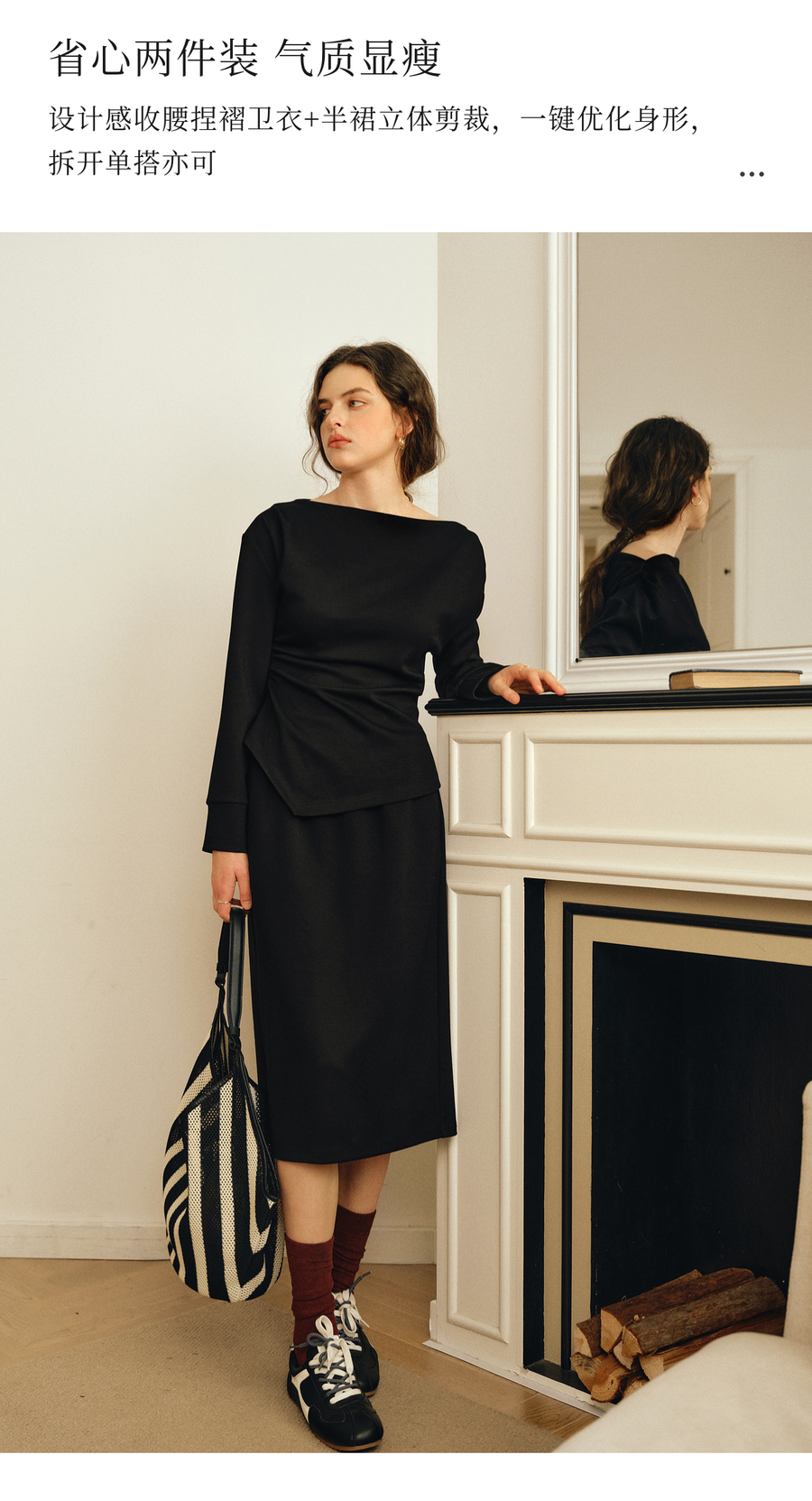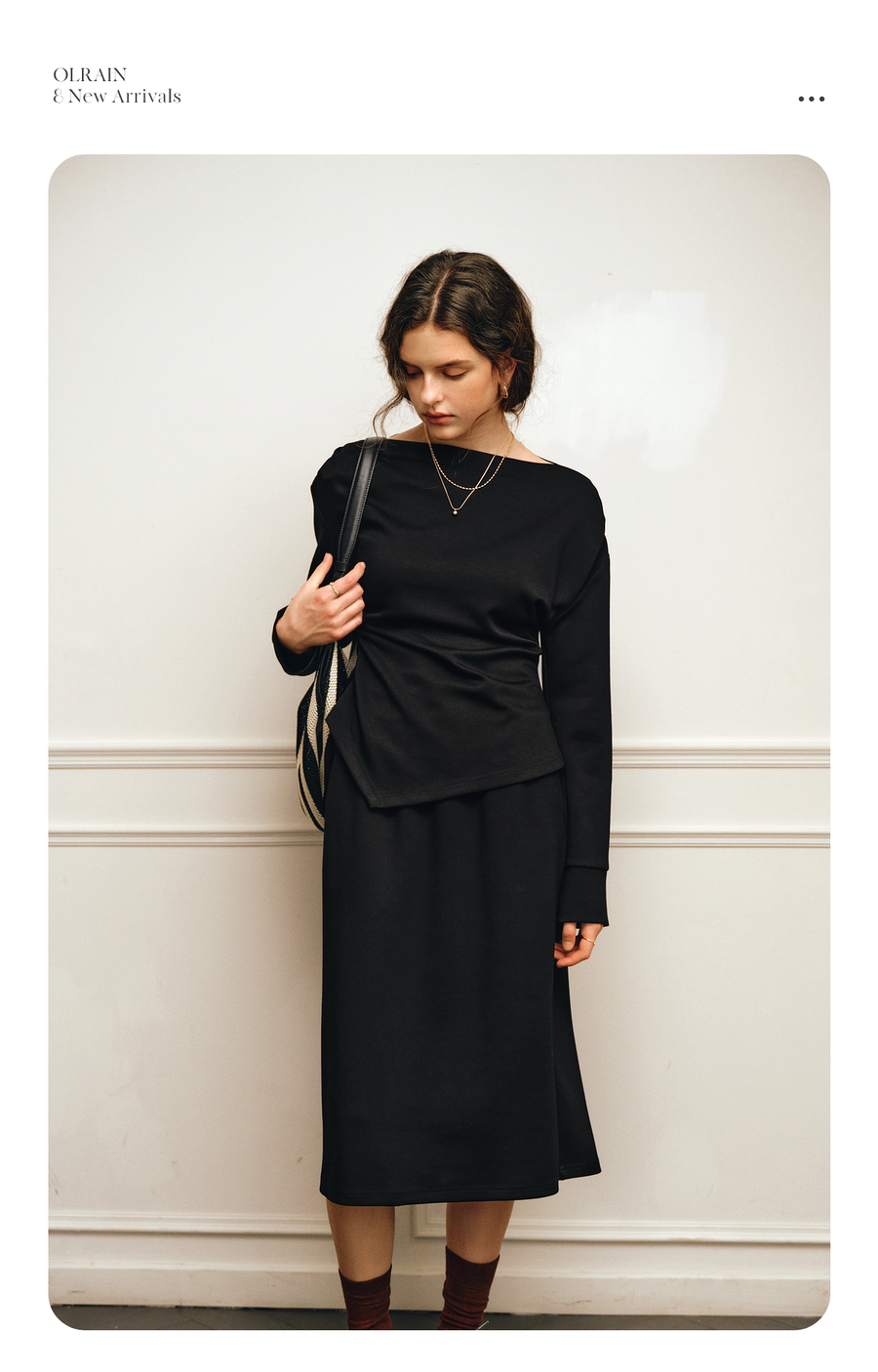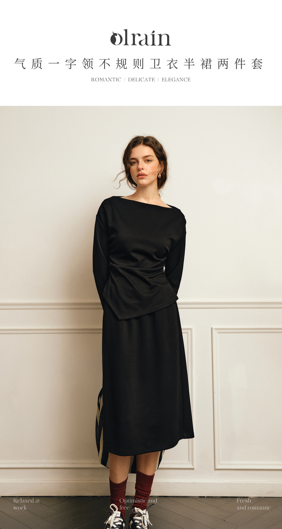 OLrain欧芮儿2025新款女秋季气质一字领不规则黑色卫衣半裙两件套