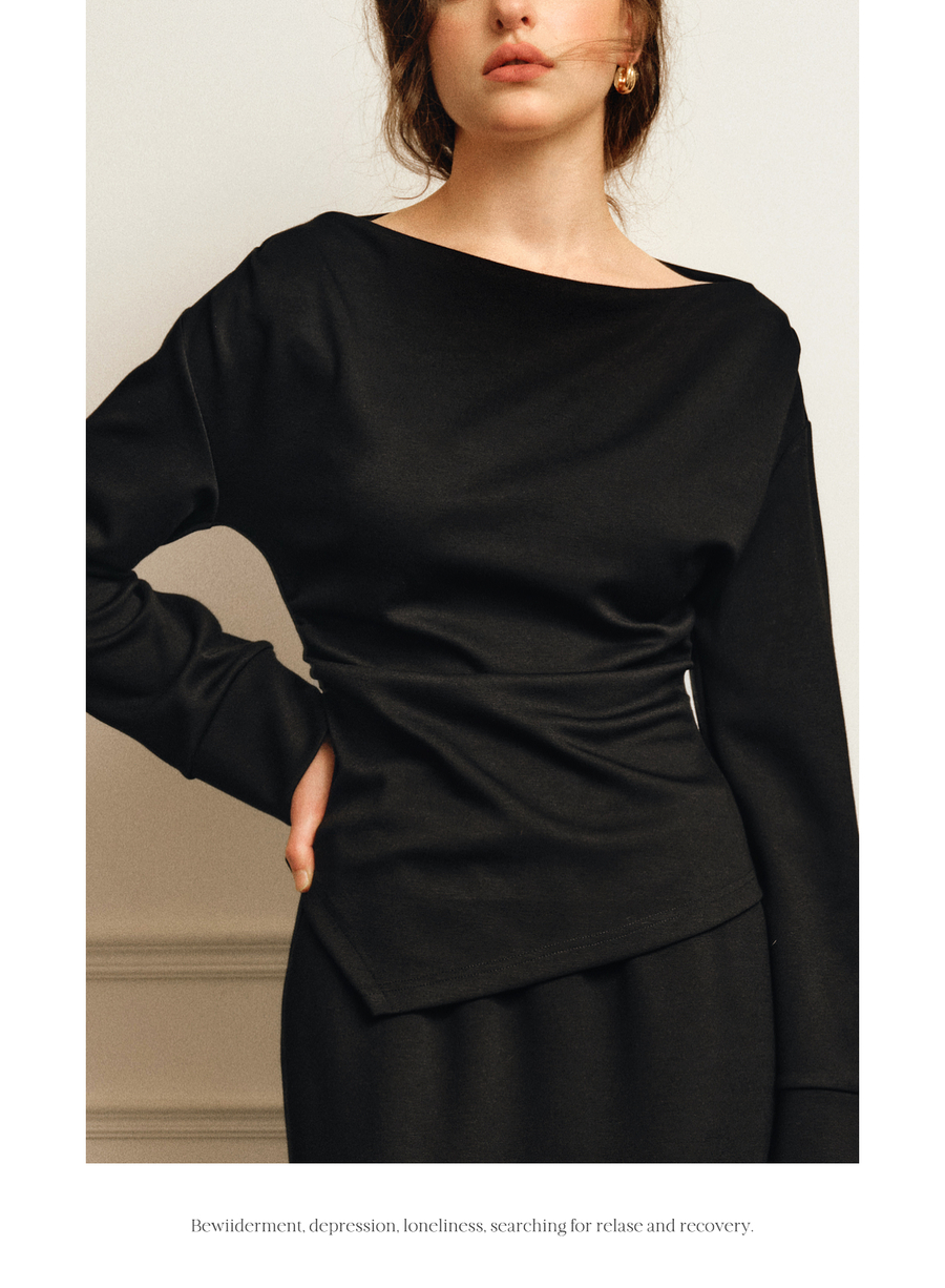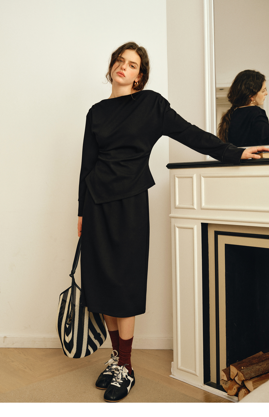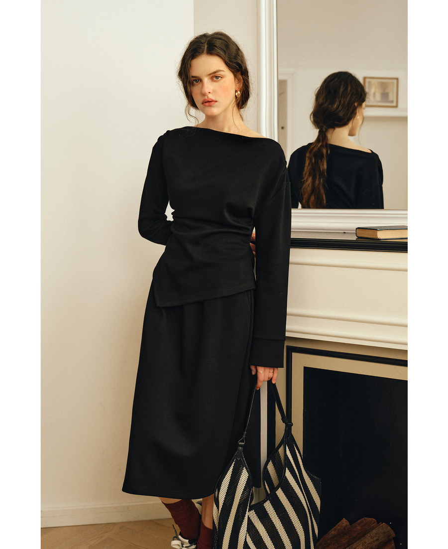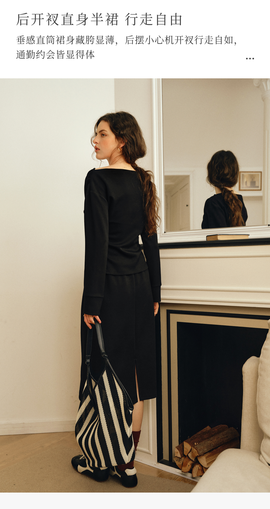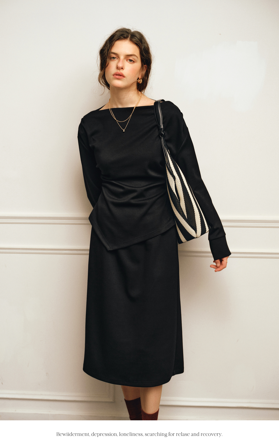OLrain欧芮儿2025新款女秋季气质一字领不规则黑色卫衣半裙两件套