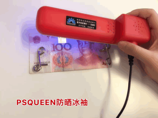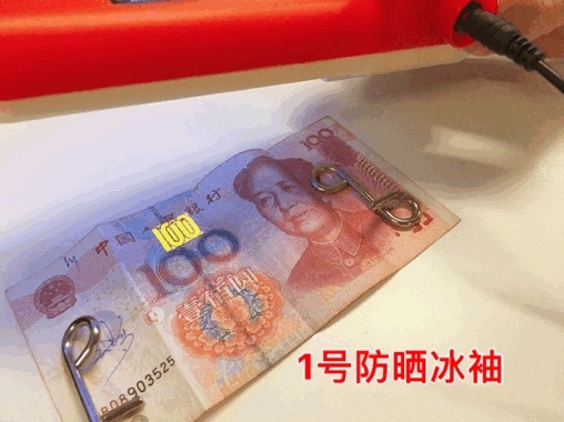 我们可以看到,隔着1号、2号冰袖的紫外线灯,依然能清晰地照出百元钞票上的防伪码↓可见根本看不出能防晒!👇