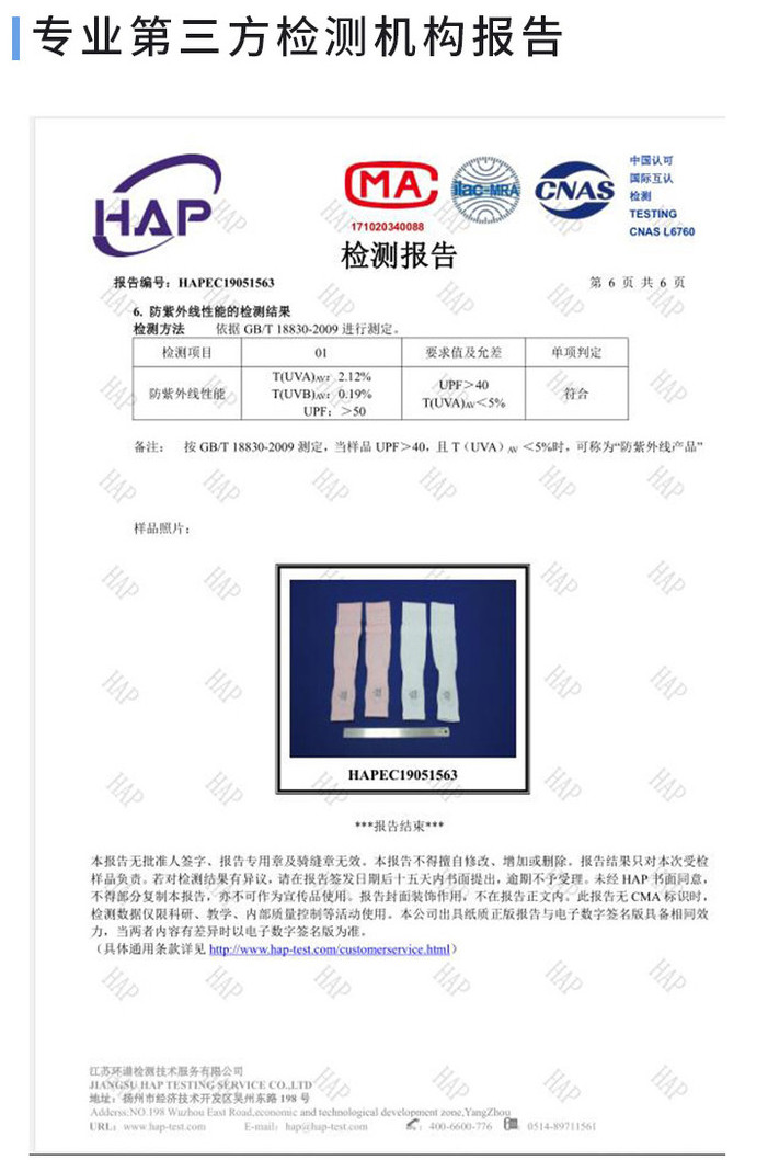 专业检测报告:PSQUEEN防晒冰袖,选用德国进口原料,经特殊工艺处理后,实现了UPF50+,紫外线阻隔率高达98%以上!