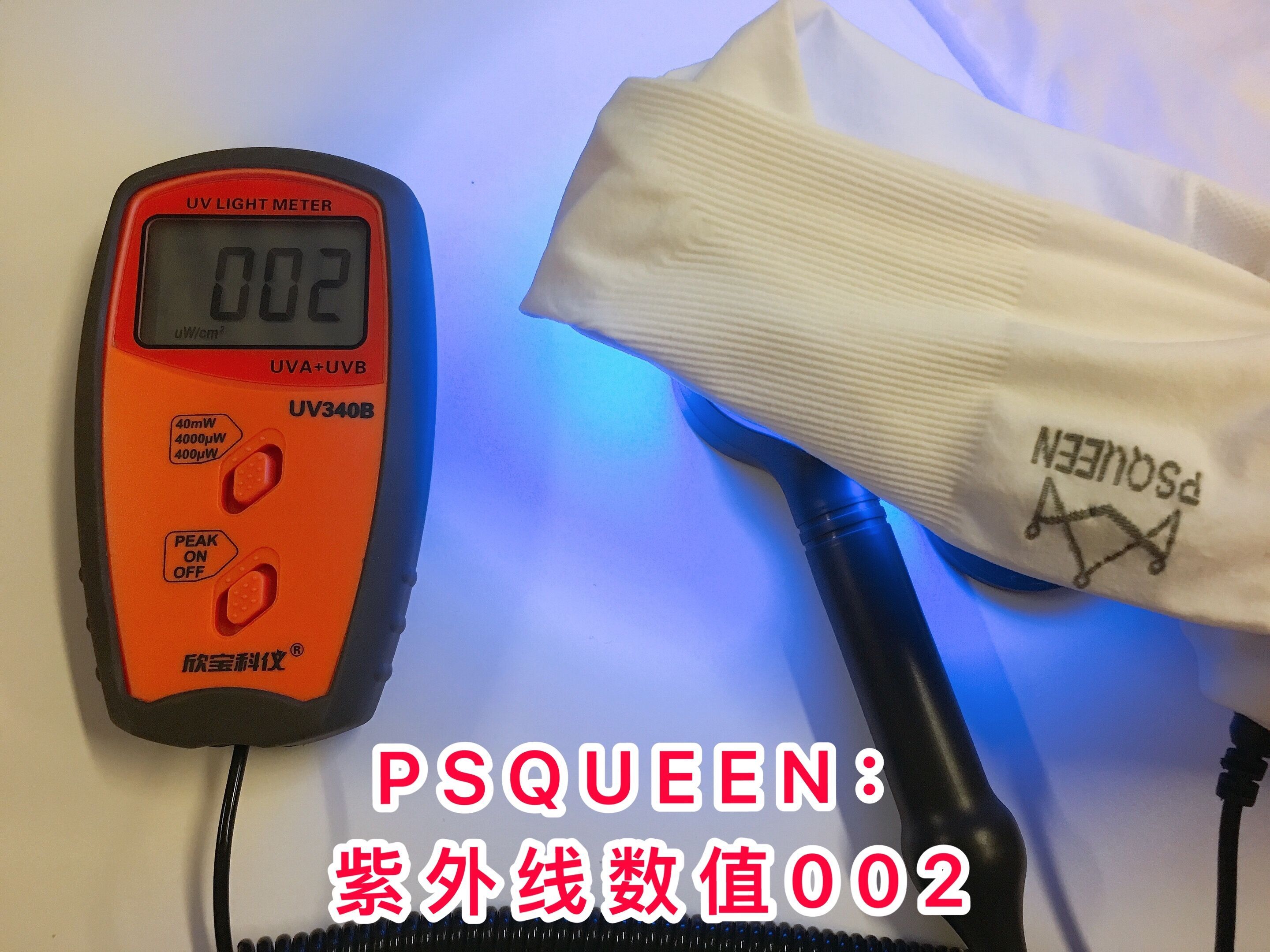 而隔着PSQUEEN防晒冰袖(白色/黑色)的紫外线灯,完全照不出防伪码,这说明它隔离紫外线的效果是真!的!强!👇