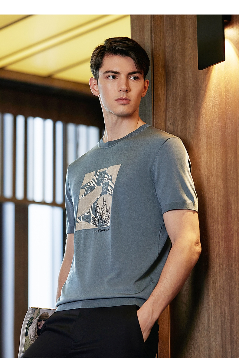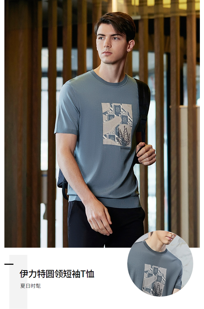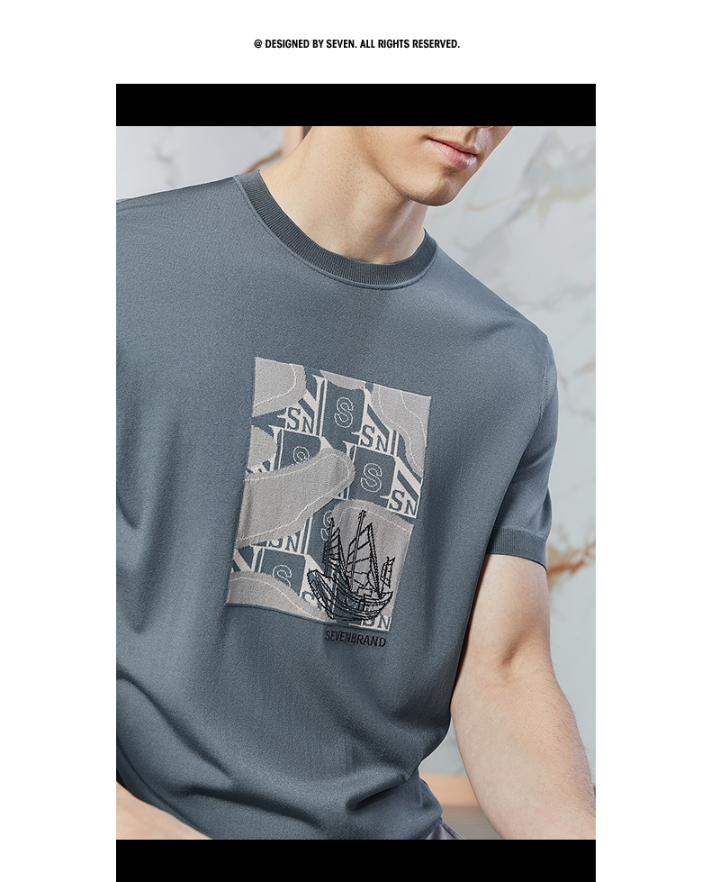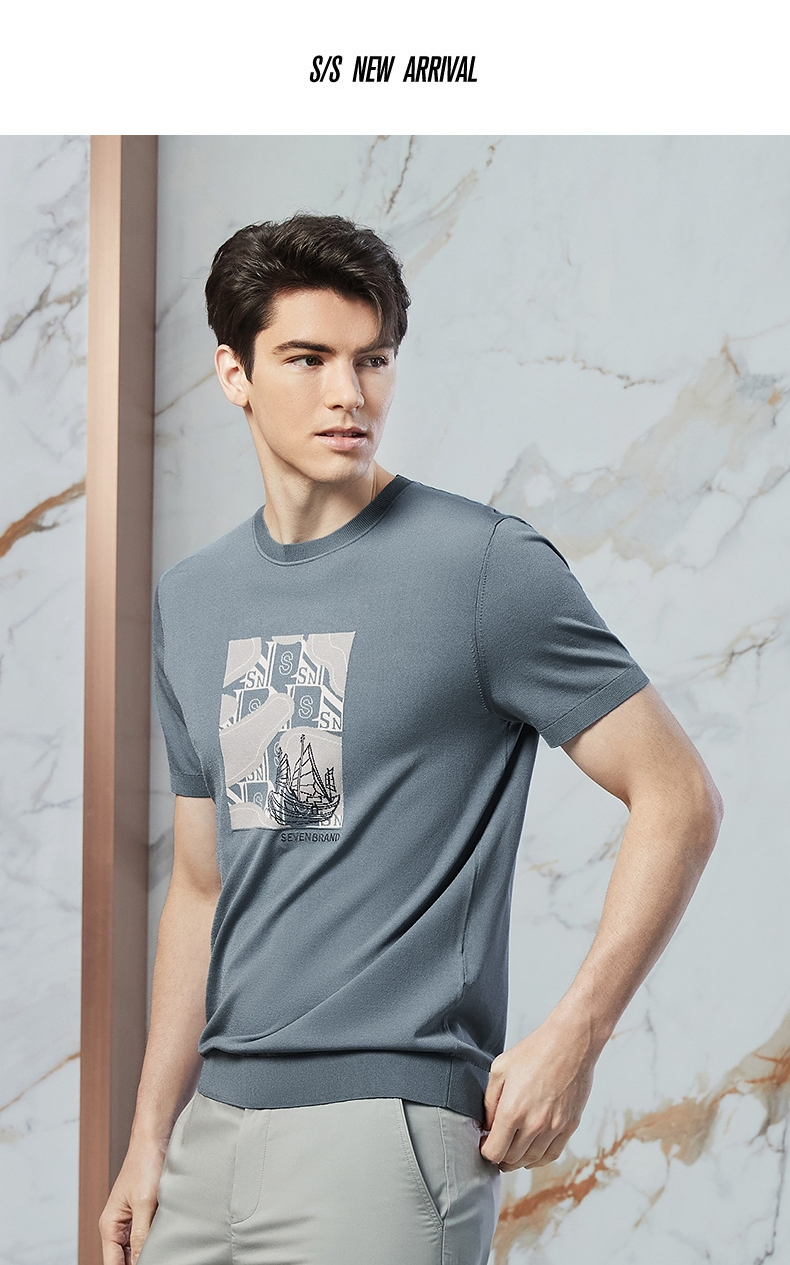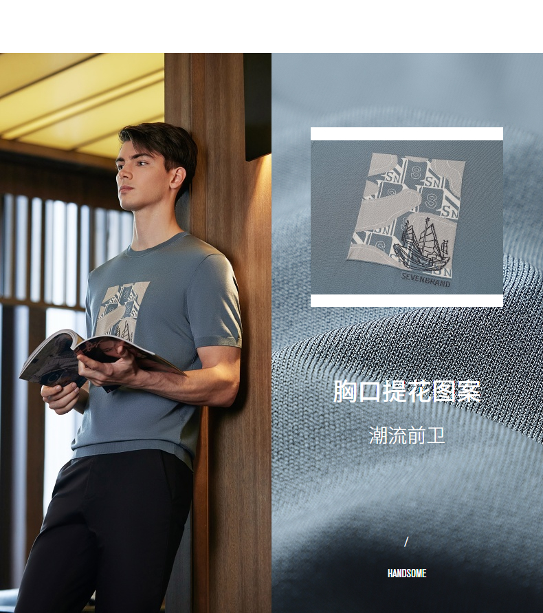 【高端系列】柒牌短袖T恤男夏季新款伊力特透气帆船提花圆领上衣 126T72170