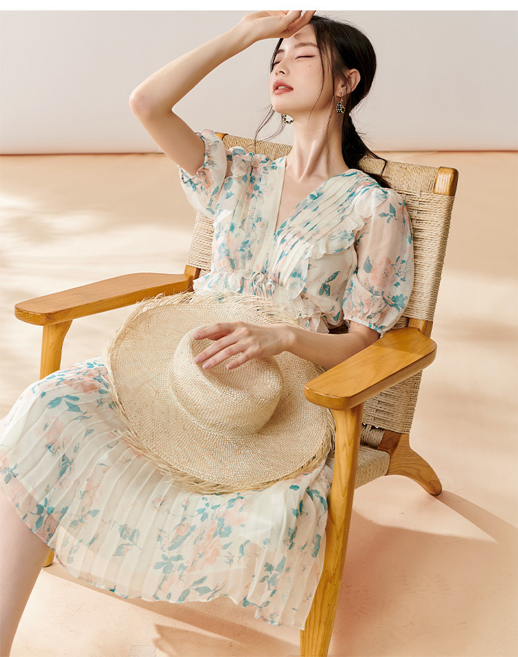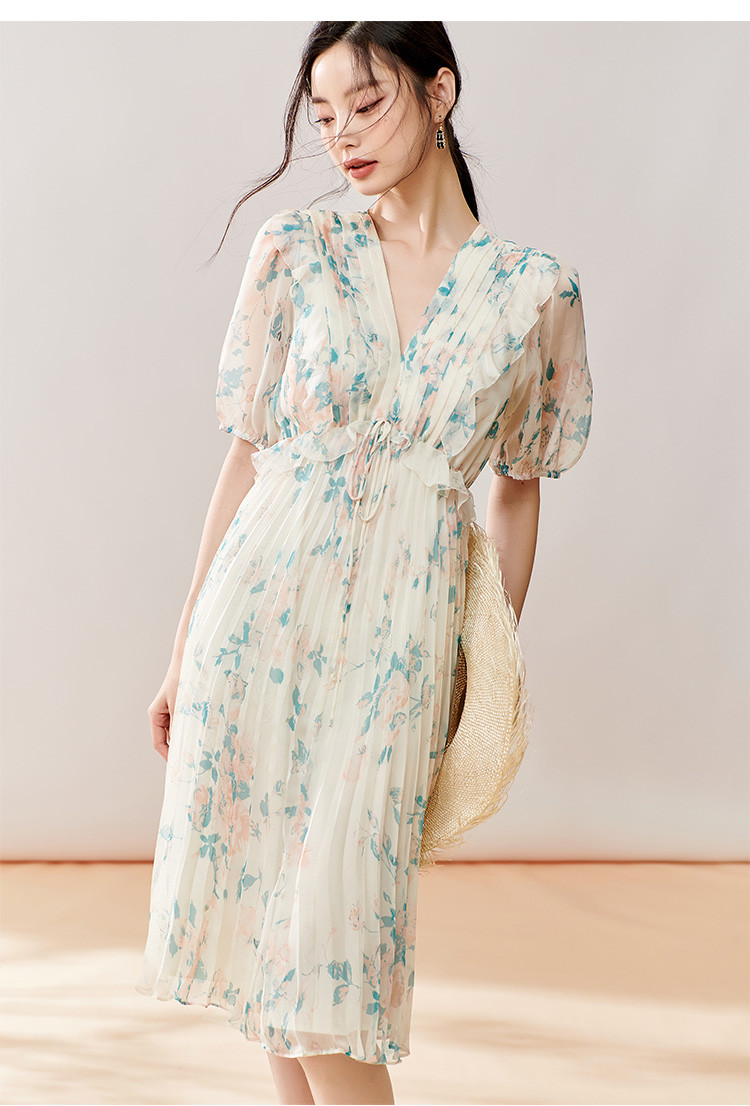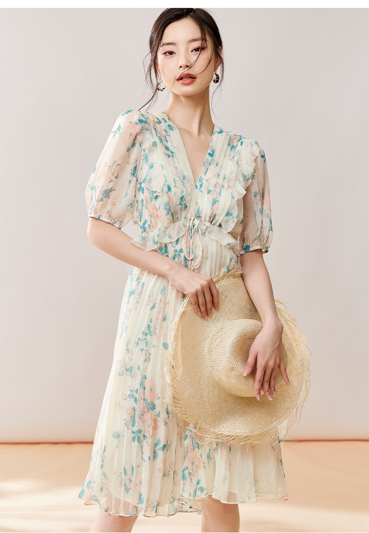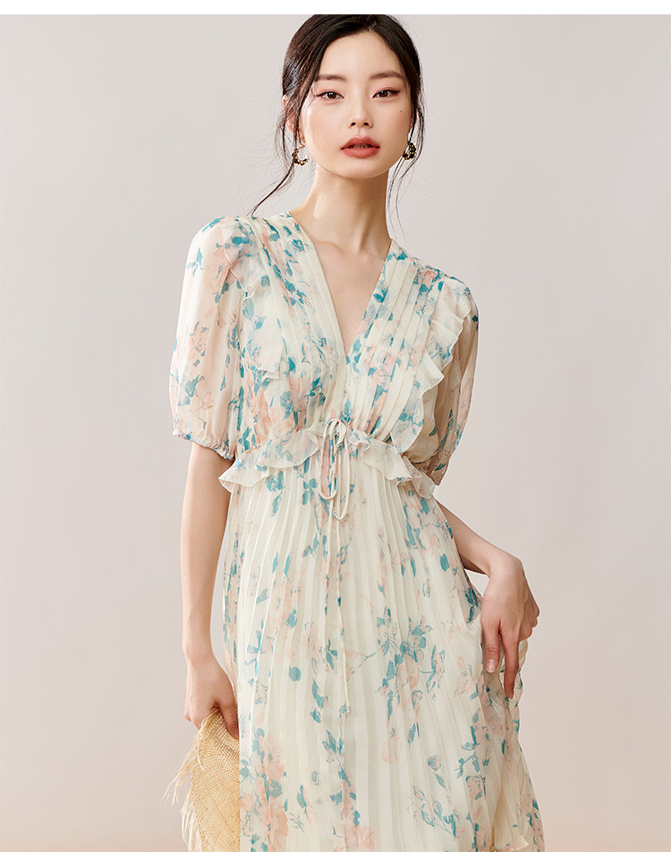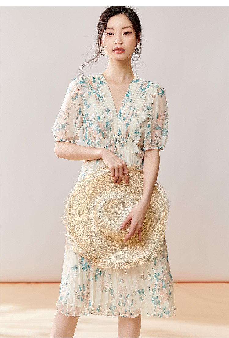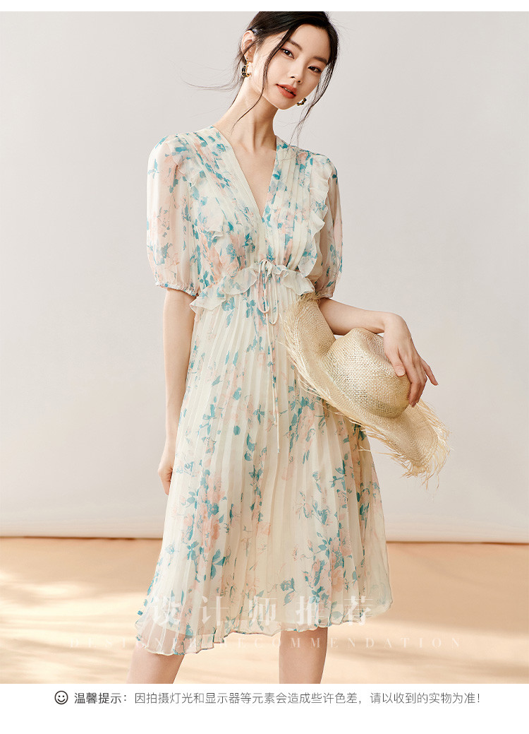 剩S/M 芳外【法式茶歇碎花裙】2025夏季新款V领百褶连衣裙