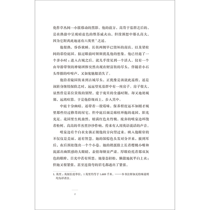 中庭十分幽暗,还带着一股霉味,保养程度远不如刚才城里那些经过修葺的屋宅。但中庭后面是廊柱环抱的花园,阳光充足。花园里生机盎然,植满红色夹竹桃,废弃的喷泉边环绕着松树。高高的草丛里沙沙作响,传来有人用英语说话的声音。