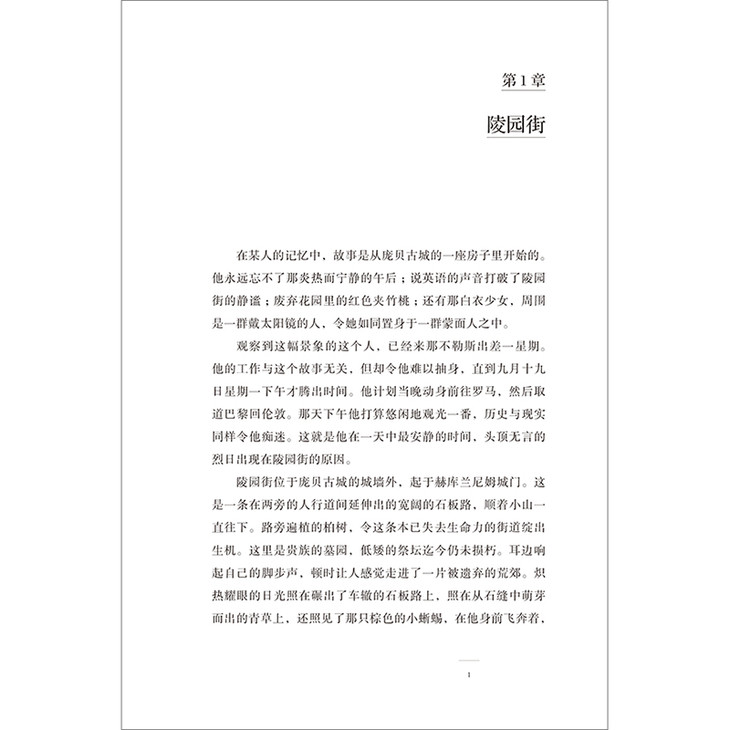 陵园街位于庞贝古城的城墙外,起于赫库兰尼姆城门。这是一条在两旁的人行道间延伸出的宽阔的石板路,顺着小山一直往下。路旁遍植的柏树,令这条本已失去生命力的街道绽出生机。这里是贵族的墓园,低矮的祭坛迄今仍未损朽。耳边响起自己的脚步声,顿时让人感觉走进了一片被遗弃的荒郊。炽热耀眼的日光照在碾出了车辙的石板路上,照在从石缝中萌芽而出的青草上,还照见了那只棕色的小蜥蜴,在他身前飞奔着,化作草丛间一小簇移动的黑影。他的前方,高耸于墓群之后的,是在热浪中呈现暗蓝色的维苏威火山,但没预想中那么高大,因为它距离此地还有六英里之遥。